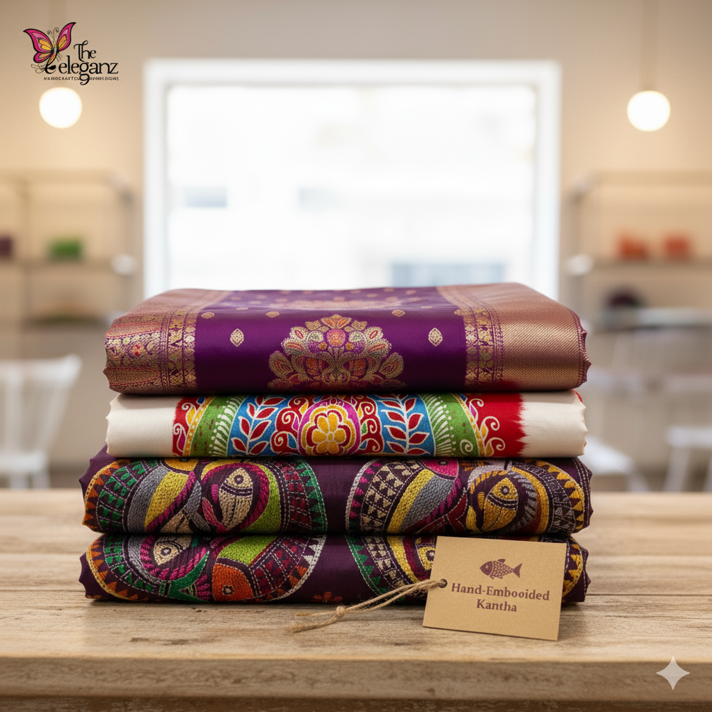 Wrapped in artistry and heritage, she graces the occasion in a Pure Tussar Kantha silk saree from our exquisite Kantha Collection—each thread telling a story of tradition, now cherished anew