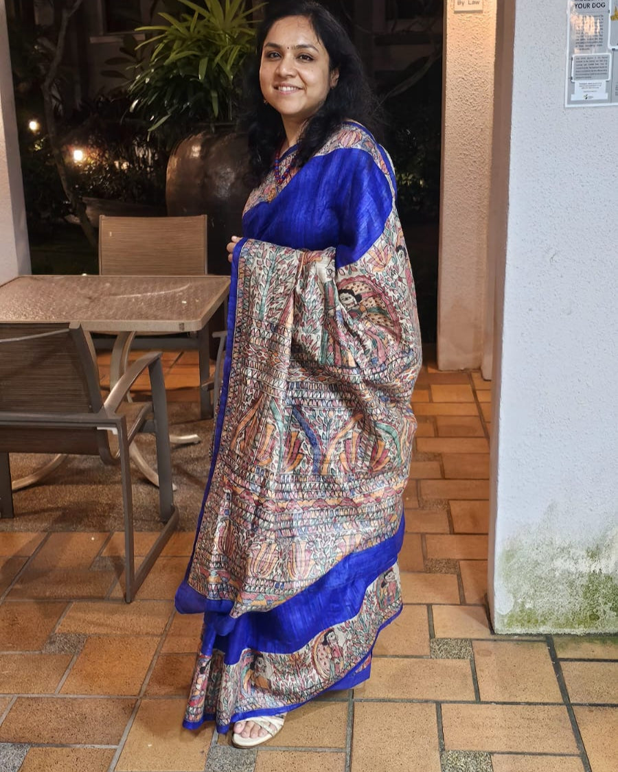 Adorned in timeless tales and vibrant colors, she shines in this Pure Gachi Tussar saree—each brushstroke of Madhubani art turning tradition into a masterpiece she now calls her own