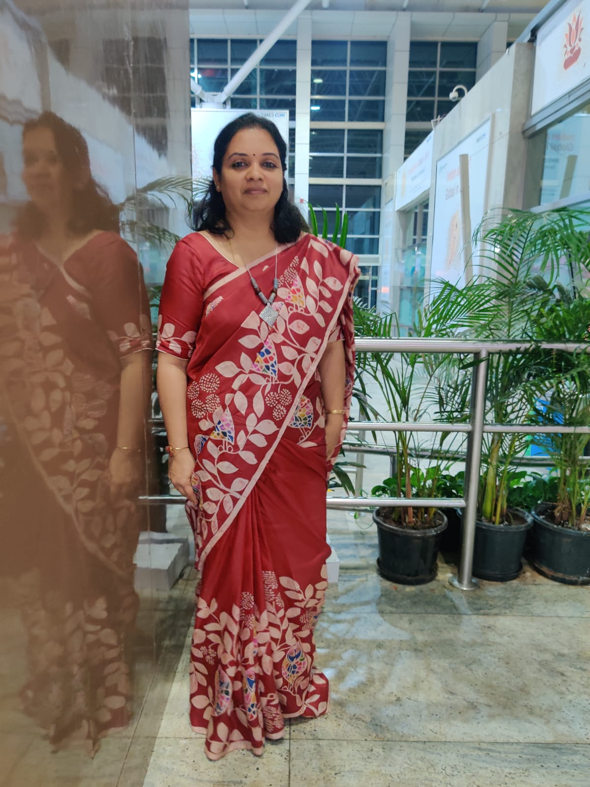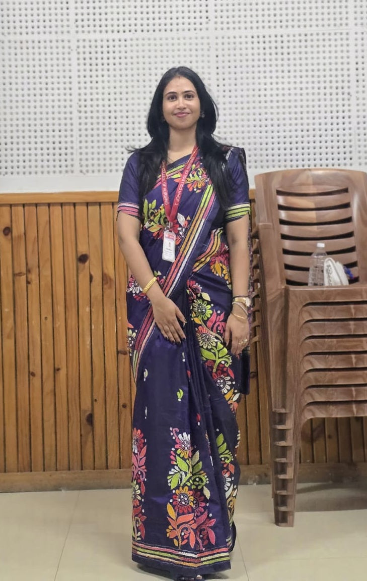 Gracefully adorned in a Pure Batik silk saree, she carries the artistry of hand-drawn motifs—where each fluid pattern whispers tales of tradition and elegance, uniquely hers for every moment