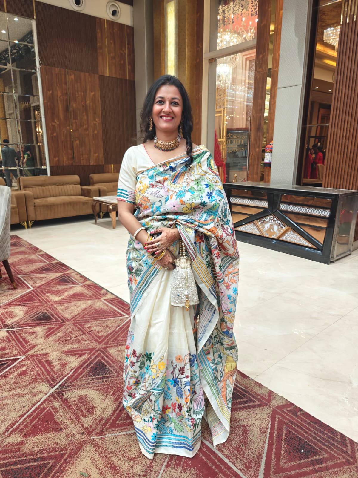 Wrapped in artistry and heritage, she graces the occasion in a Pure Tussar Kantha silk saree from our exquisite Kantha Collection—each thread telling a story of tradition, now cherished anew