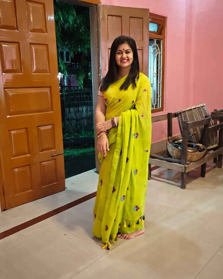 Effortlessly elegant in a breezy Mulcotton saree, she celebrates comfort and charm—each thread light as air, each colour reflecting the joy of simple, natural beauty