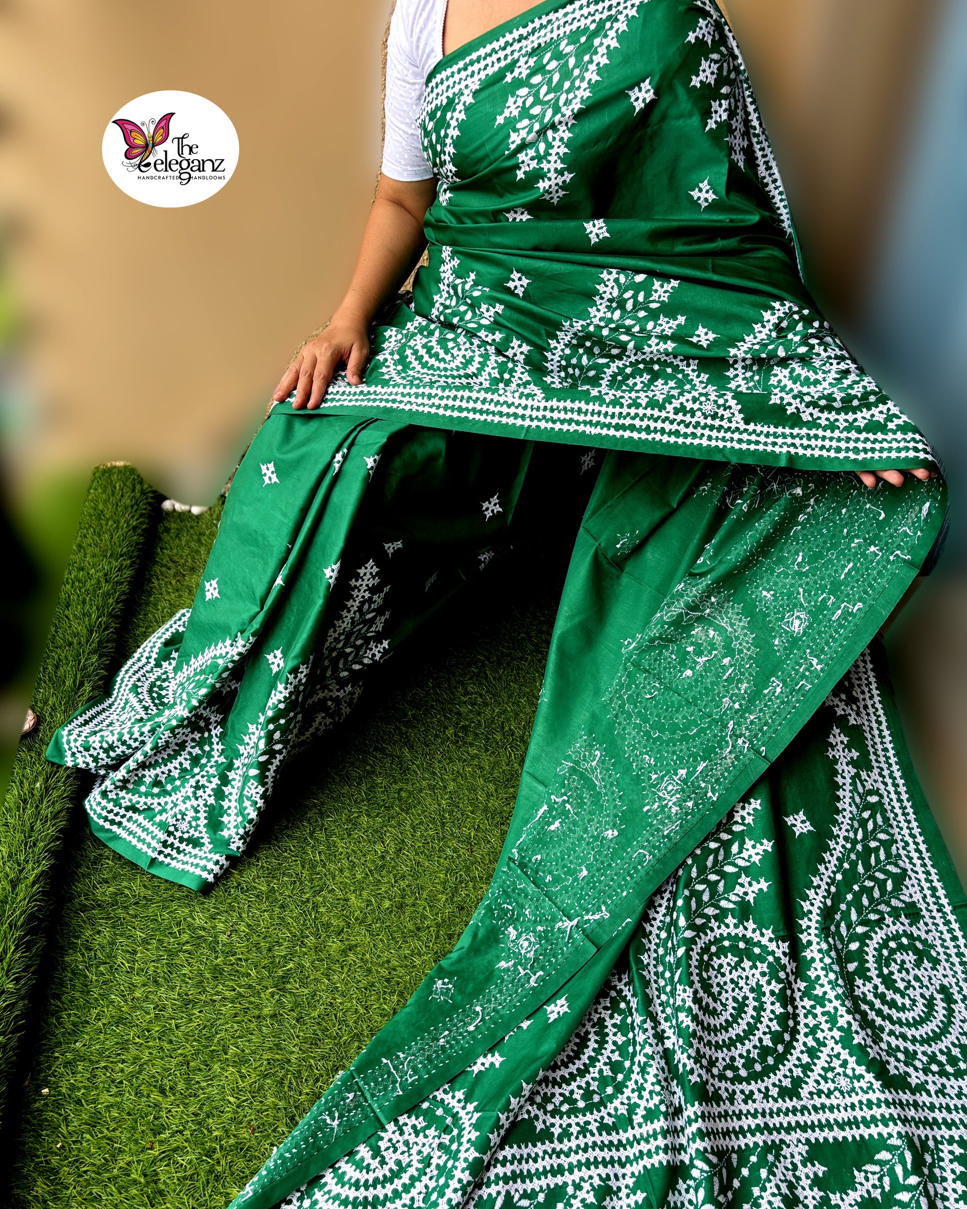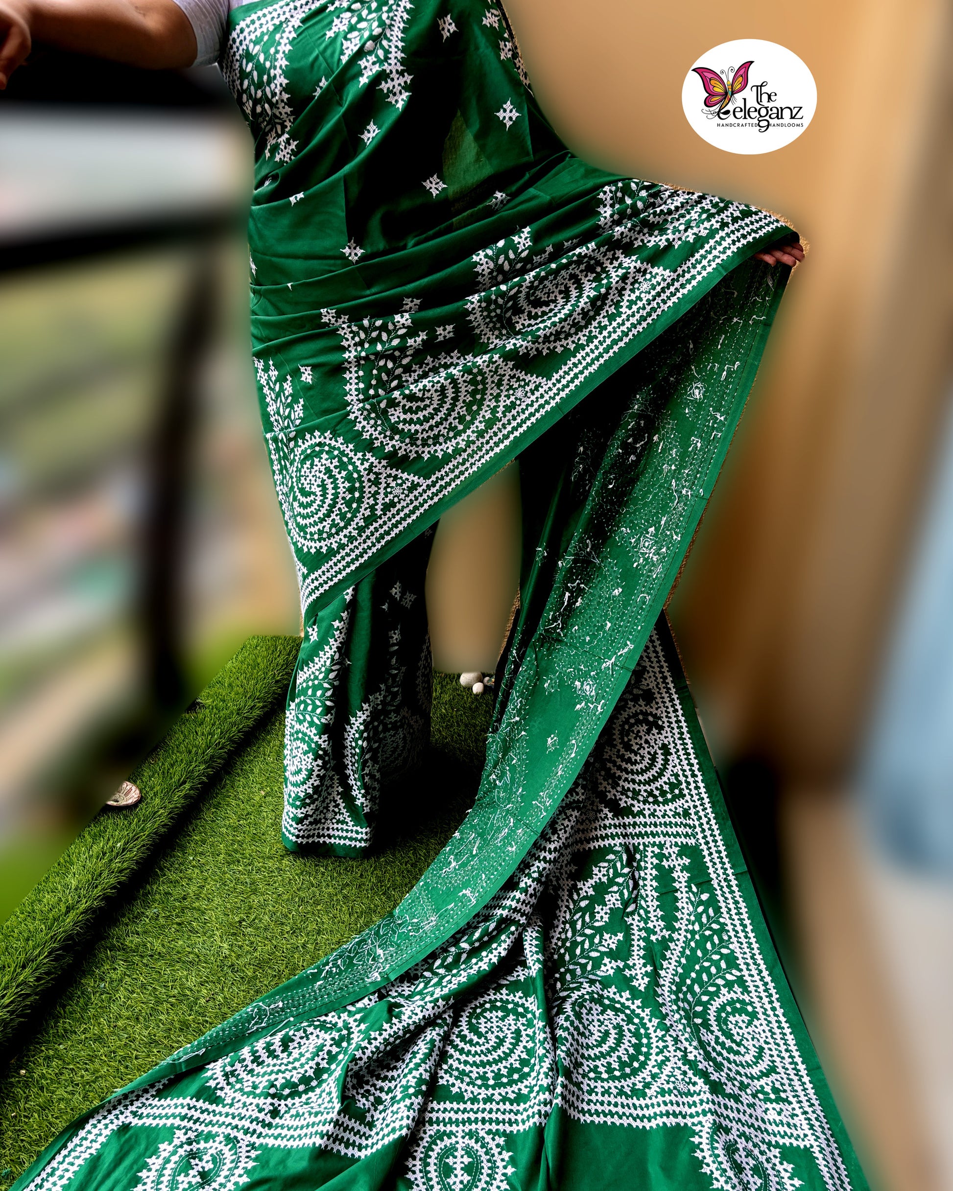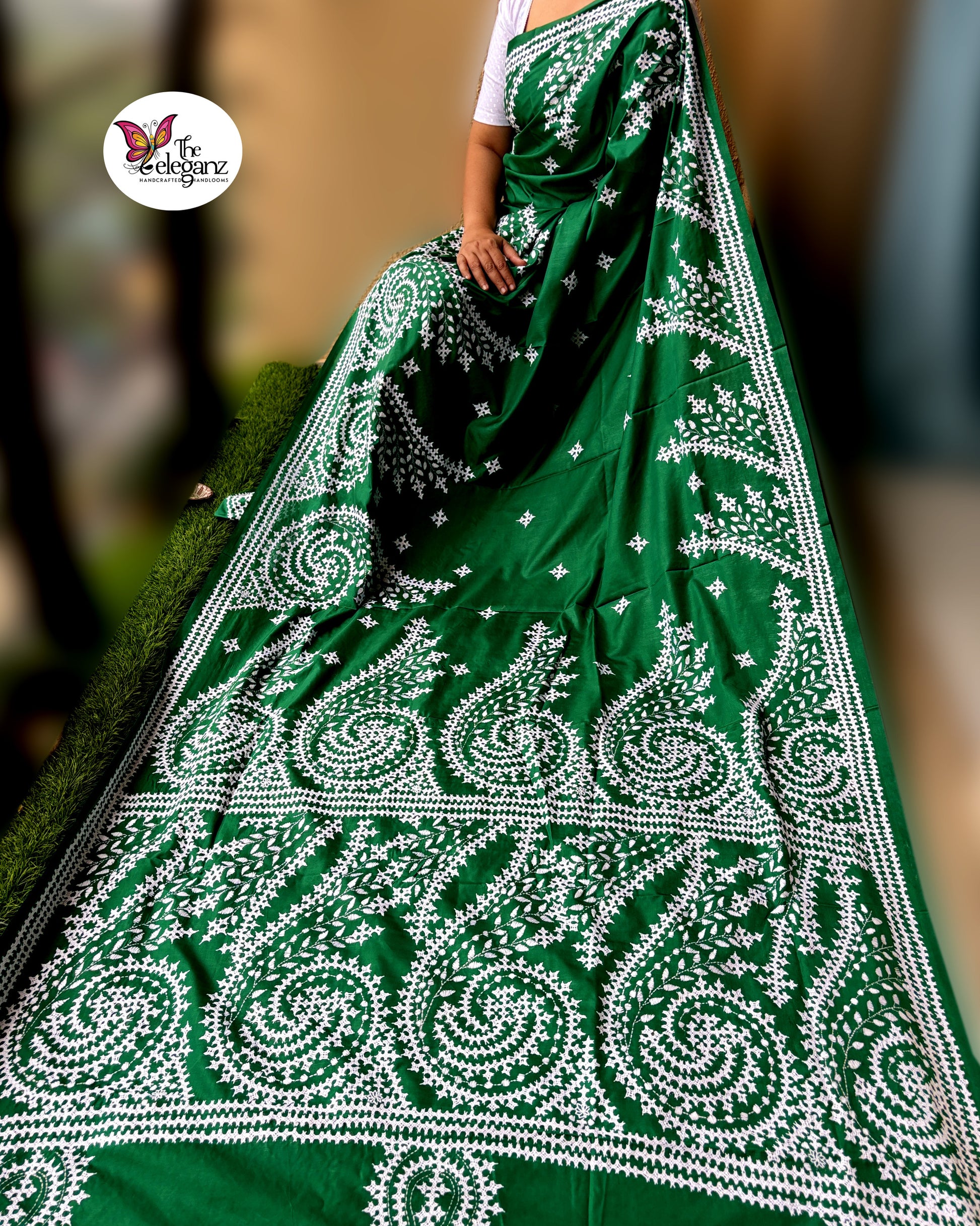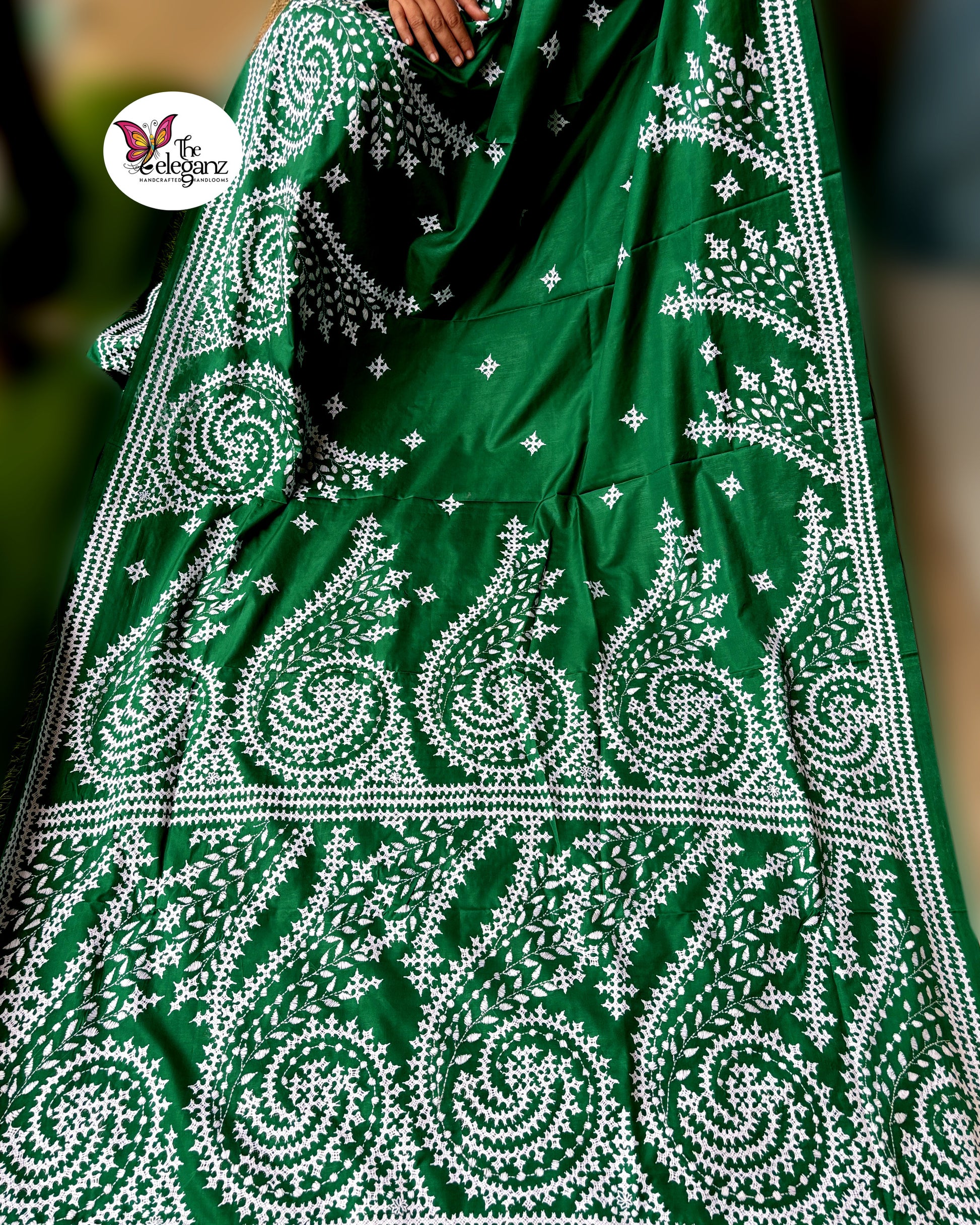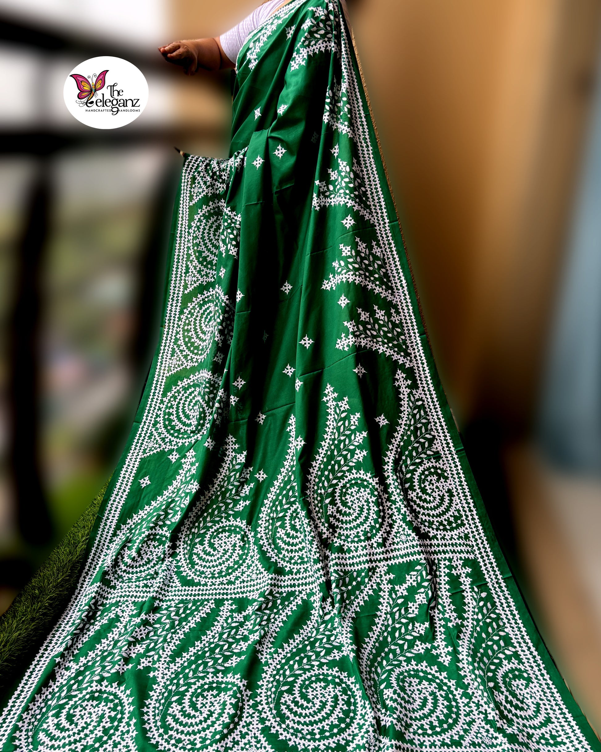 Like the rhythmic patterns of an artisan’s brush, Alpona weaves celebration into every curve and swirl. The deep green canvas comes alive with intricate white Gujarati stitch work — reminiscent of traditional alpona motifs that adorn festive floors and temple courtyards. A saree that embodies artistry, devotion, and timeless charm.