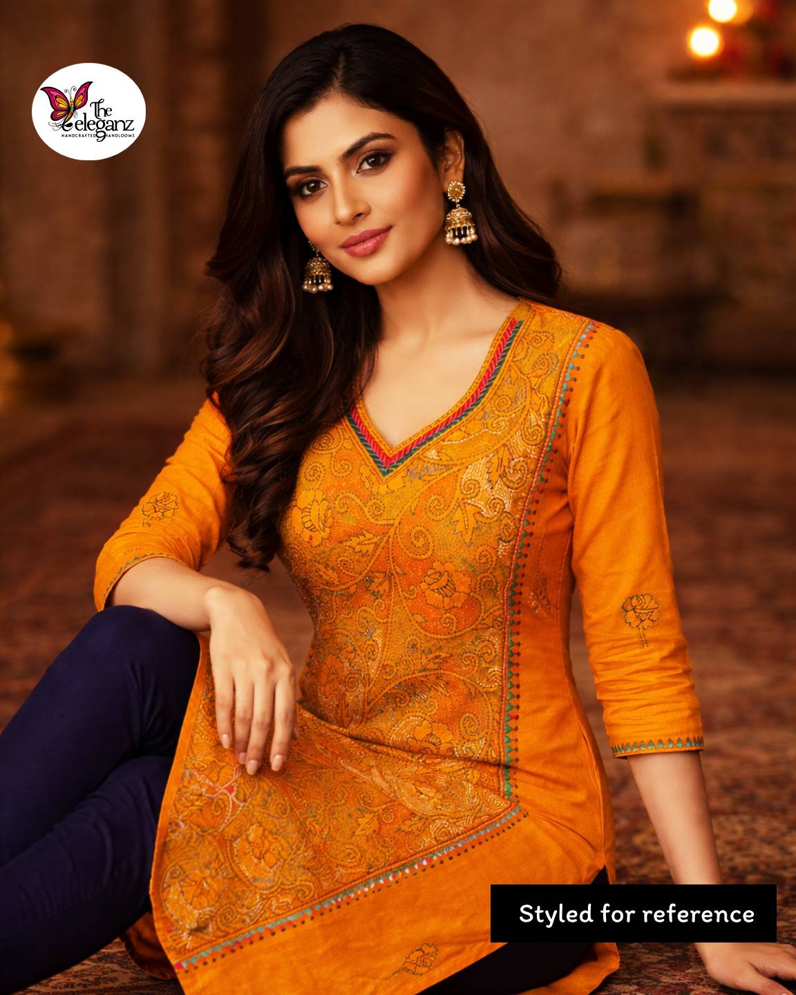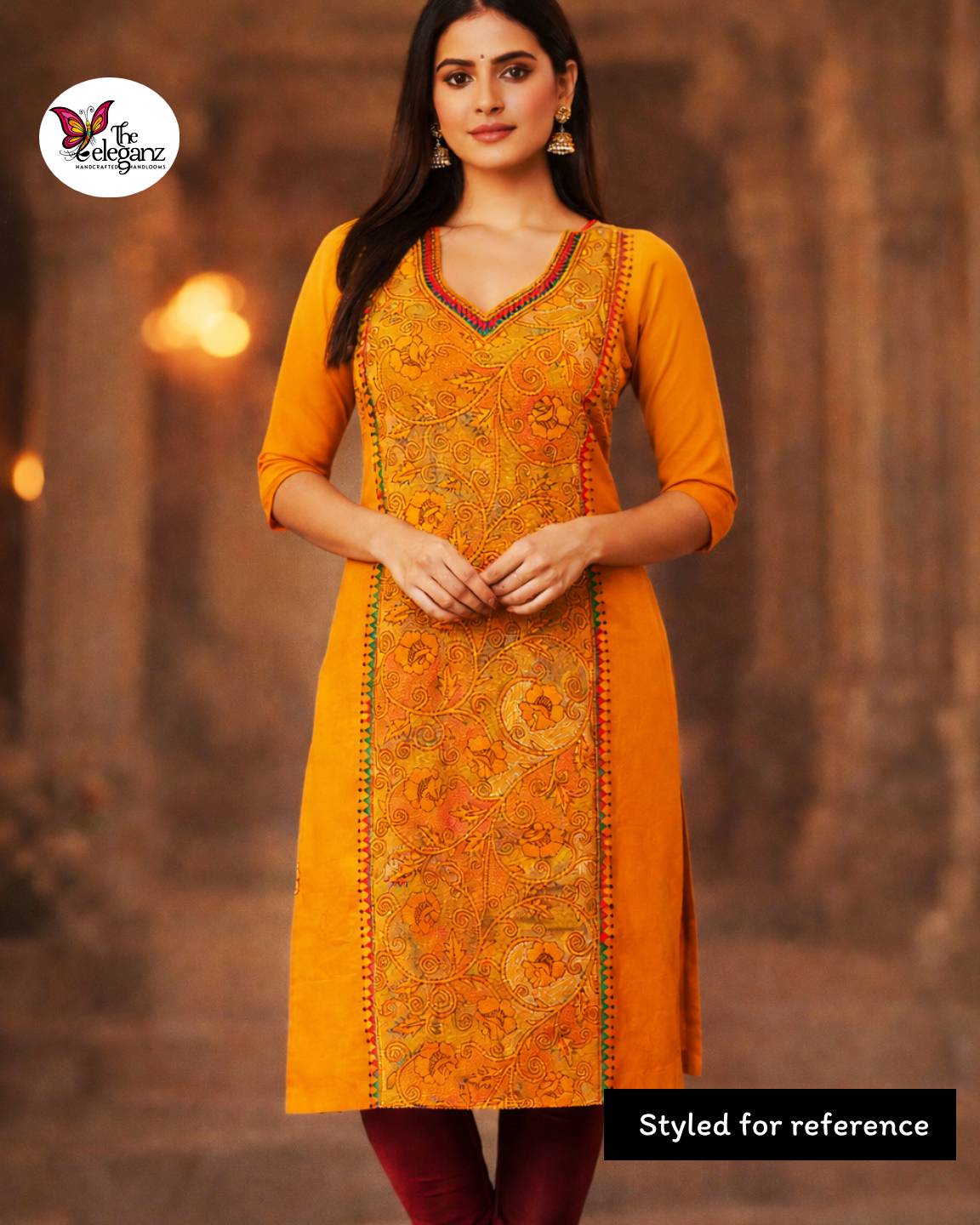 Radiating warmth and celebration, this mustard Kantha suit piece is a tribute to timeless floral artistry. The intricate hand-stitched vines and blossoms flow gracefully across the central panel, creating a rich tapestry of texture and detail.