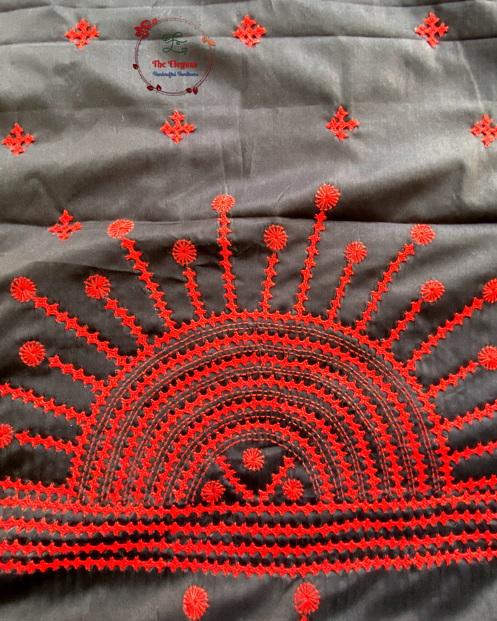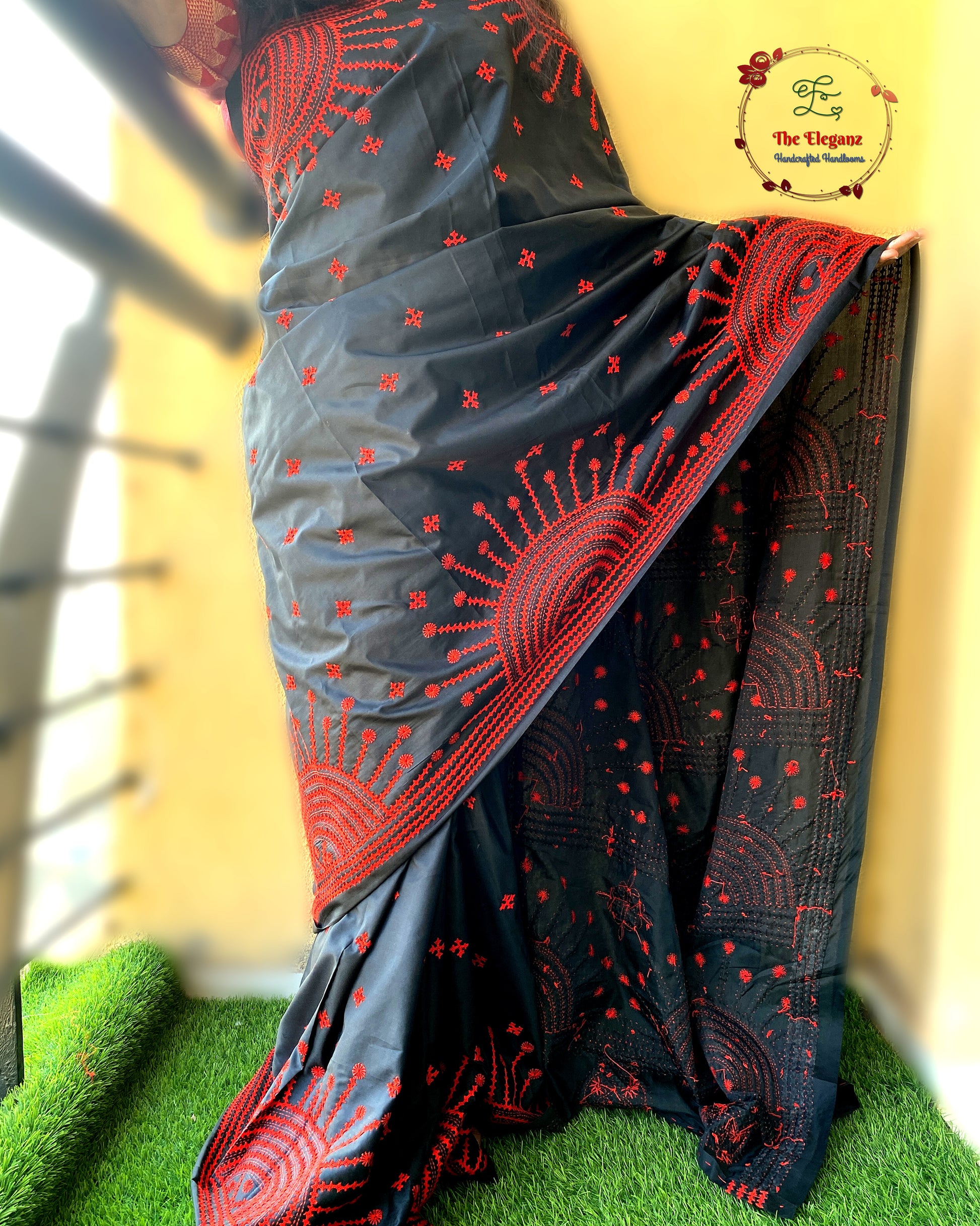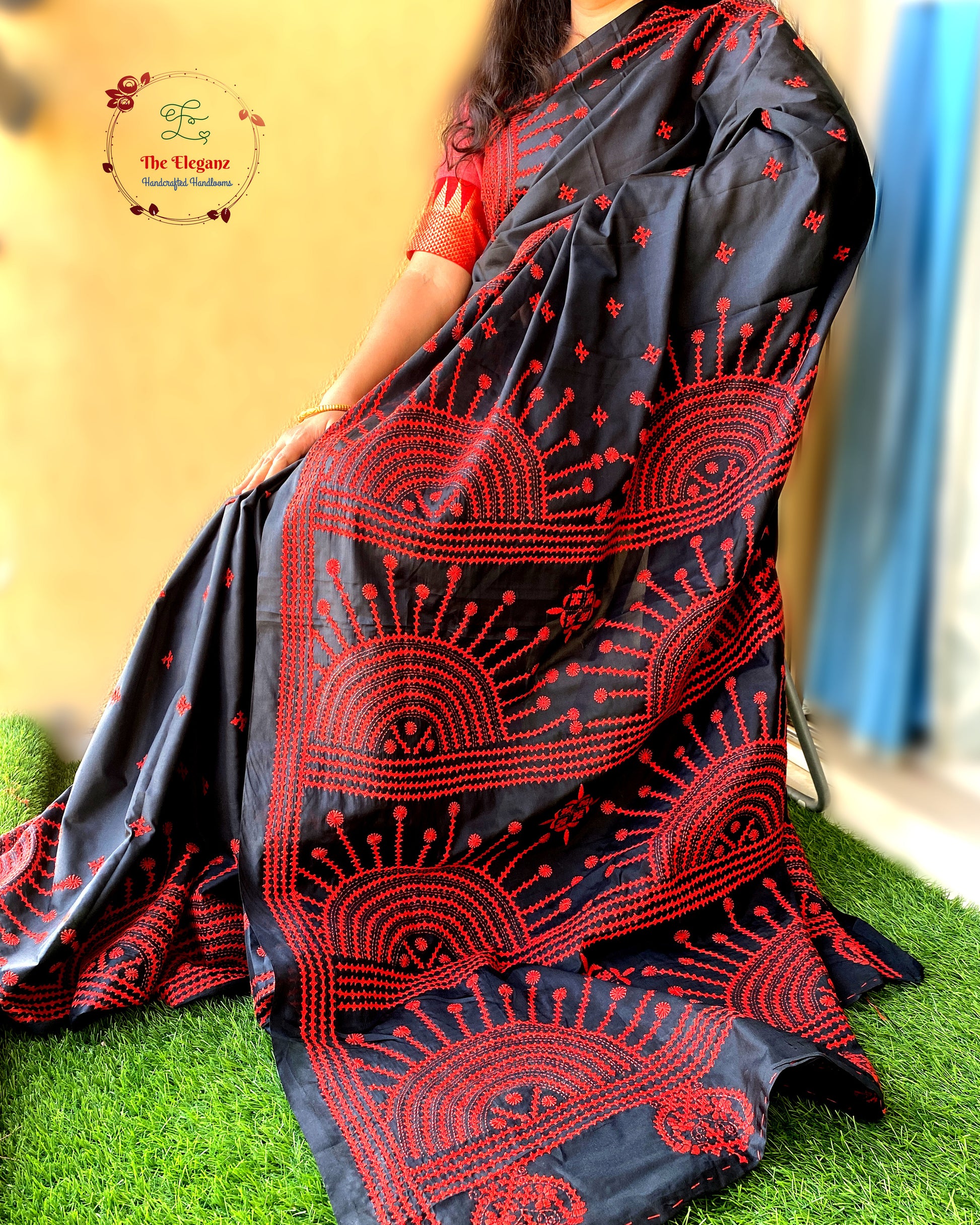 Midnight black drape kissed by radiant red Kantha stitches, like the first rays of dawn breaking through the horizon. A tale of warmth, strength, and eternal tradition.