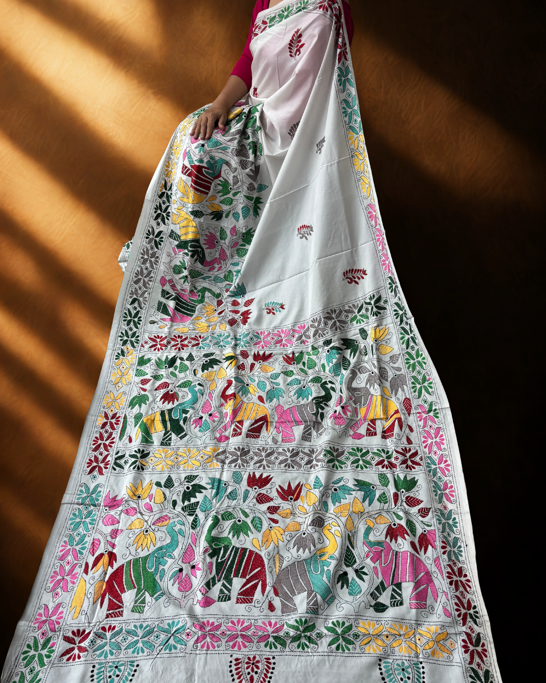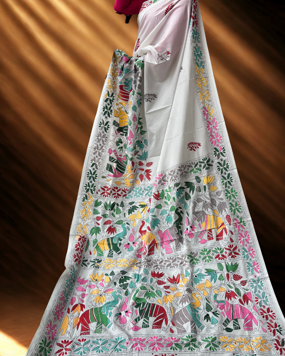 White expanse lined with colourful, decorated elephants, celebrating heritage and royal grace.