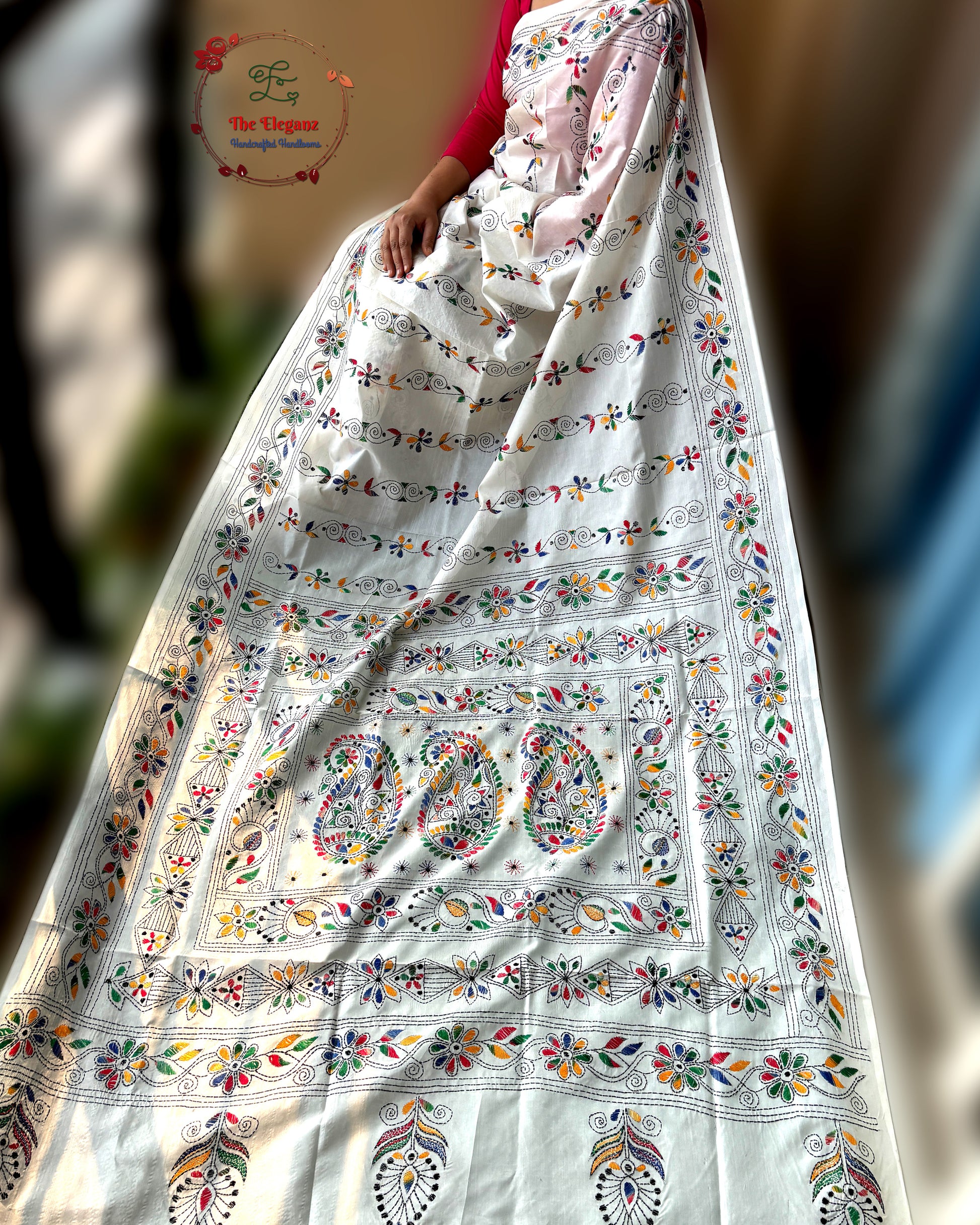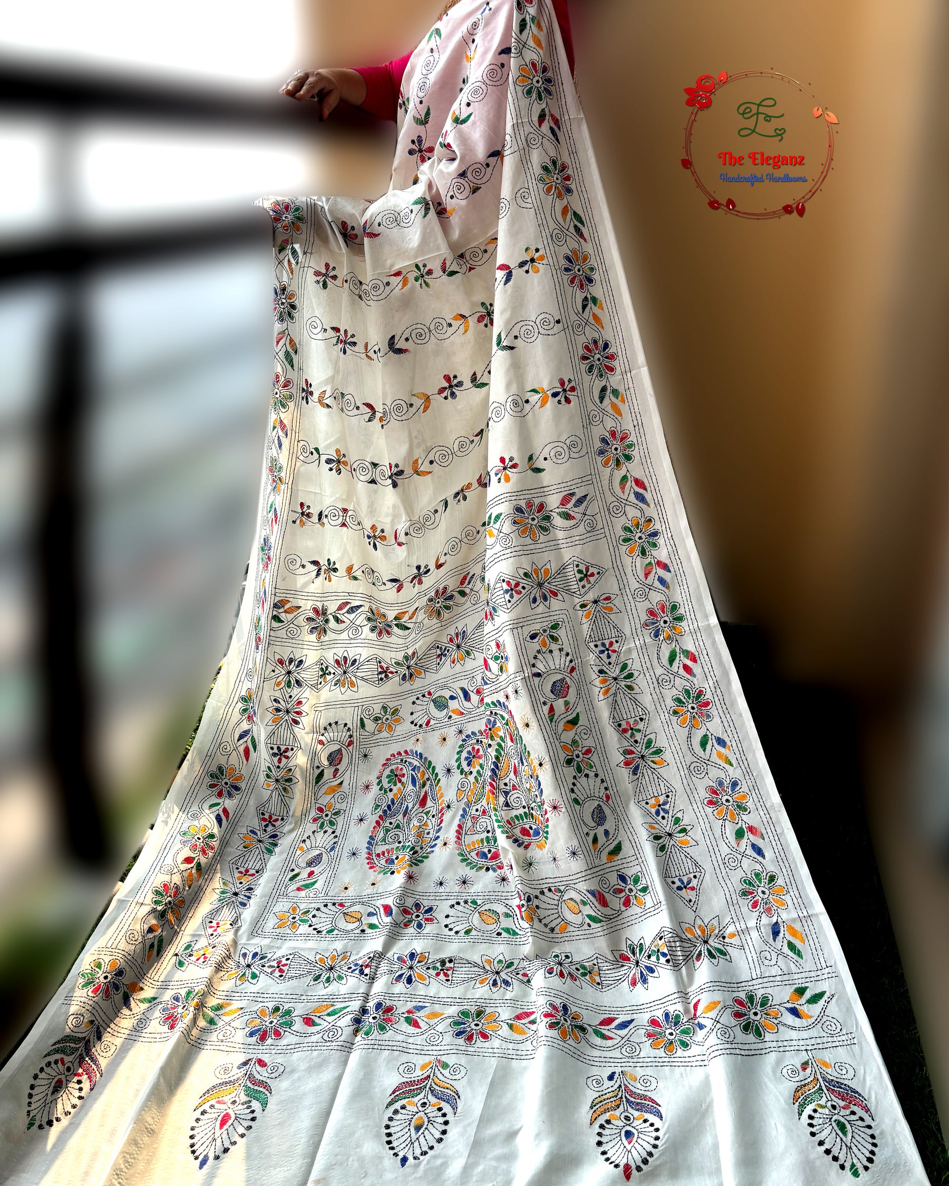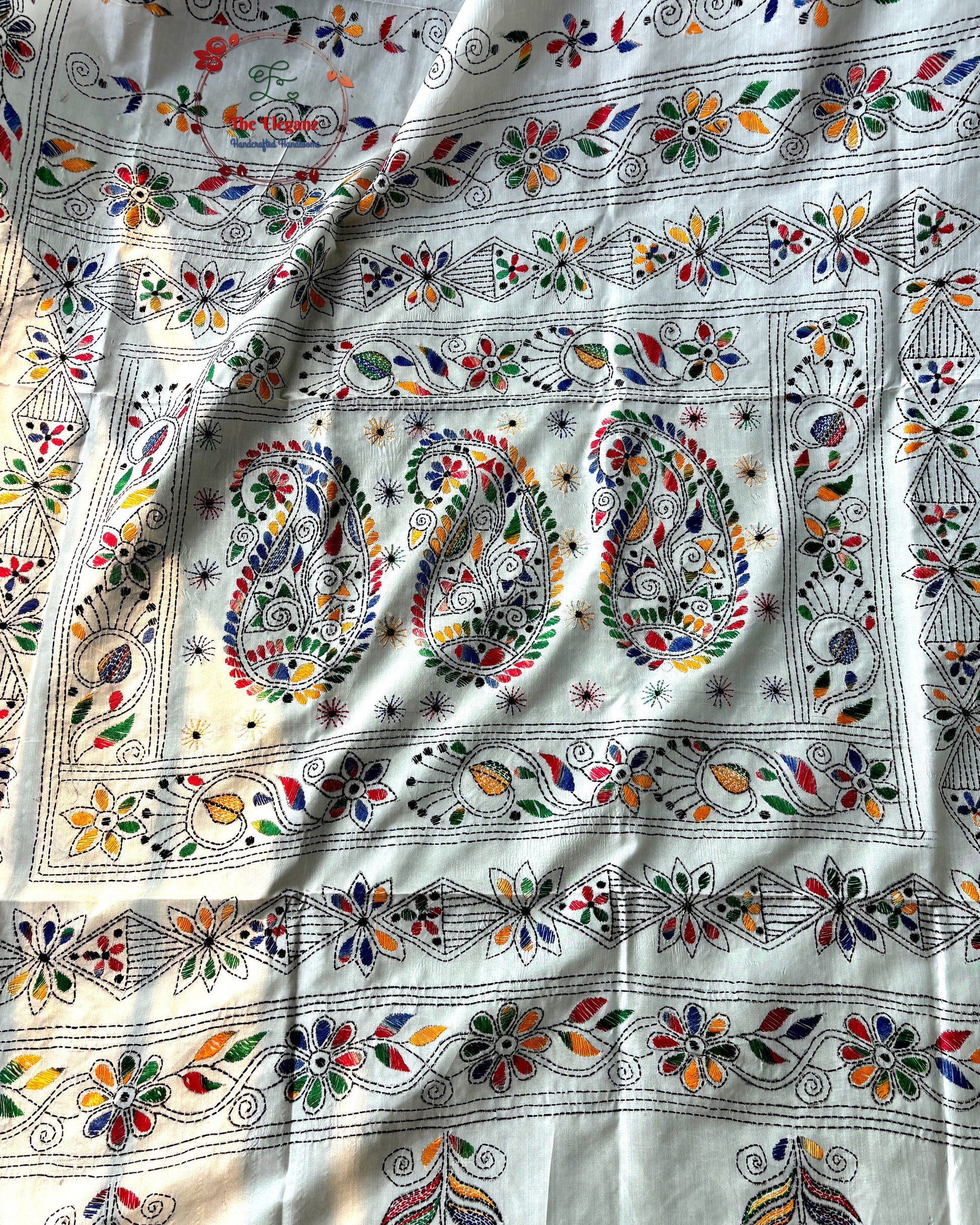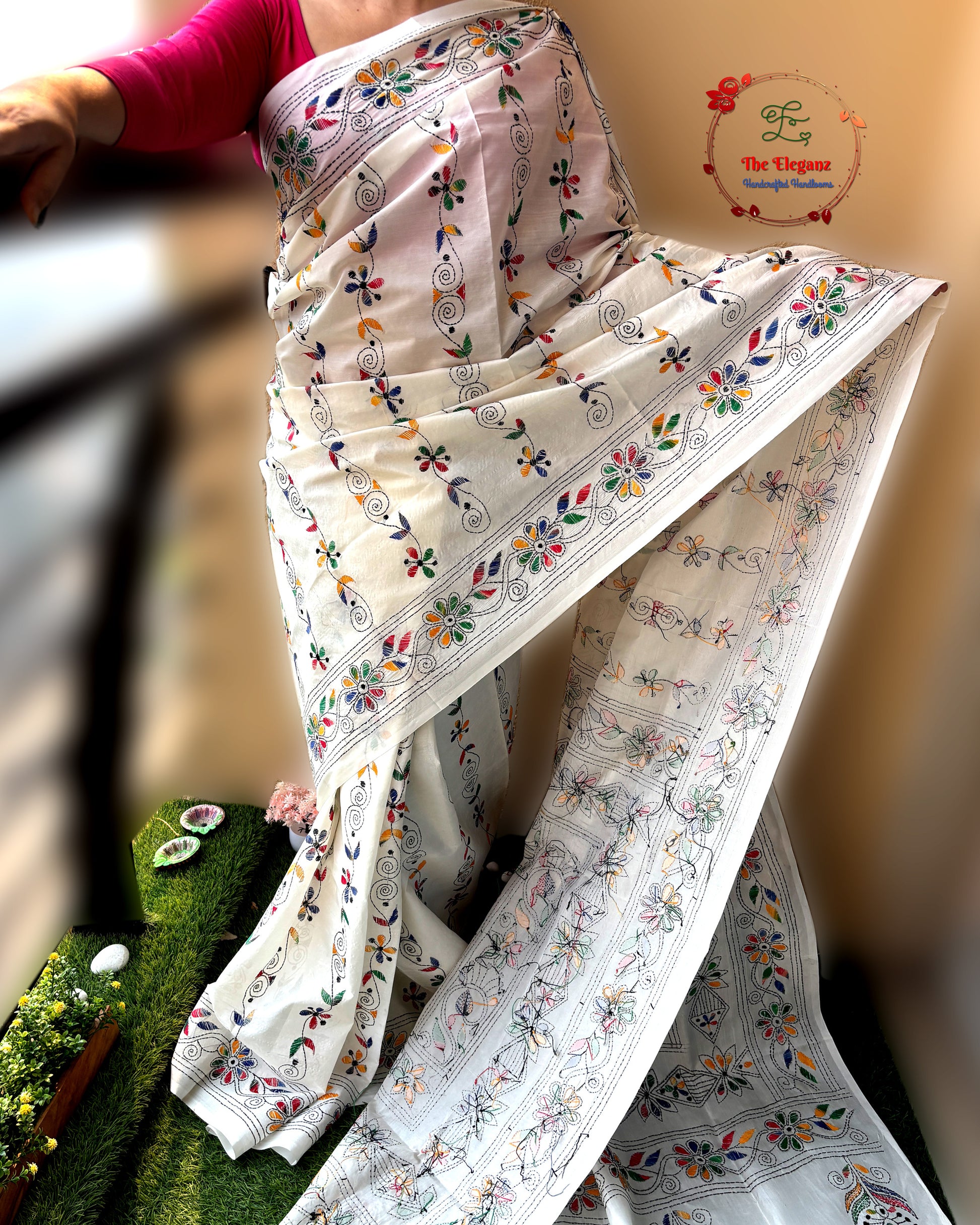 A blooming garden on white, where multi-coloured flowers dance in stitches, celebrating life’s abundant beauty.