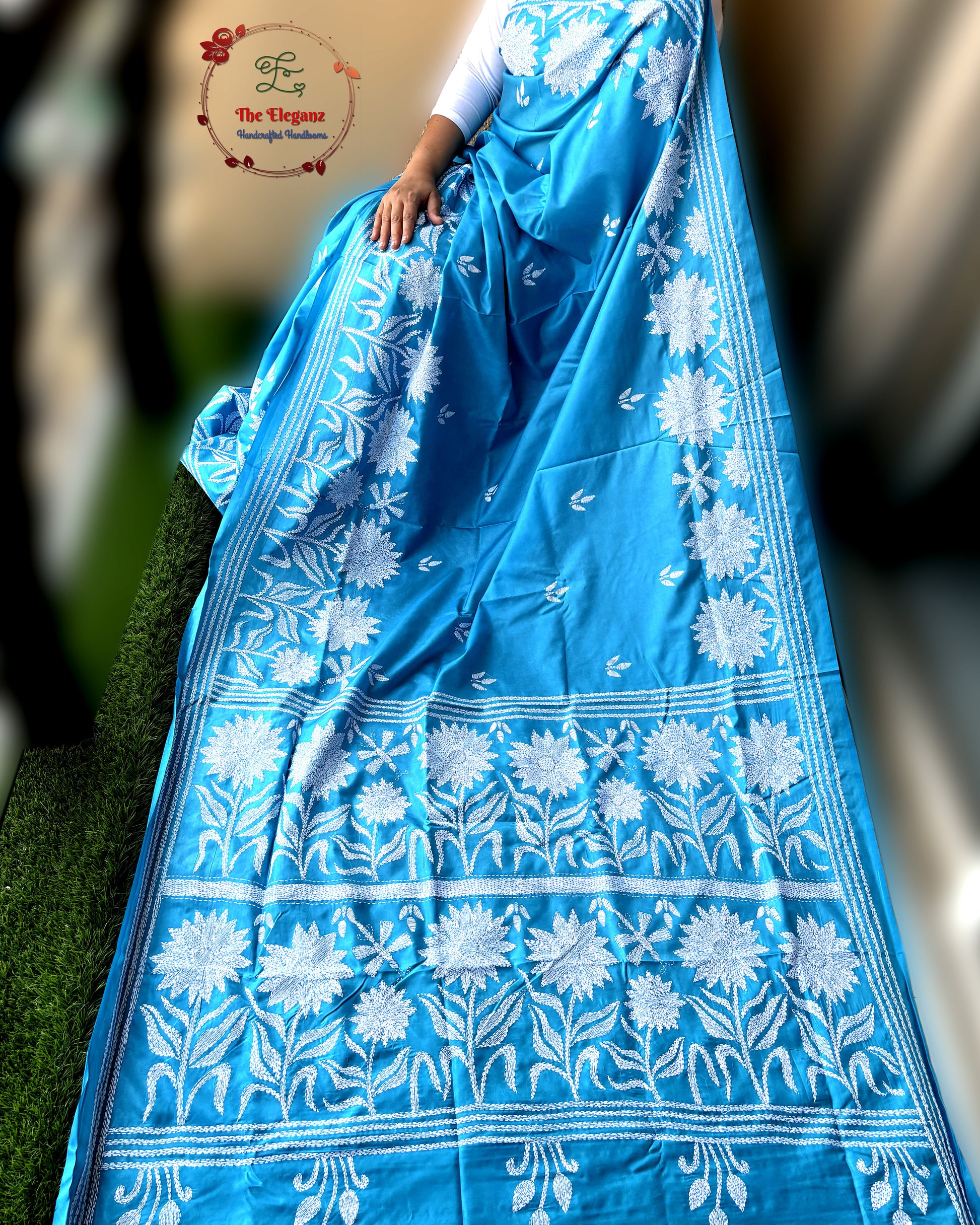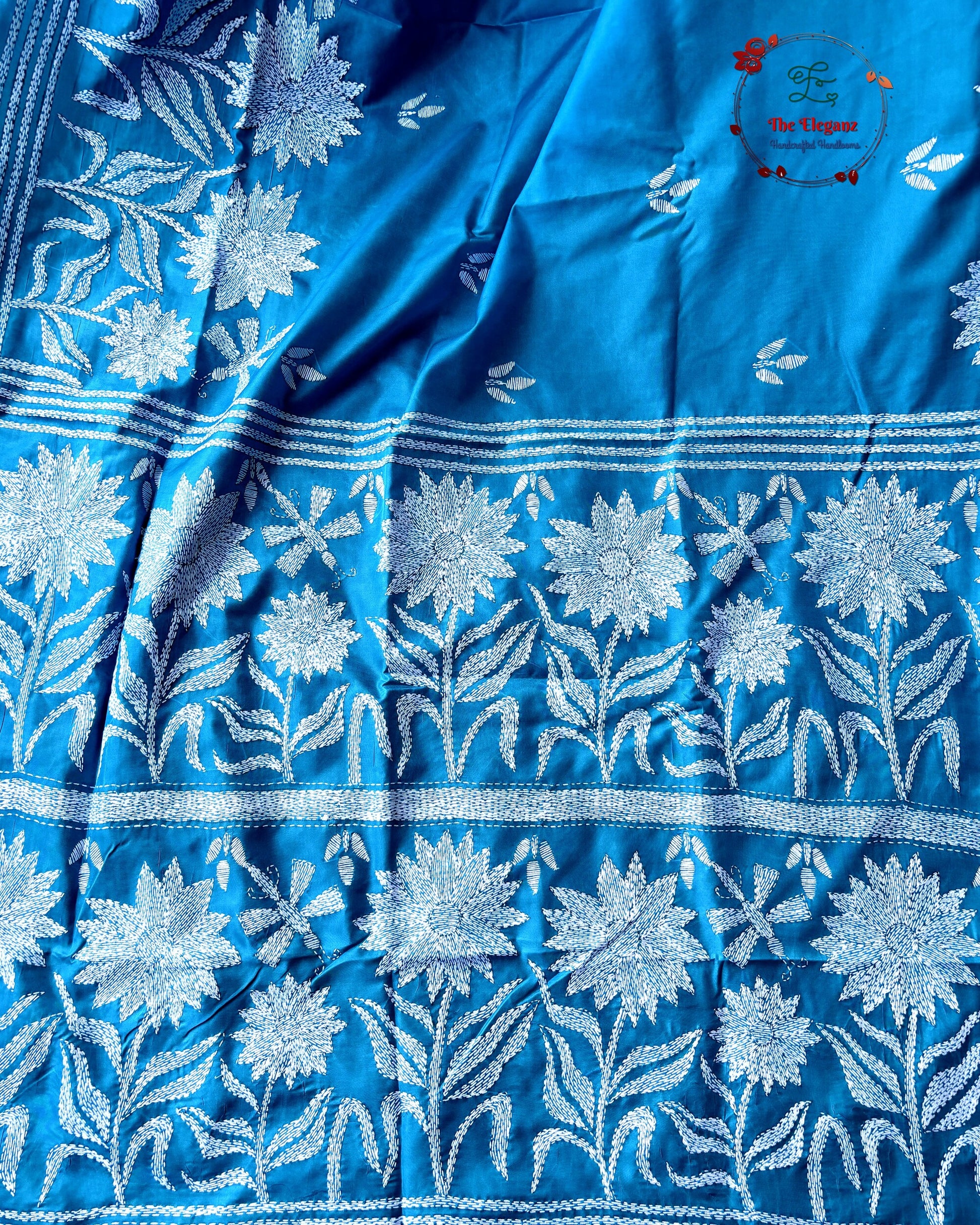 Sky-blue expanse blooming with white lotuses, each stitch reflecting serenity and the stillness of a tranquil pond.