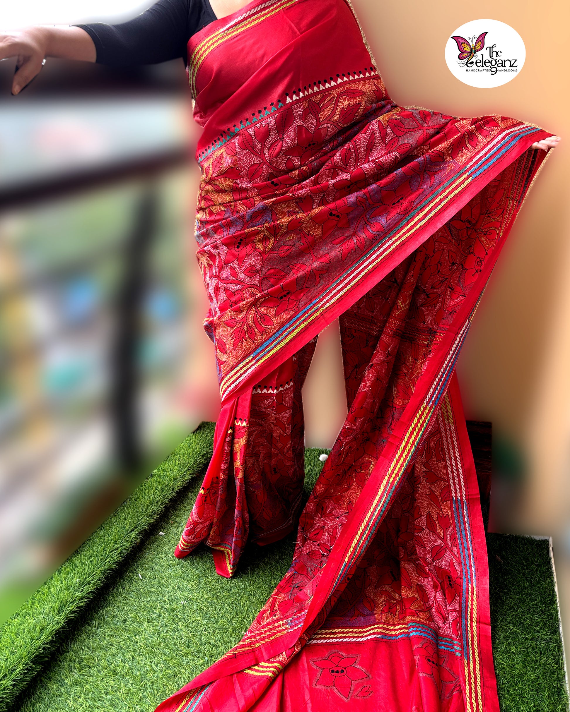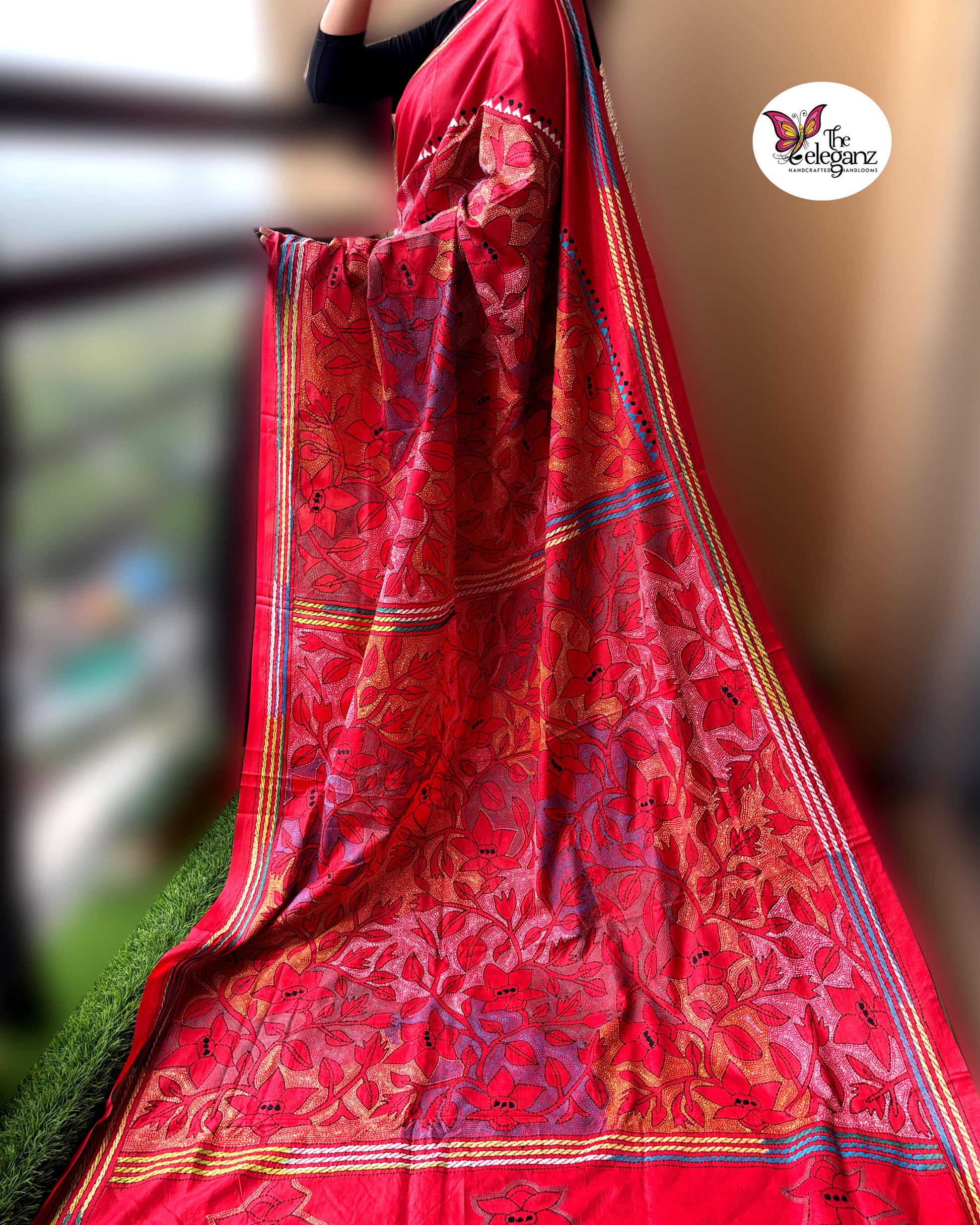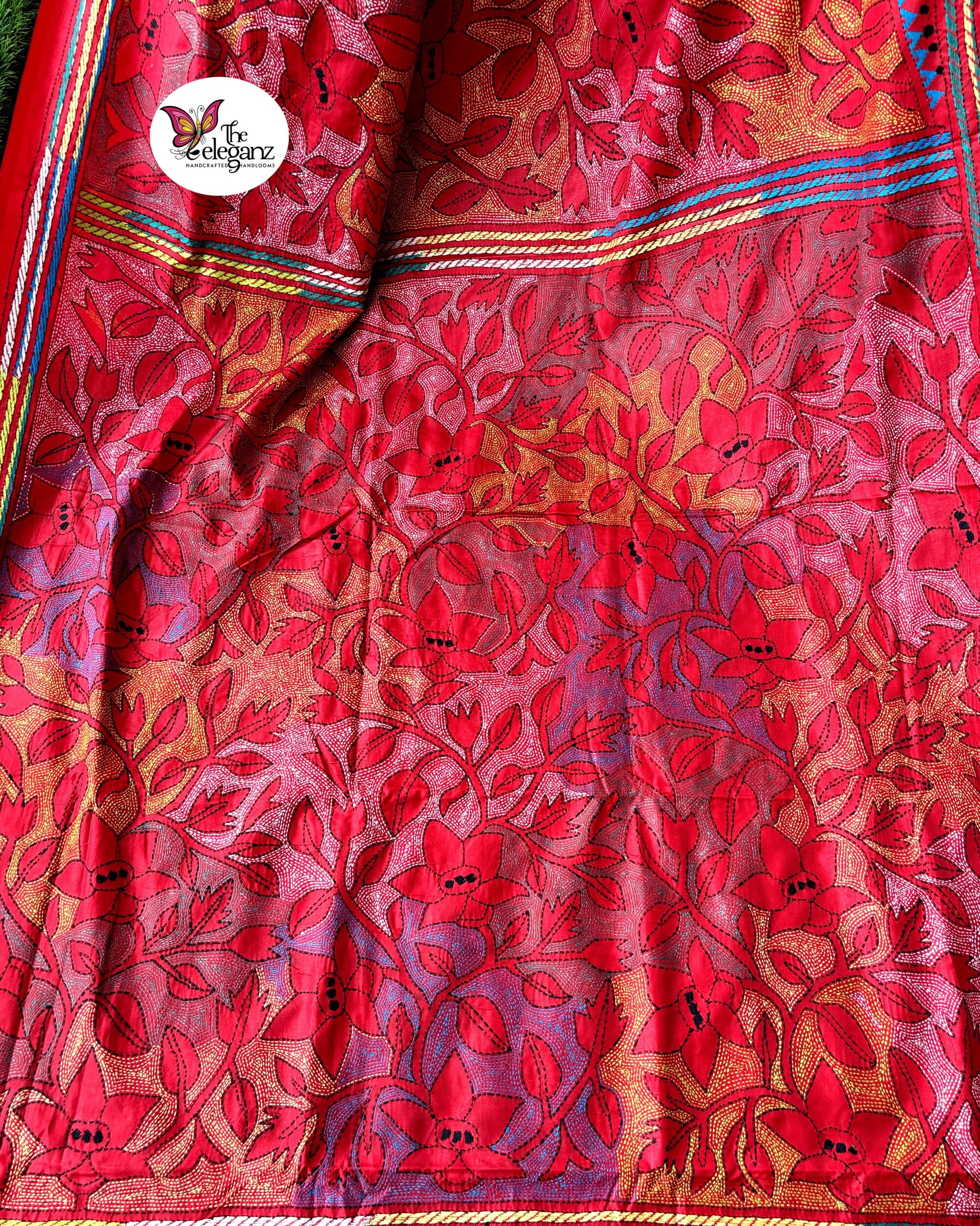 Vibrant red brought alive with golden-yellow and purple reverse Kantha stitches, radiating festive grandeur.