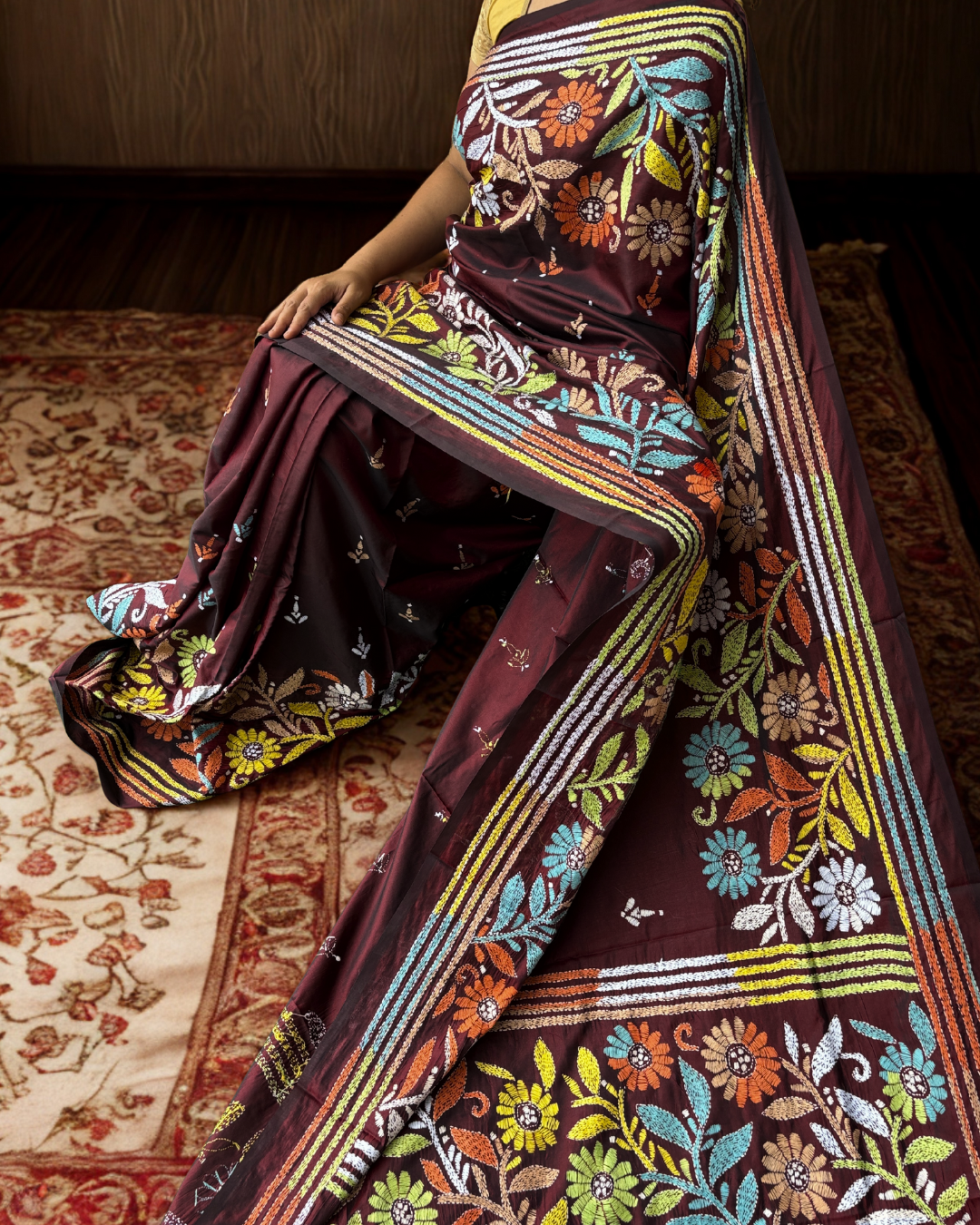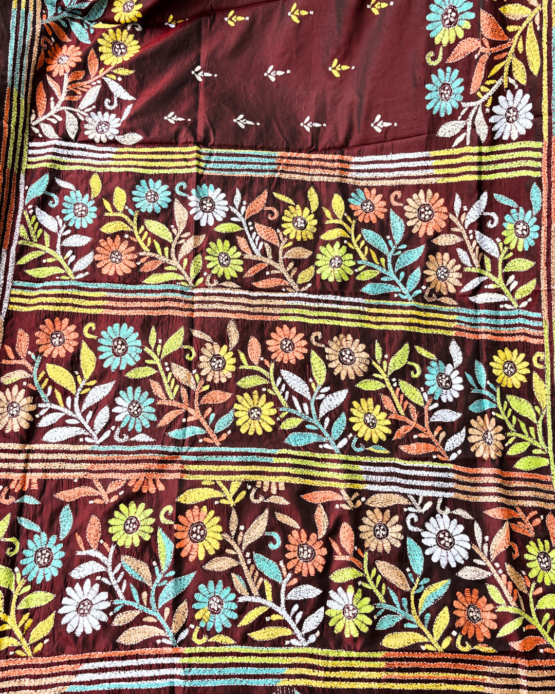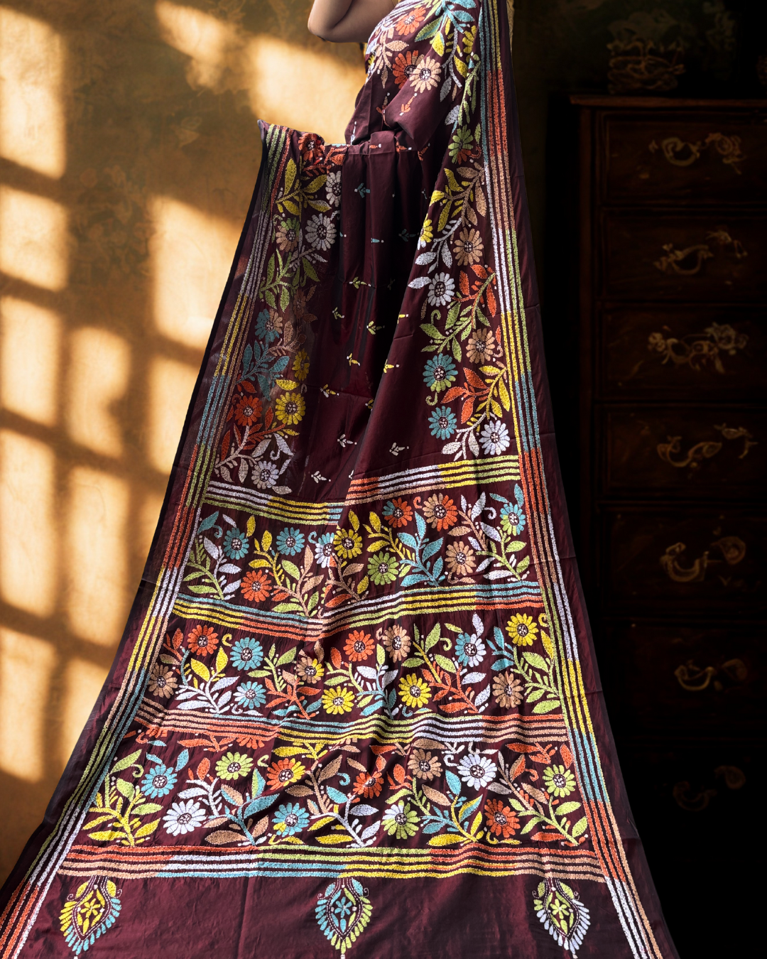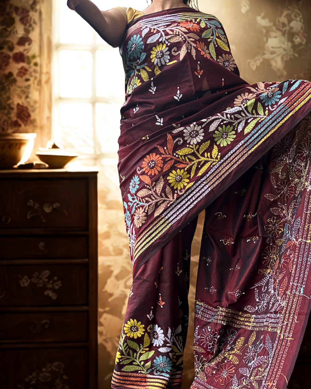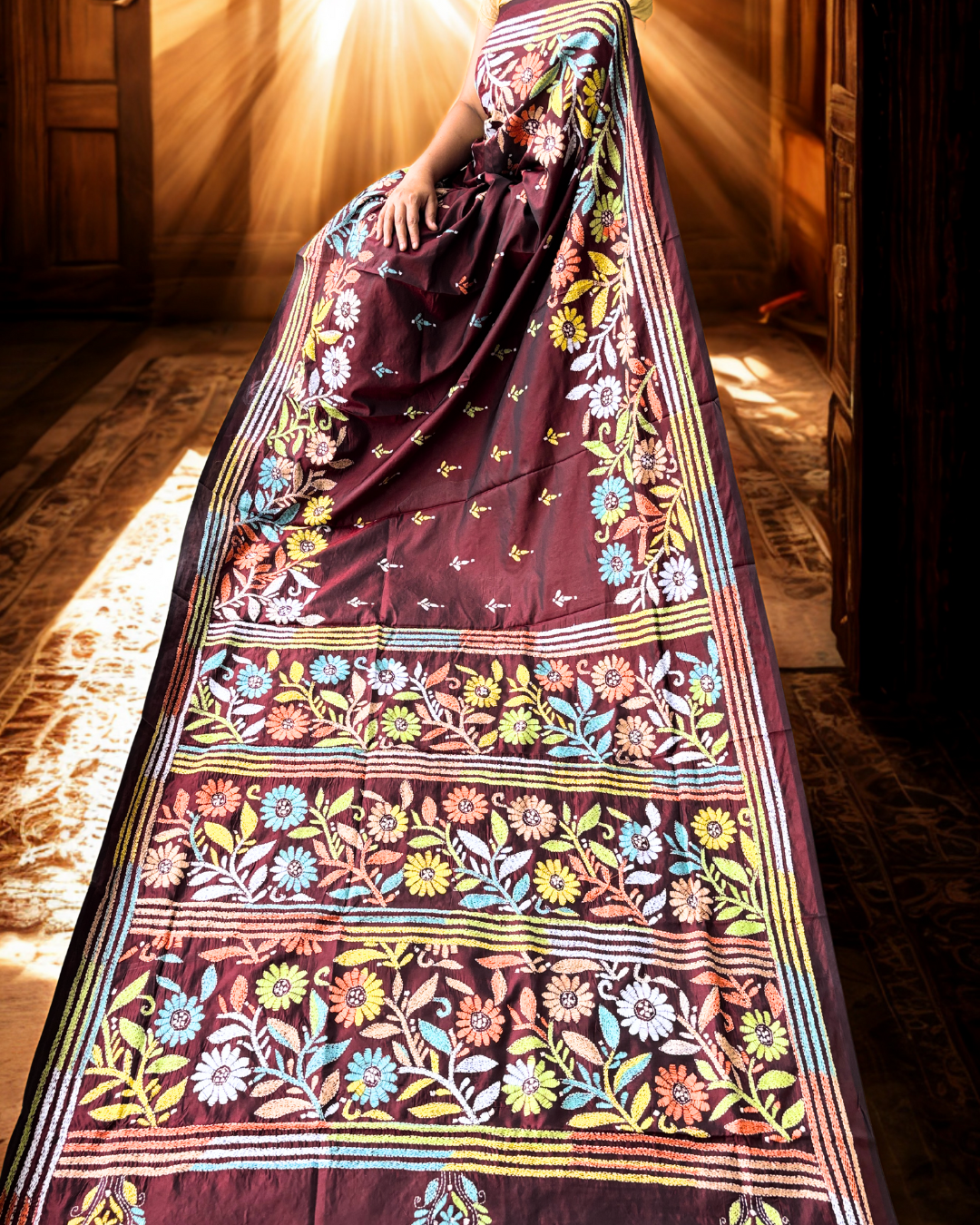 Deep maroon reflecting pastel blooms and vines, a timeless mirror of romance and heritage.