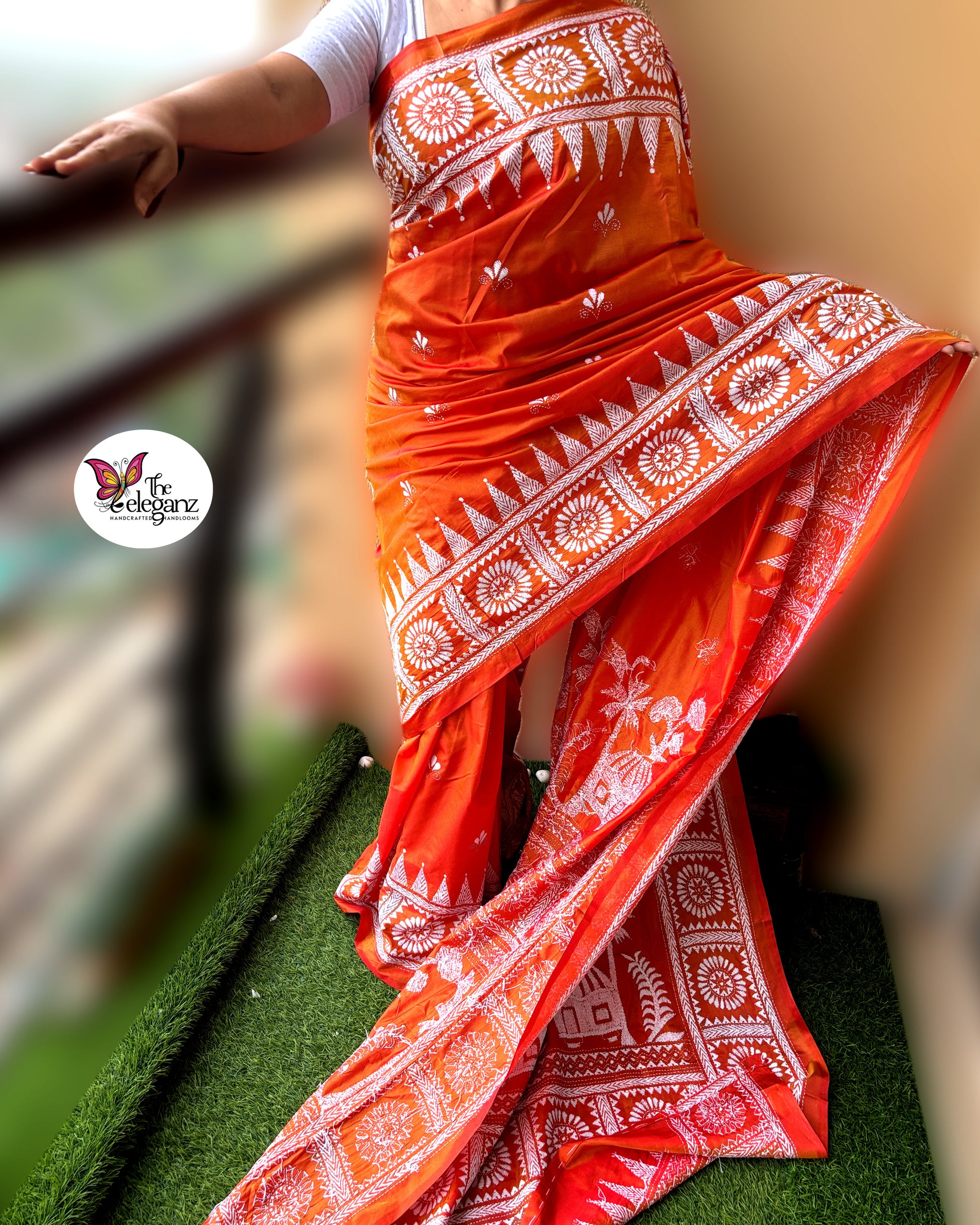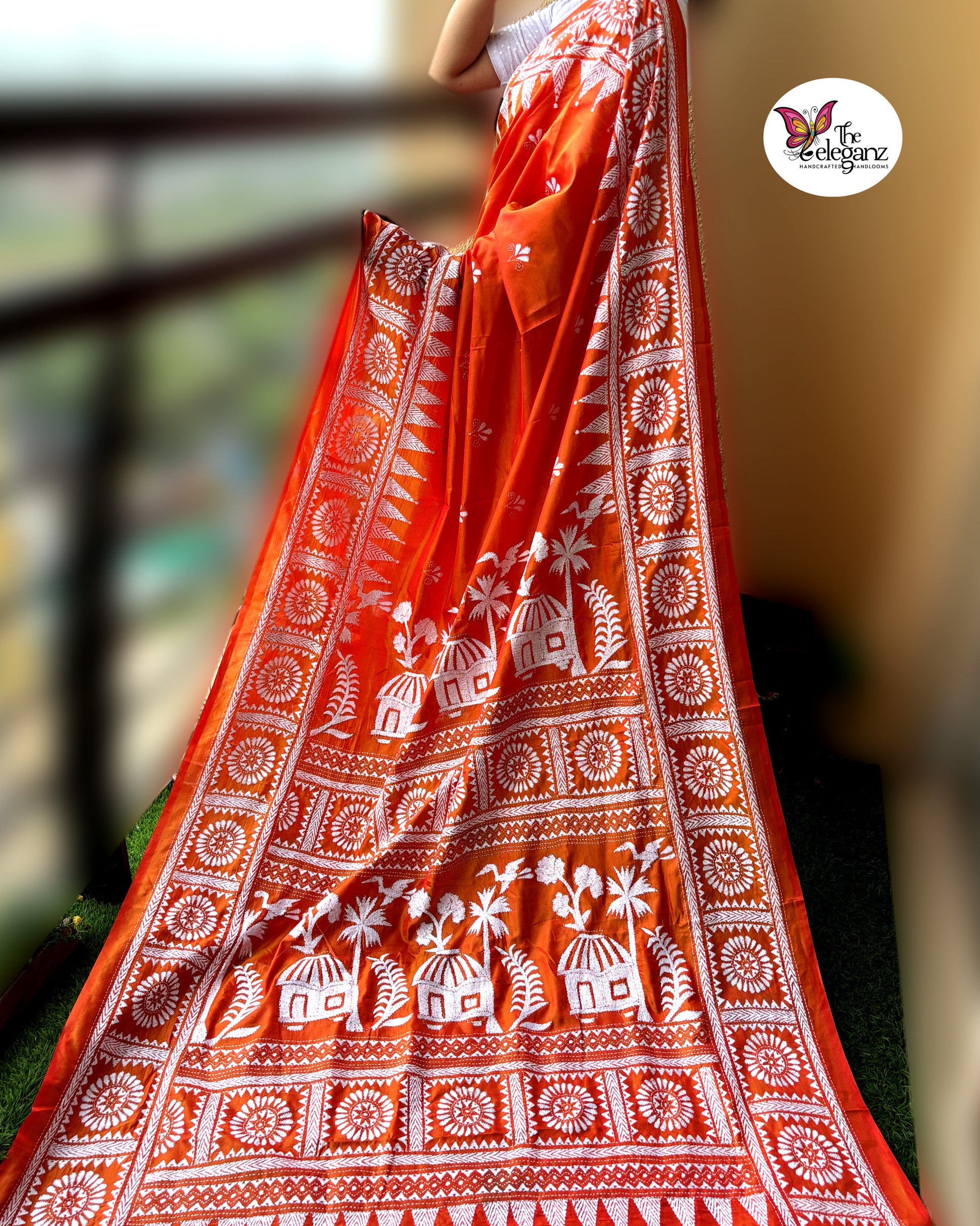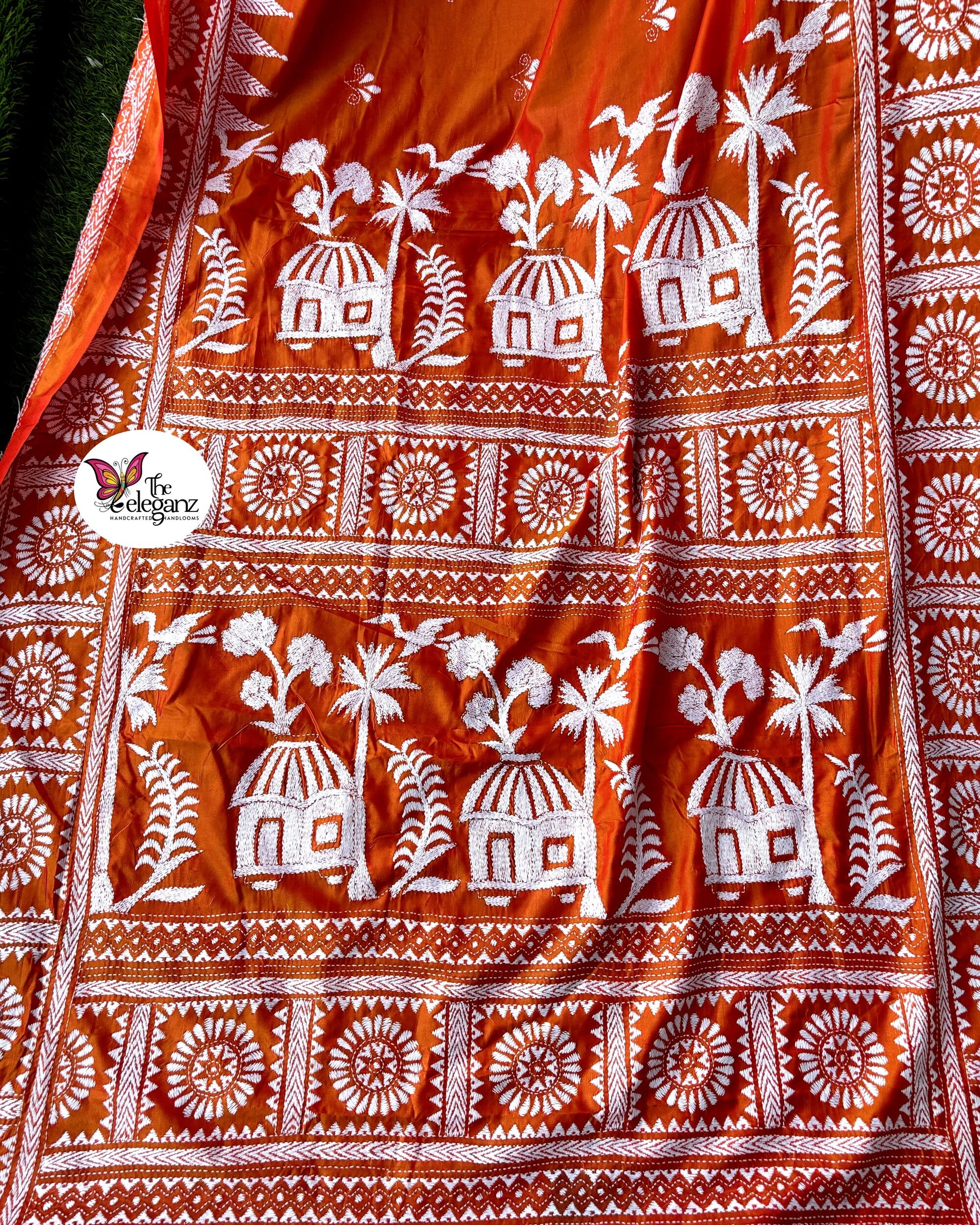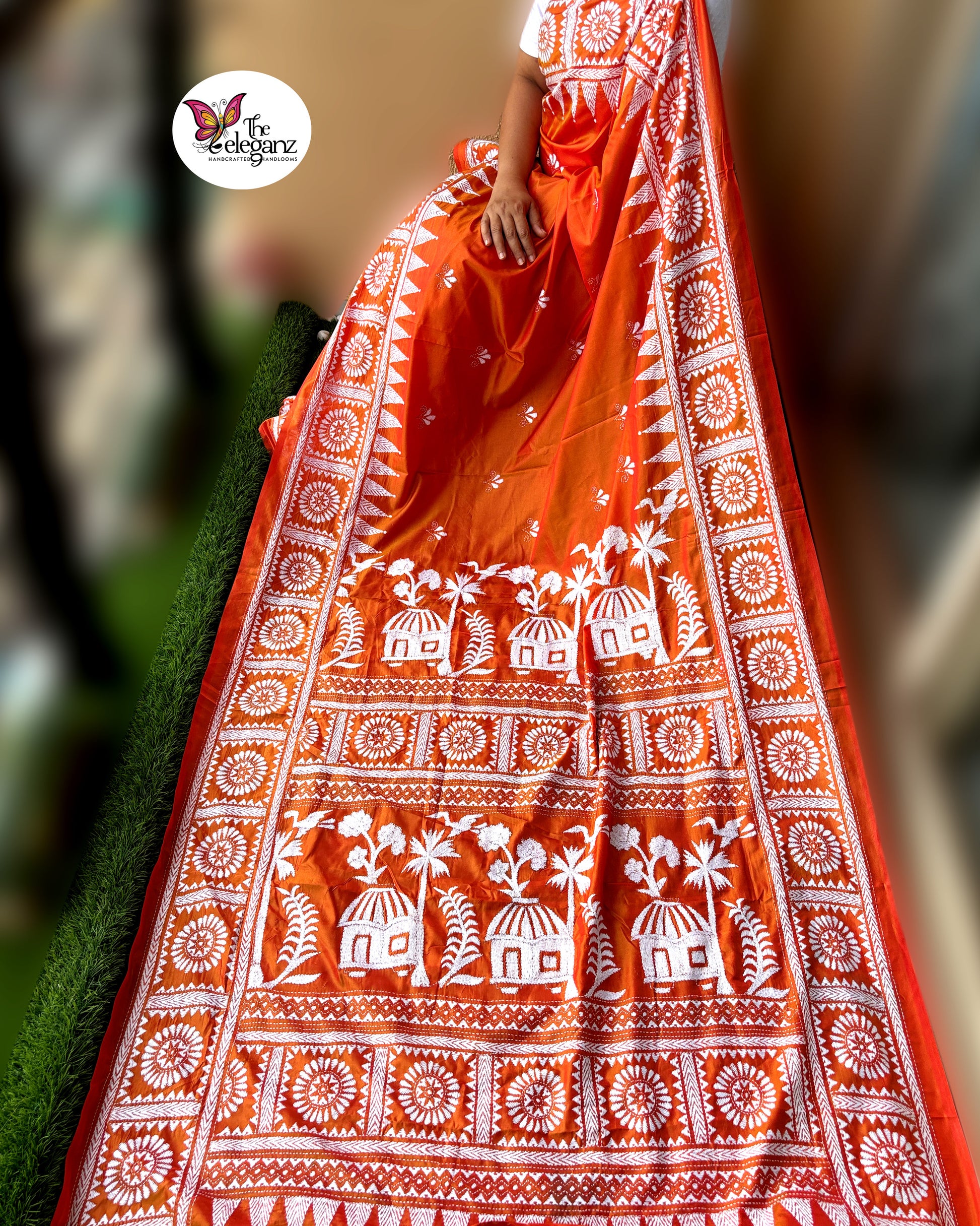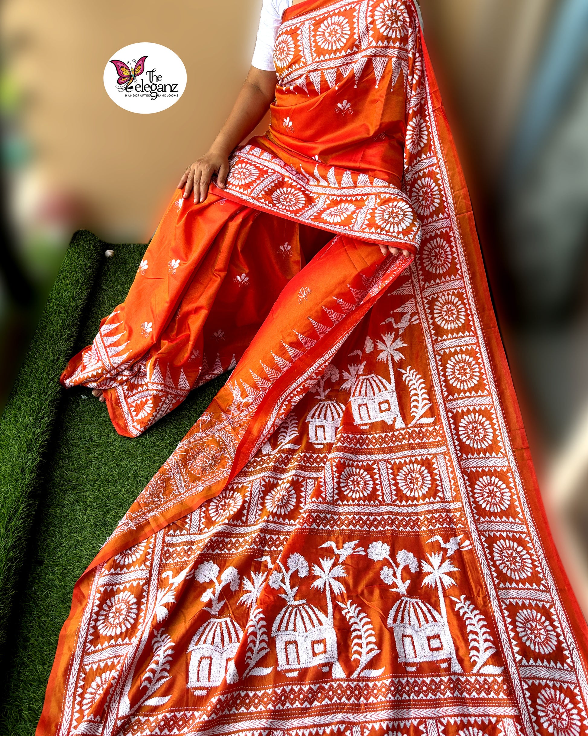 Orange drape glowing with sunbursts, palm trees, and village scenes—wearable warmth from Bengal’s heartland.