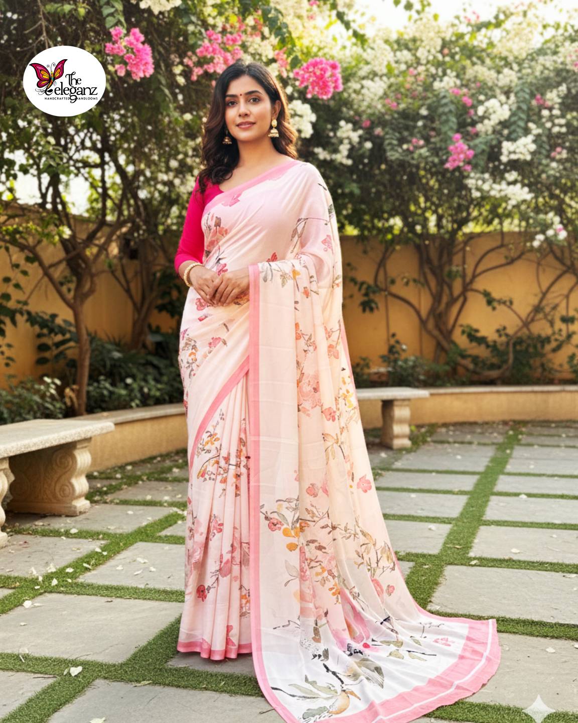 The blouse worn by the model is for styling and illustration purposes only. The actual blouse piece provided will be as per the saree fabric and print.