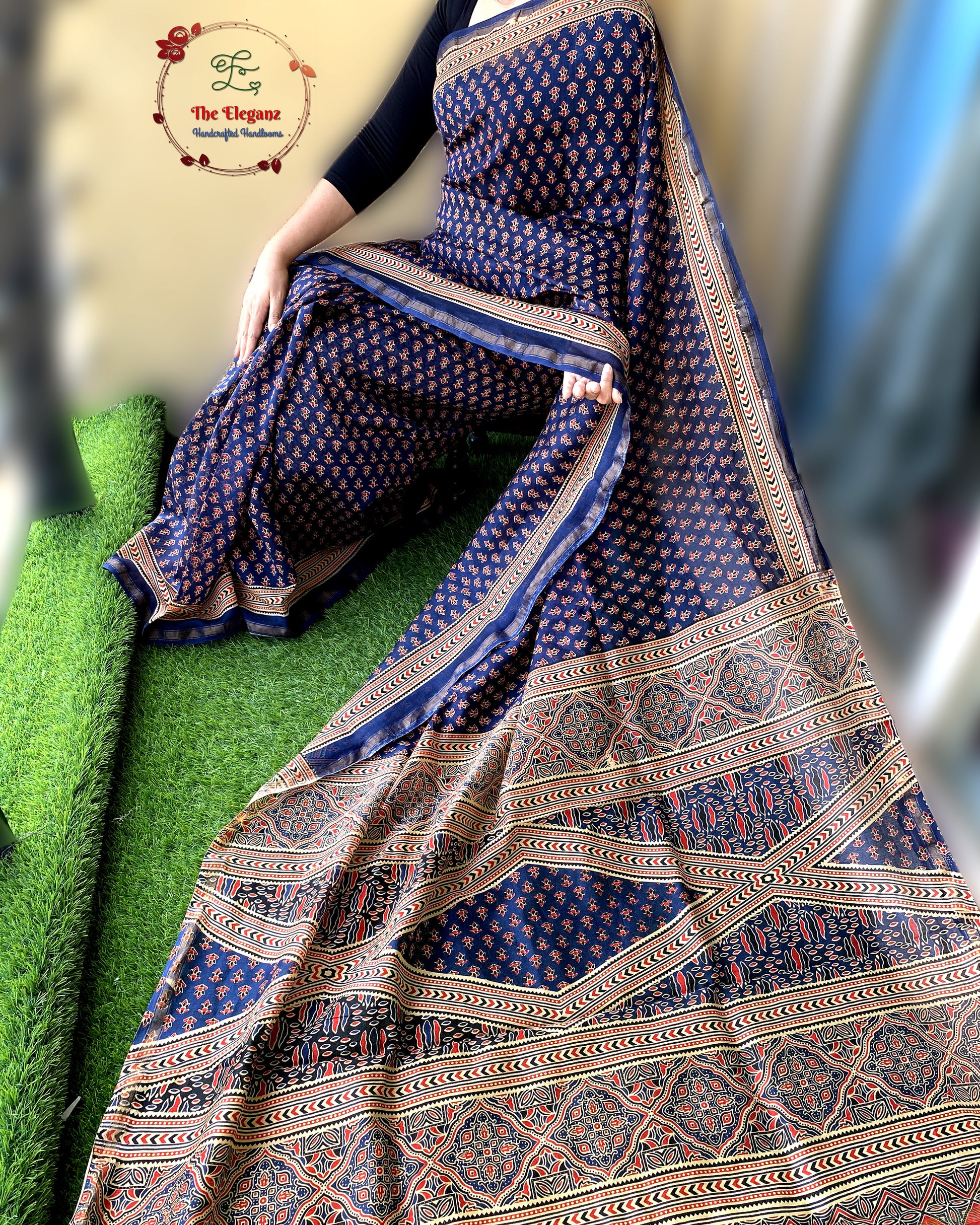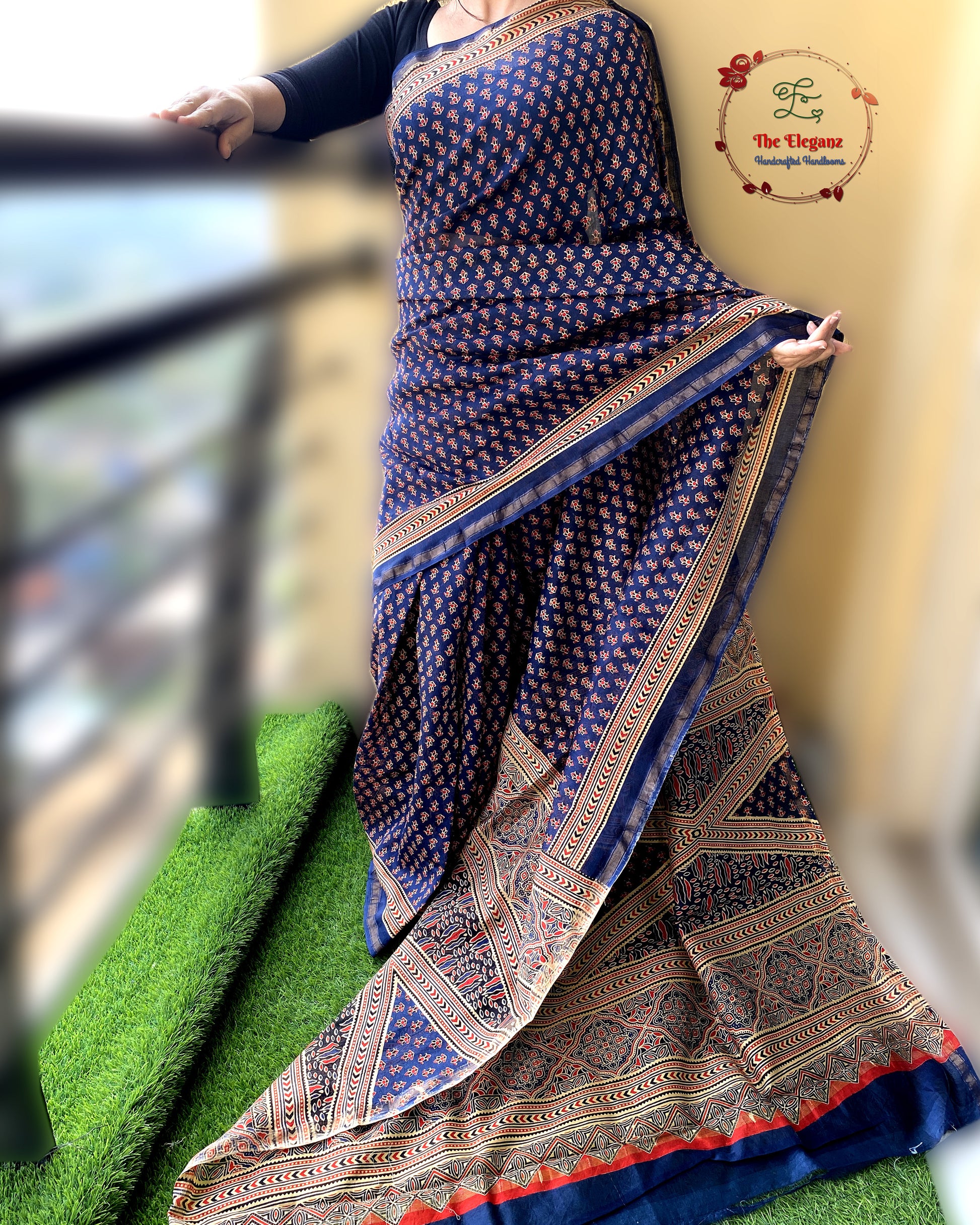 A weave that whispers royalty — this Chanderi silk saree blends the midnight elegance of blue with intricate prints in earthy tones, echoing the regal patterns of ancient palaces and temple walls. Draped in this, you carry timeless grace with a modern allure.