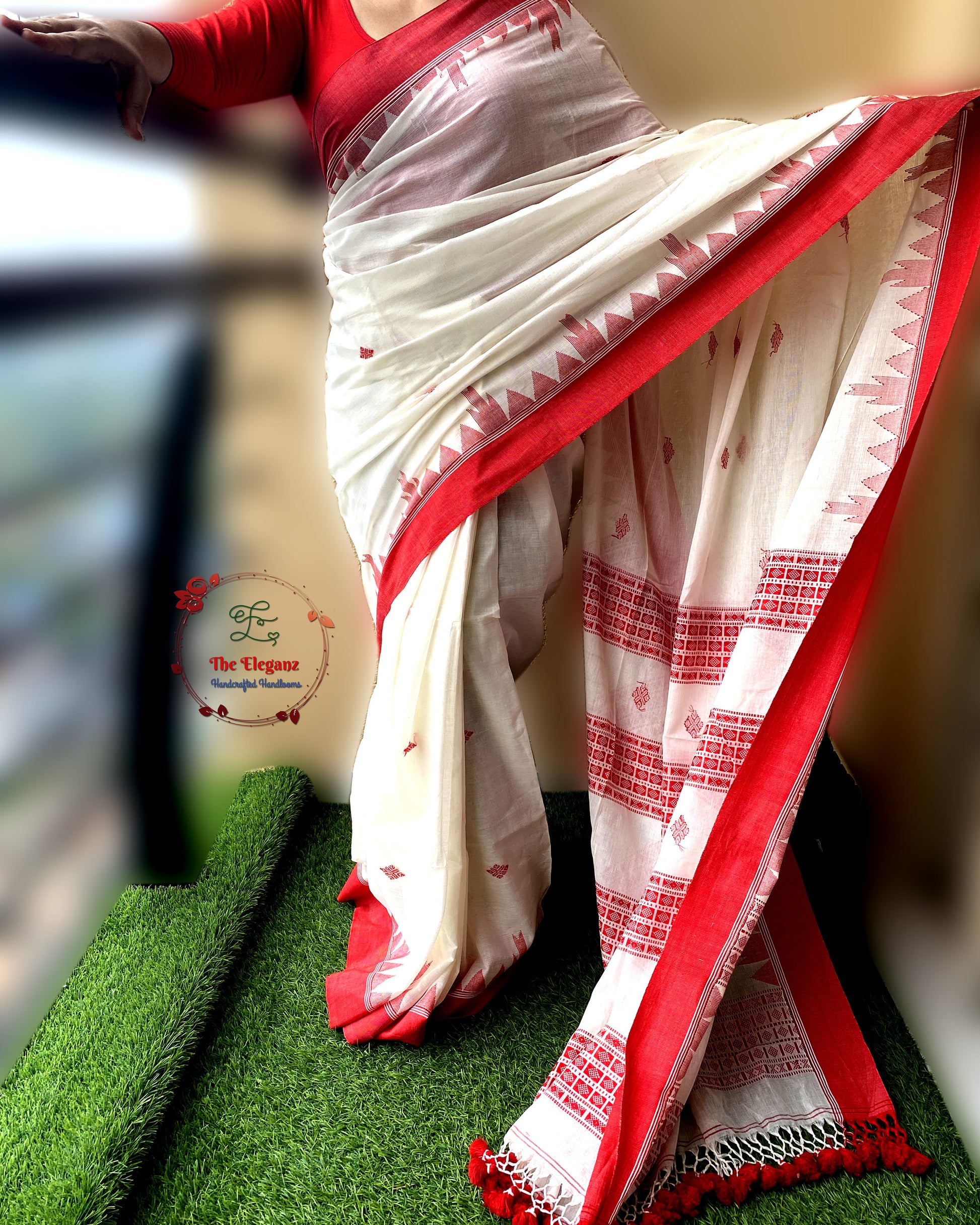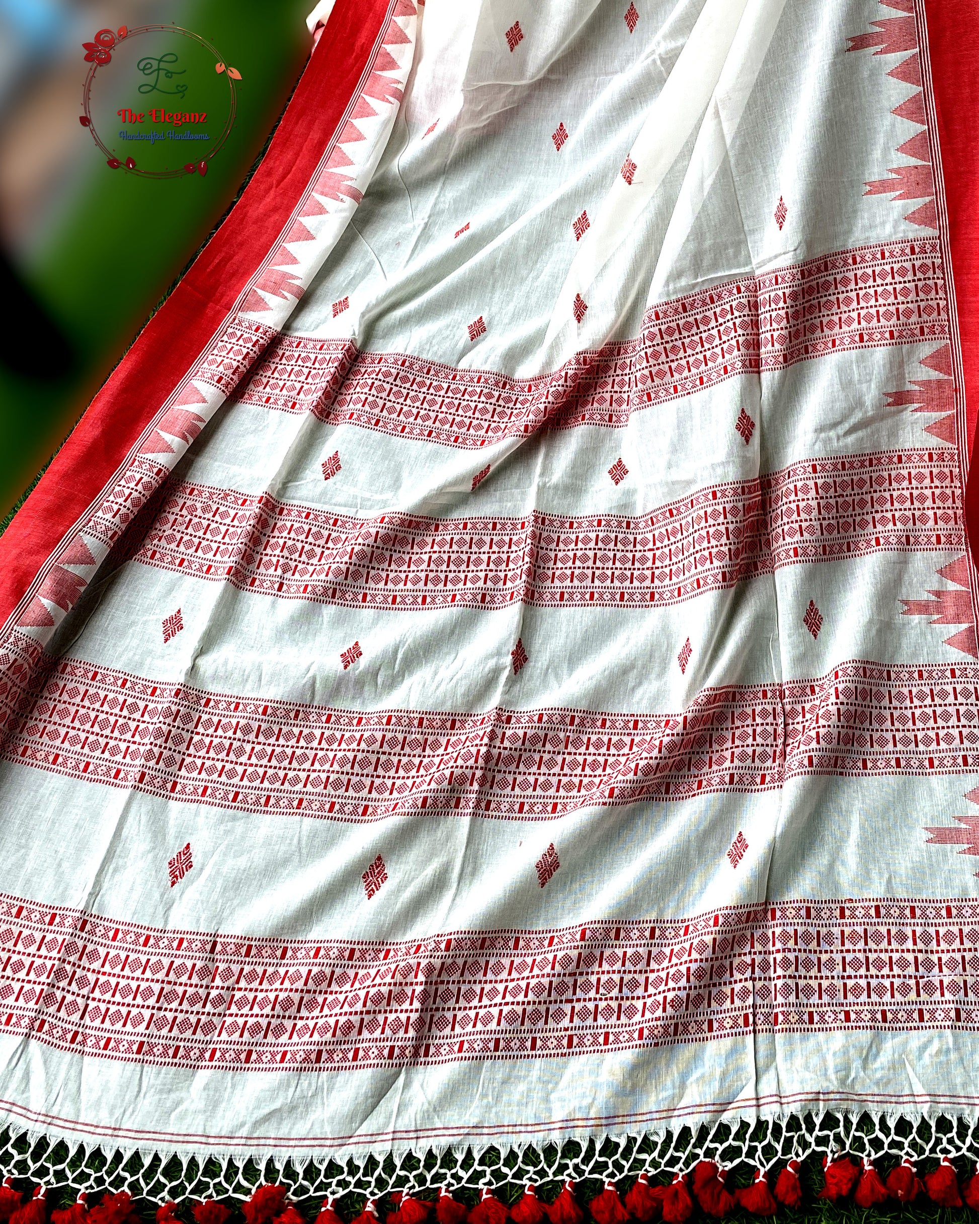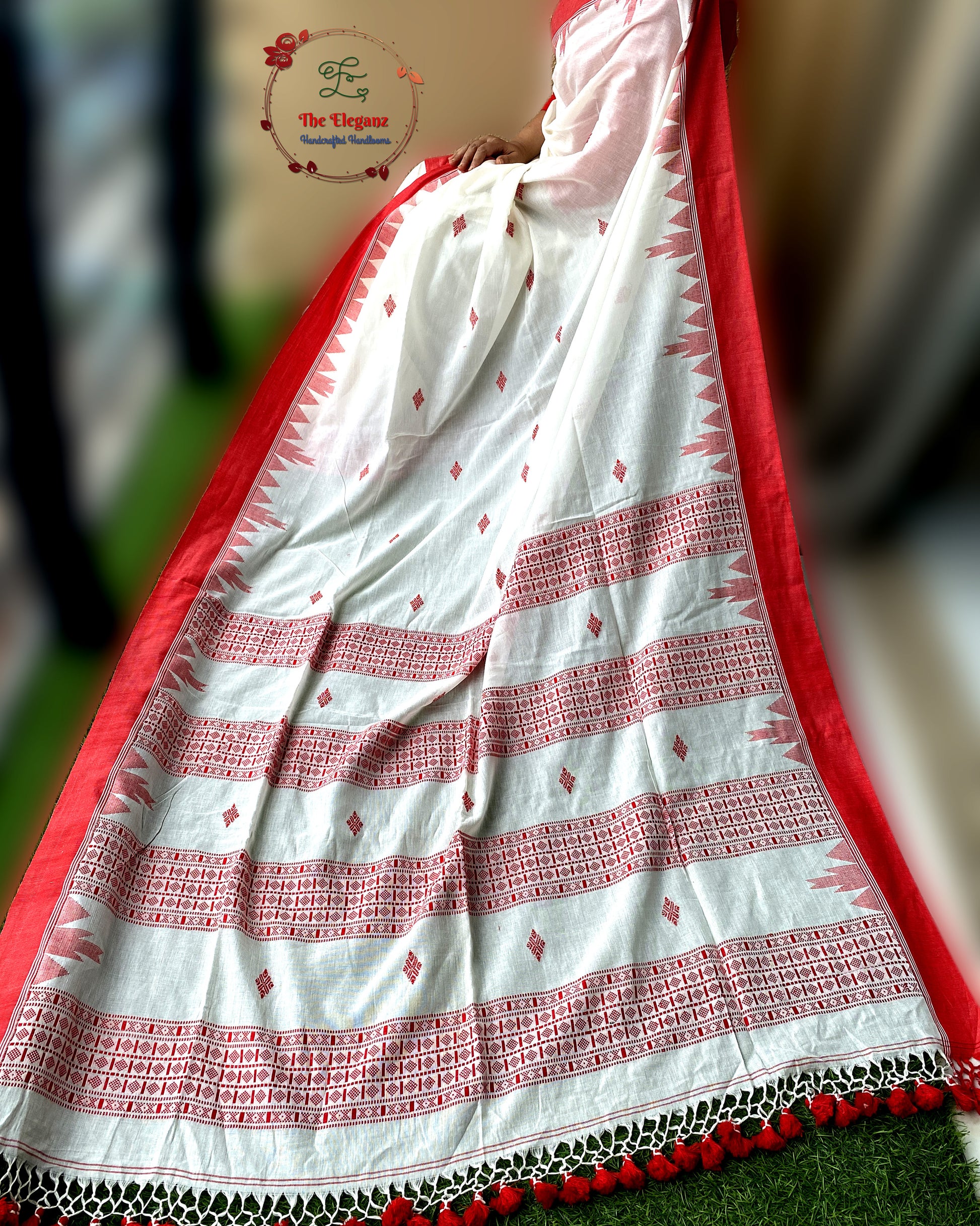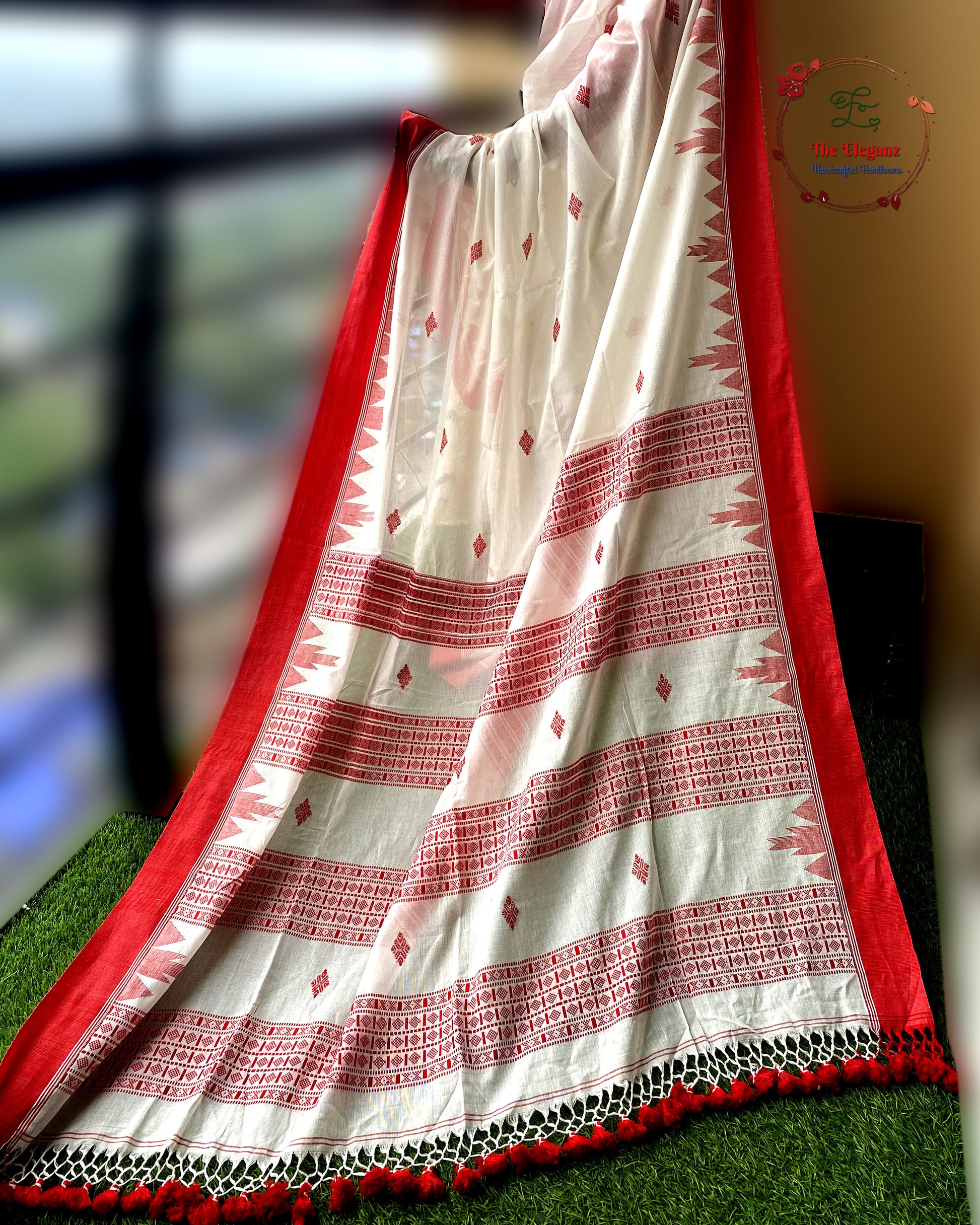 Woven in the purest shades of white with temple-red borders, Devalekha embodies the divine grace of temple spires and sacred rituals. The geometric weaves echo the rhythm of chants, while the red tassels at the edge symbolize auspicious blessings.