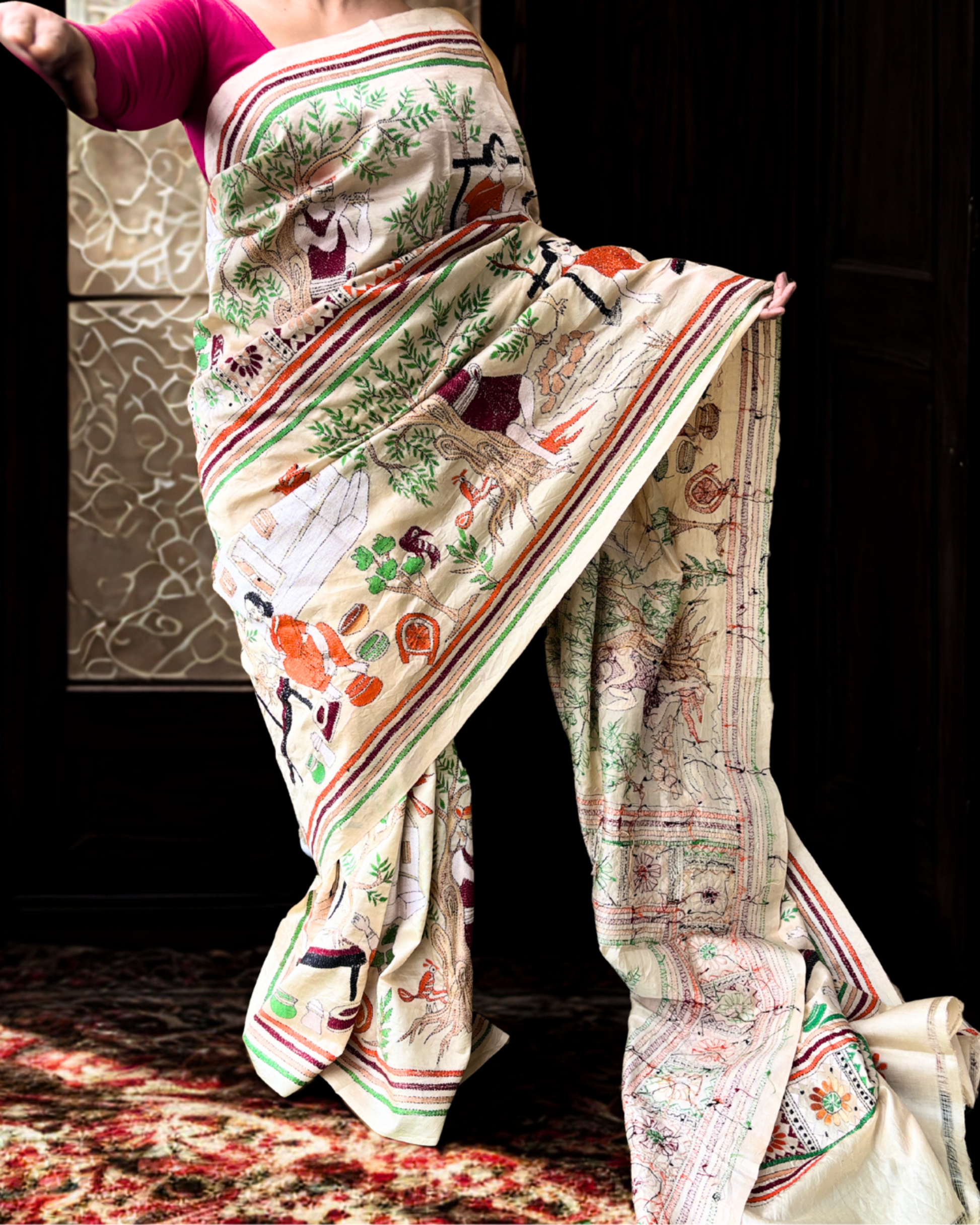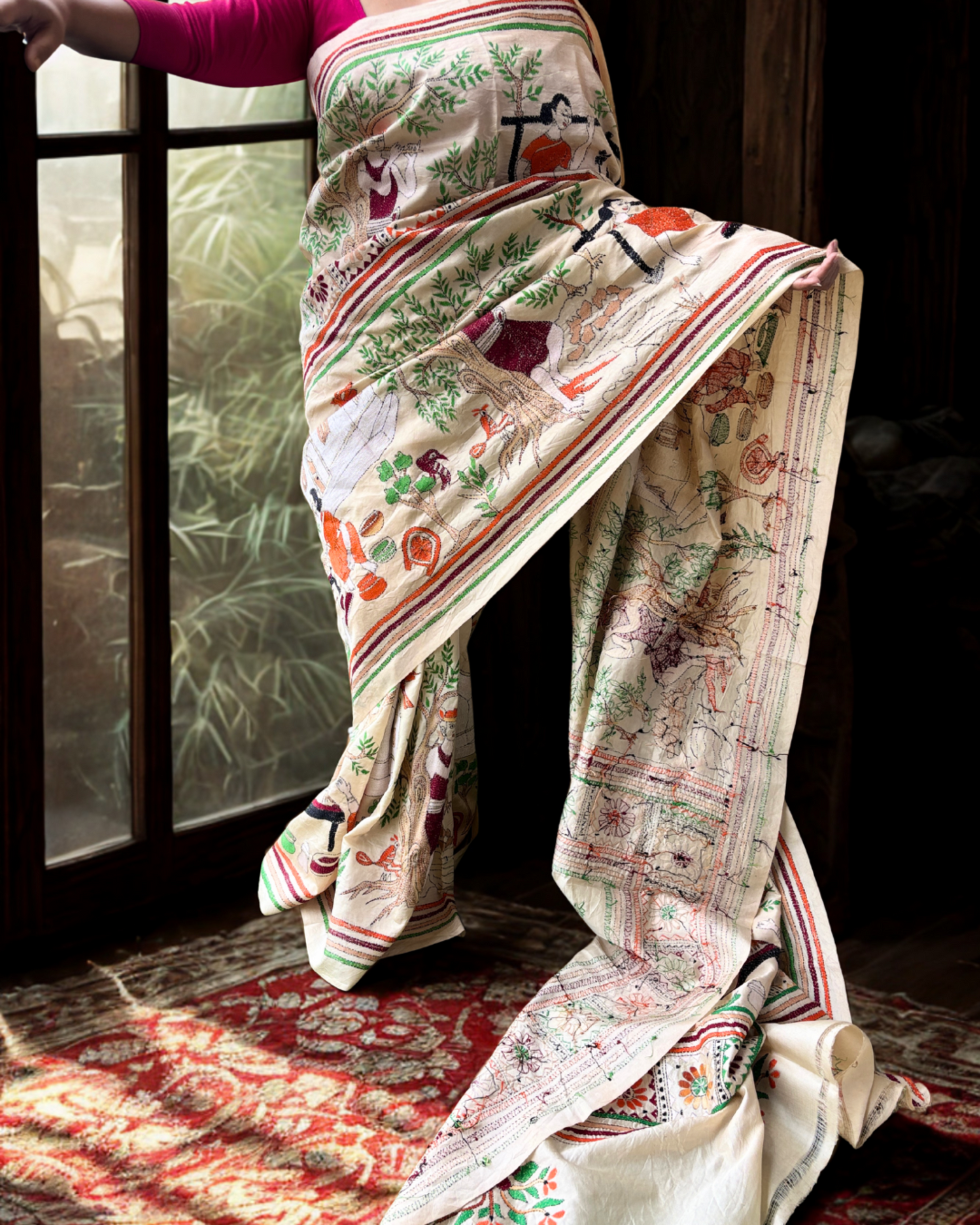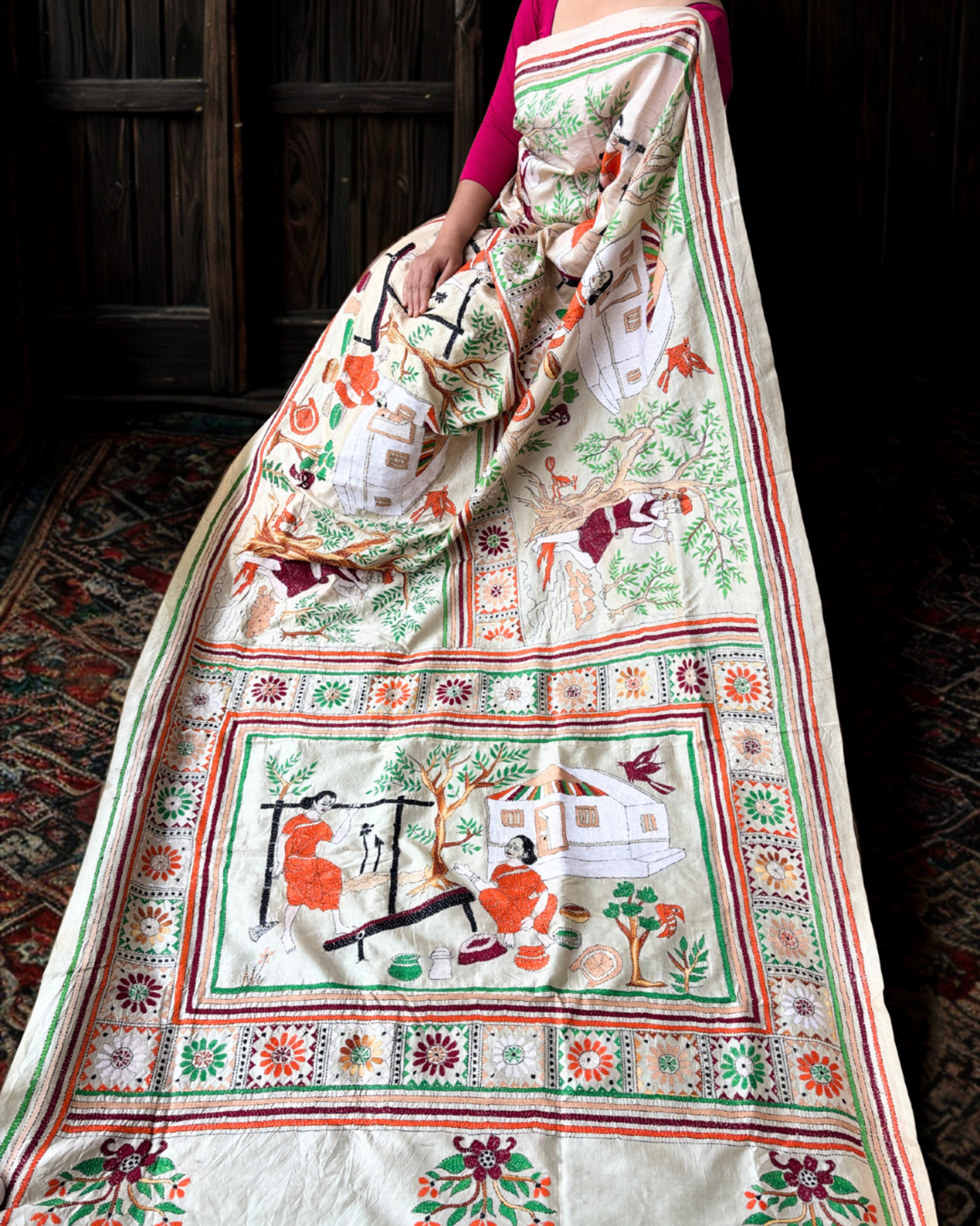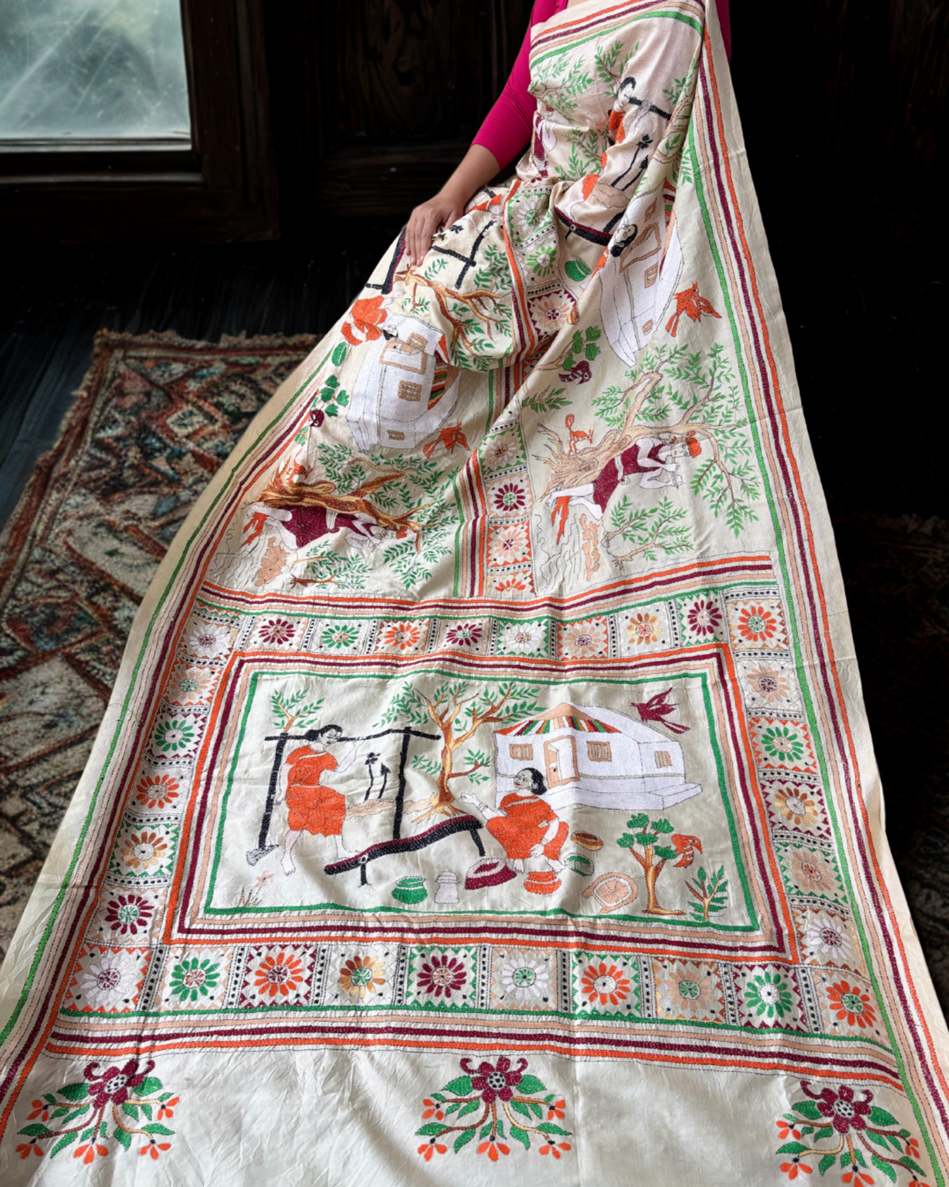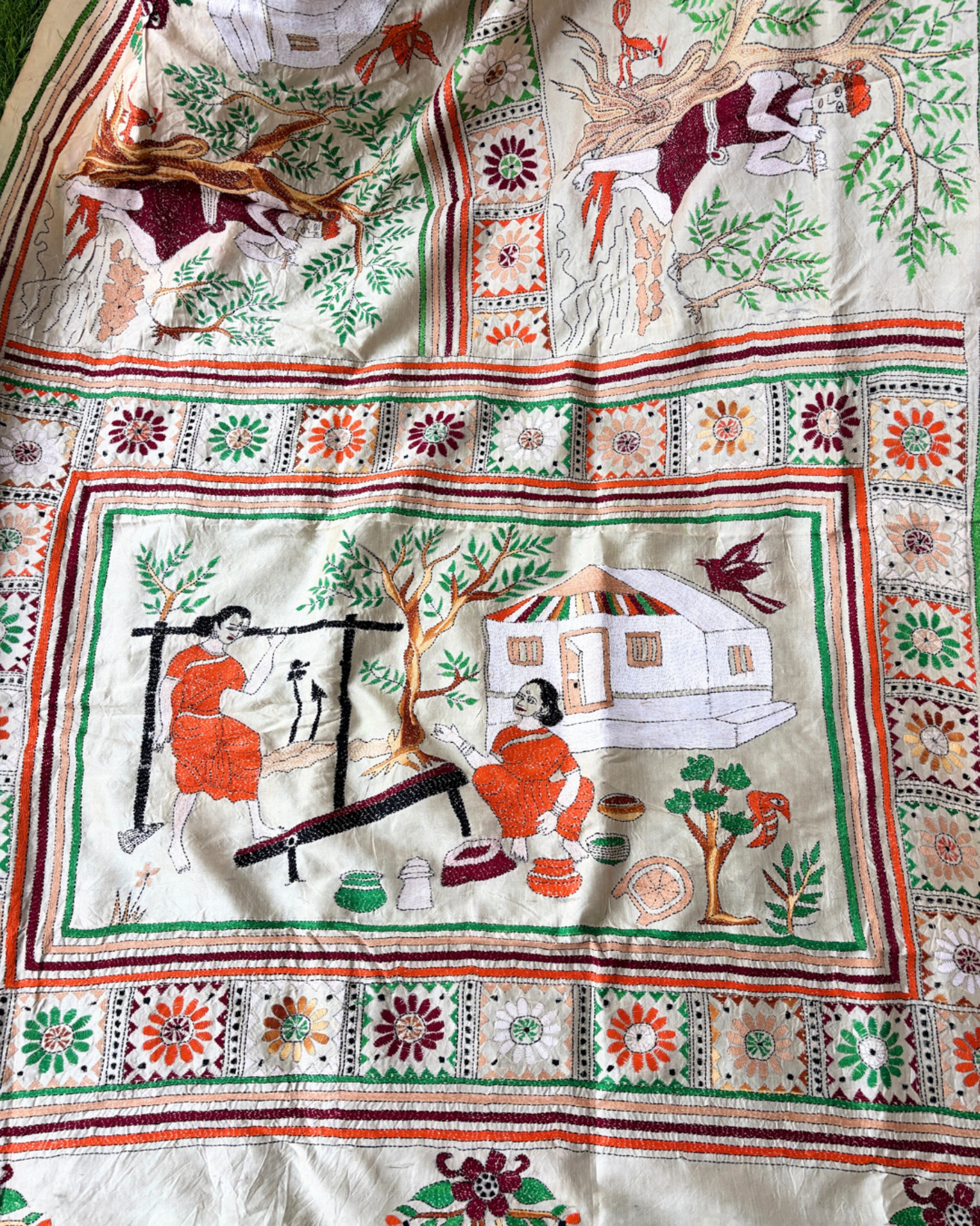 Special Features: Entirely hand-stitched Kantha embroidery, narrative motifs of village life, floral patterned borders