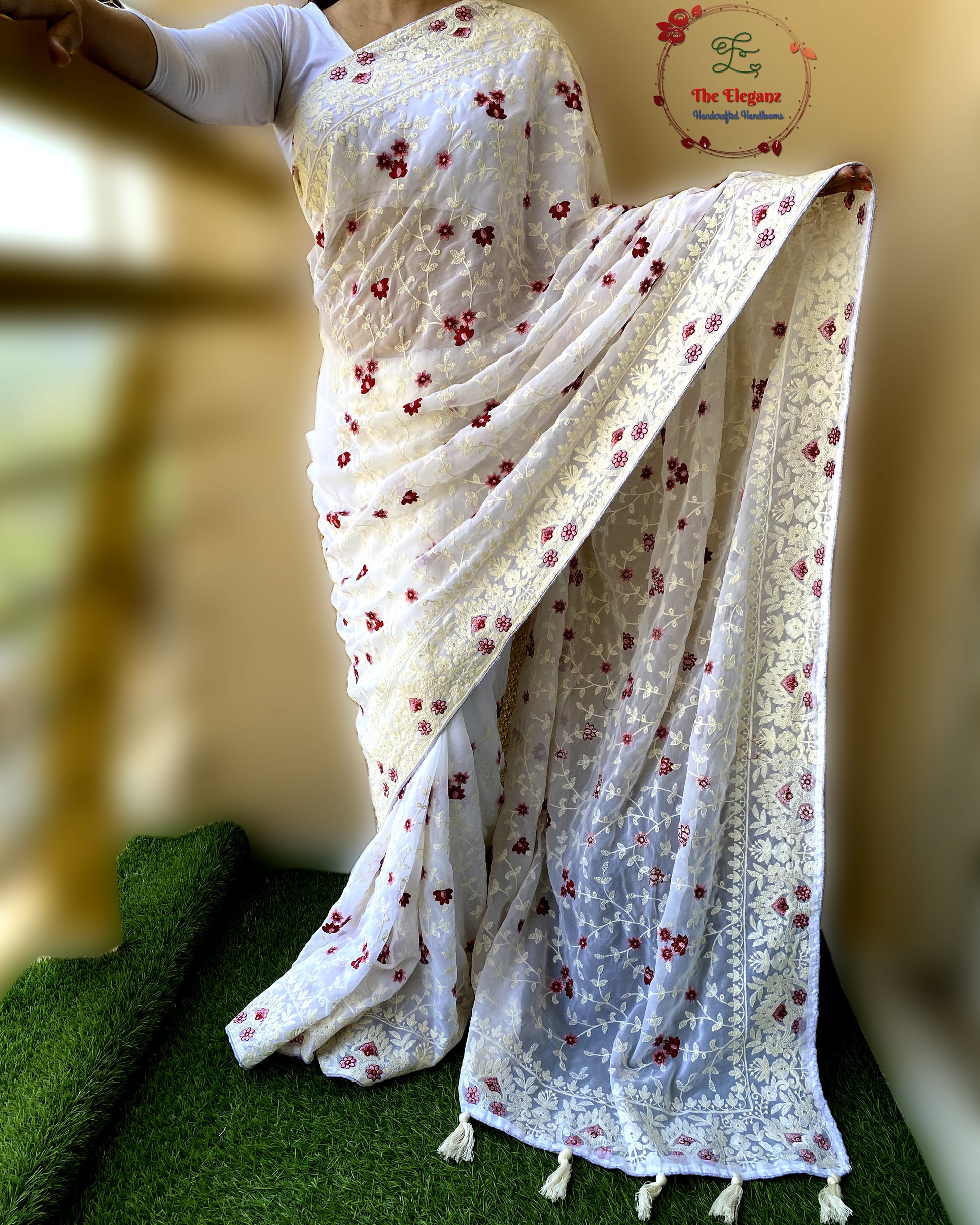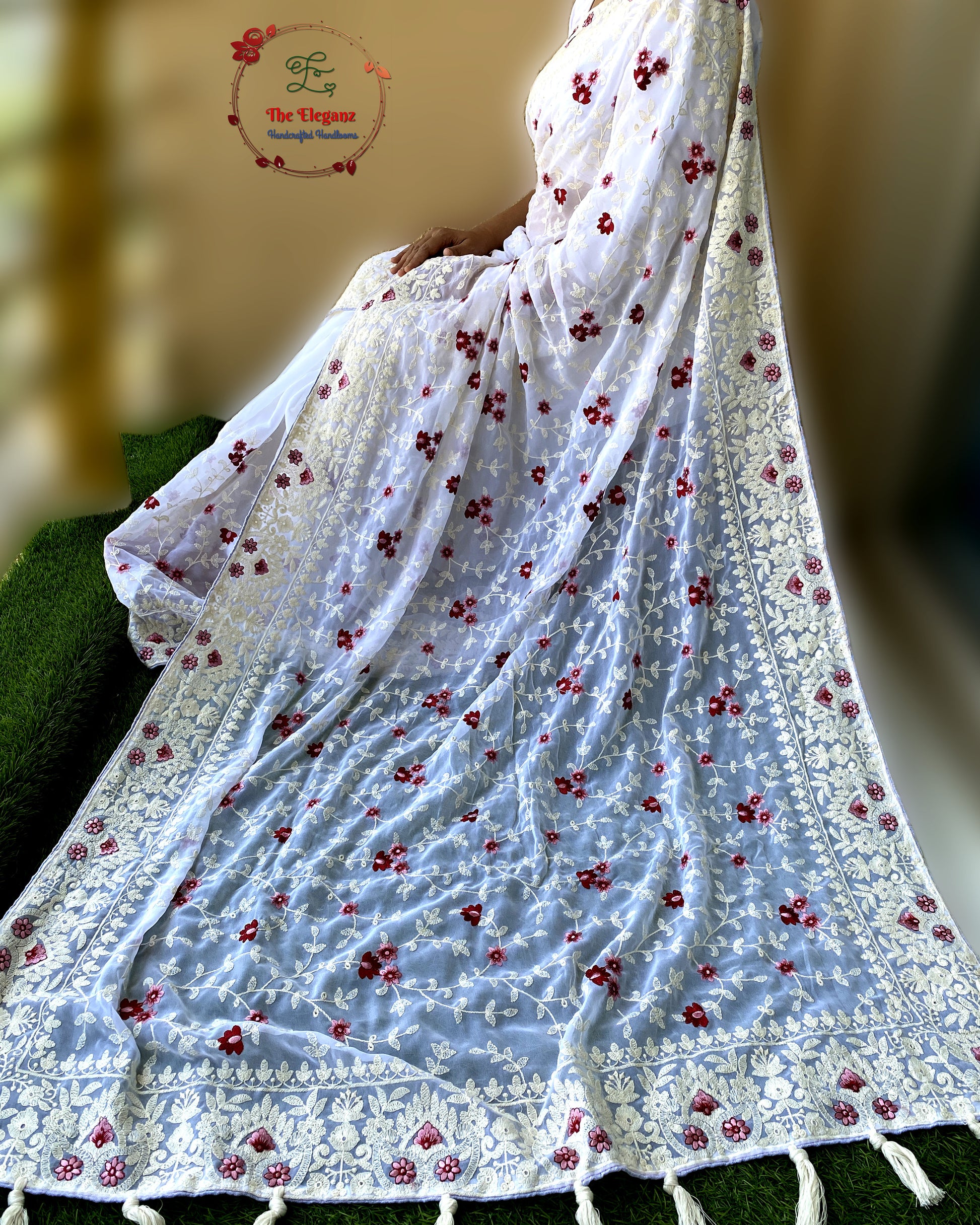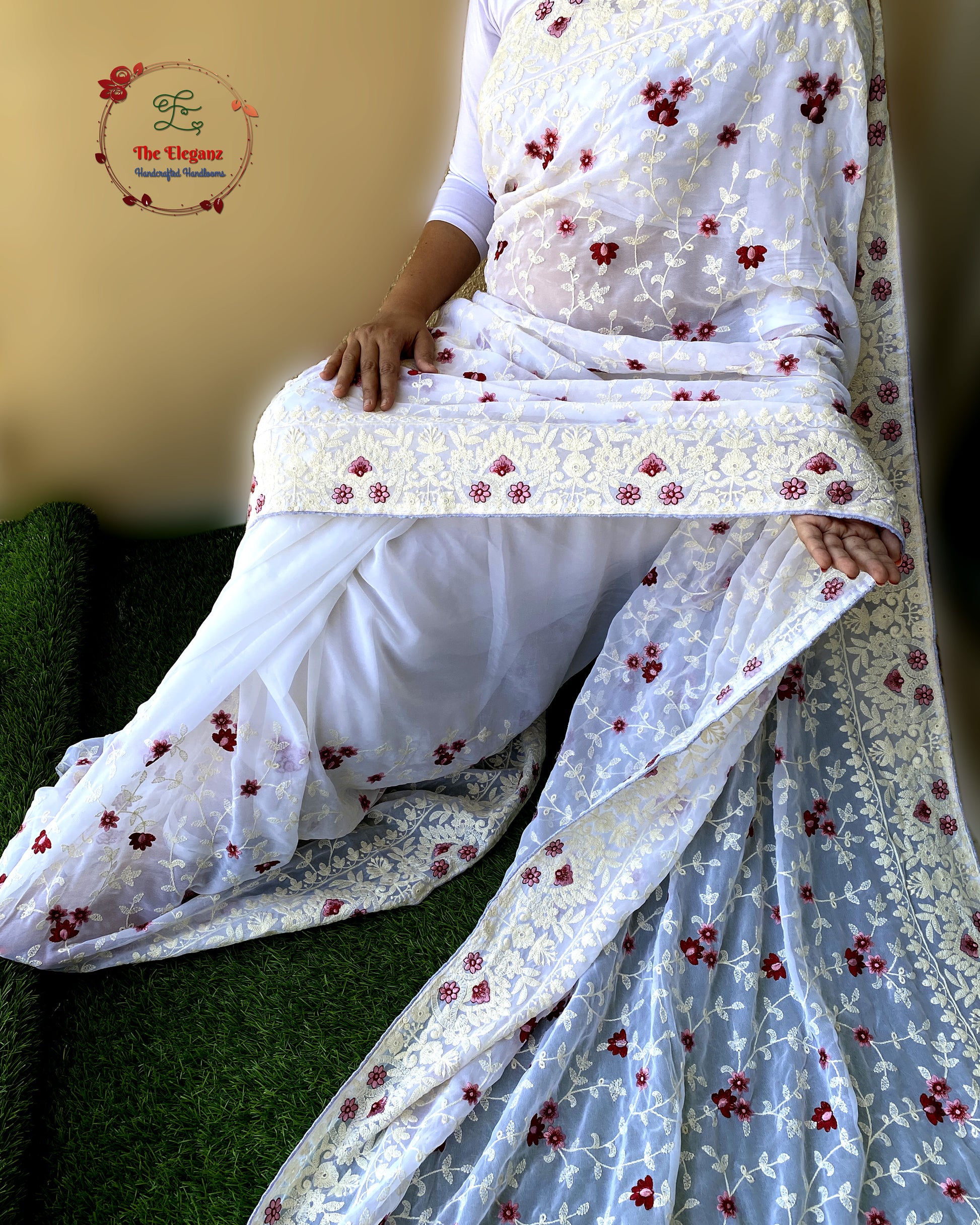Safaid Gul is a pristine white georgette saree brought to life with intricate machine Chikankari embroidery. Adorned with deep red floral motifs blooming across its canvas, it beautifully balances purity with vibrancy. The delicate white embroidery along the border and pallav enhances its regal charm, making it perfect for festive mornings, elegant evening gatherings, or summer weddings.