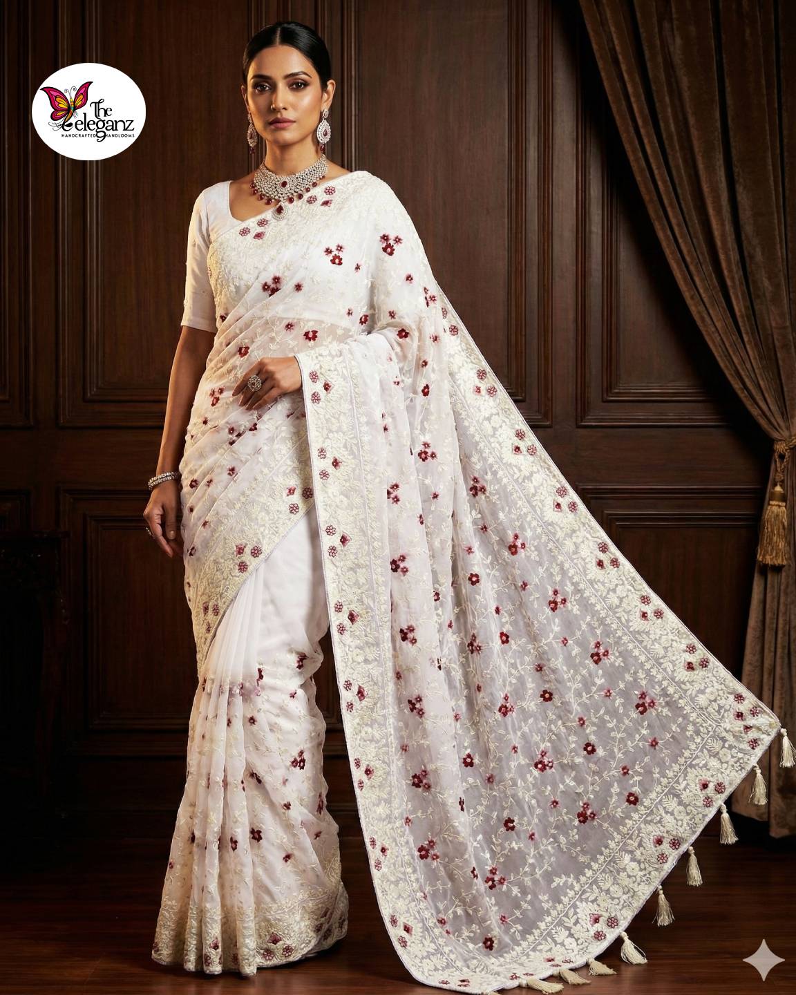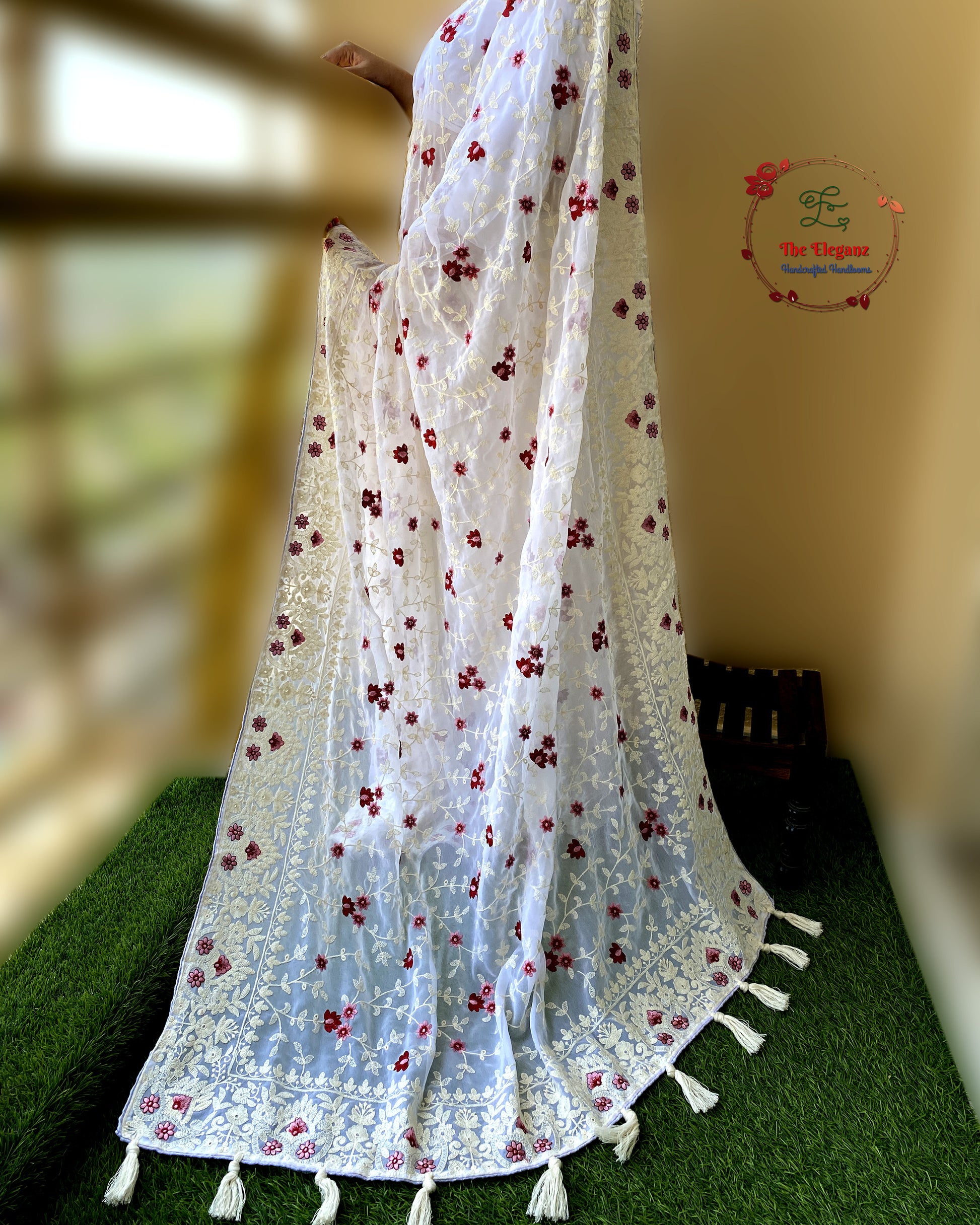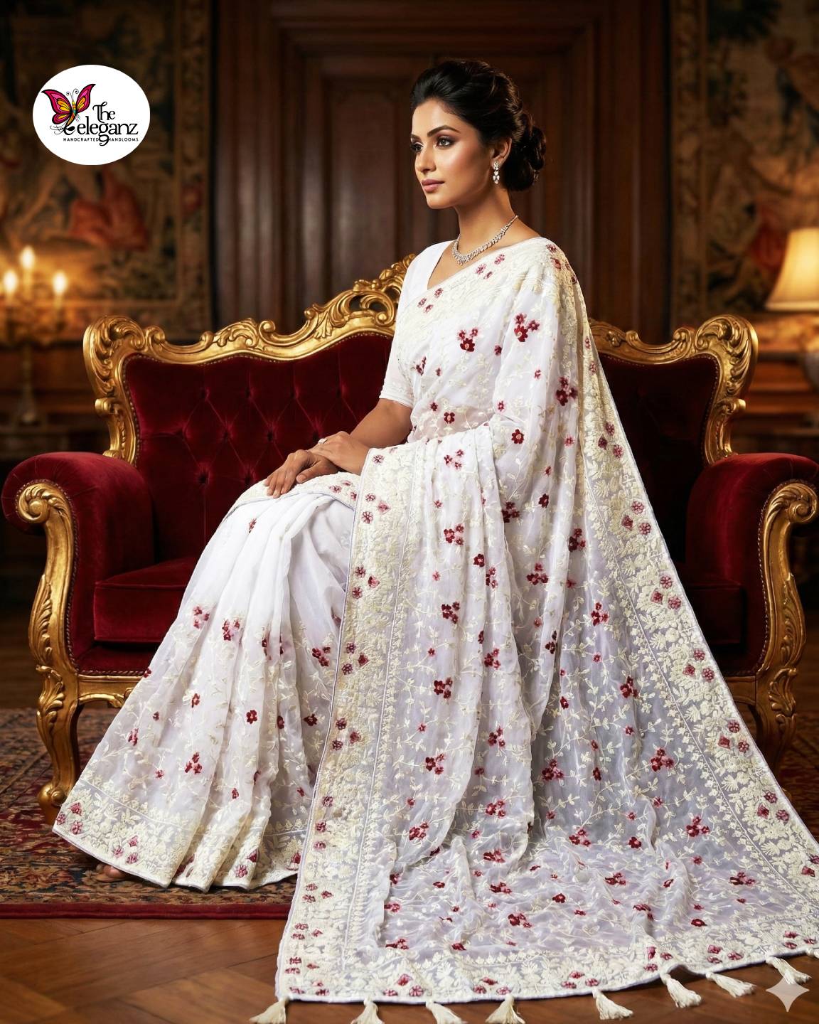 Safaid Gul is a pristine white georgette saree brought to life with intricate machine Chikankari embroidery. Adorned with deep red floral motifs blooming across its canvas, it beautifully balances purity with vibrancy. The delicate white embroidery along the border and pallav enhances its regal charm, making it perfect for festive mornings, elegant evening gatherings, or summer weddings.