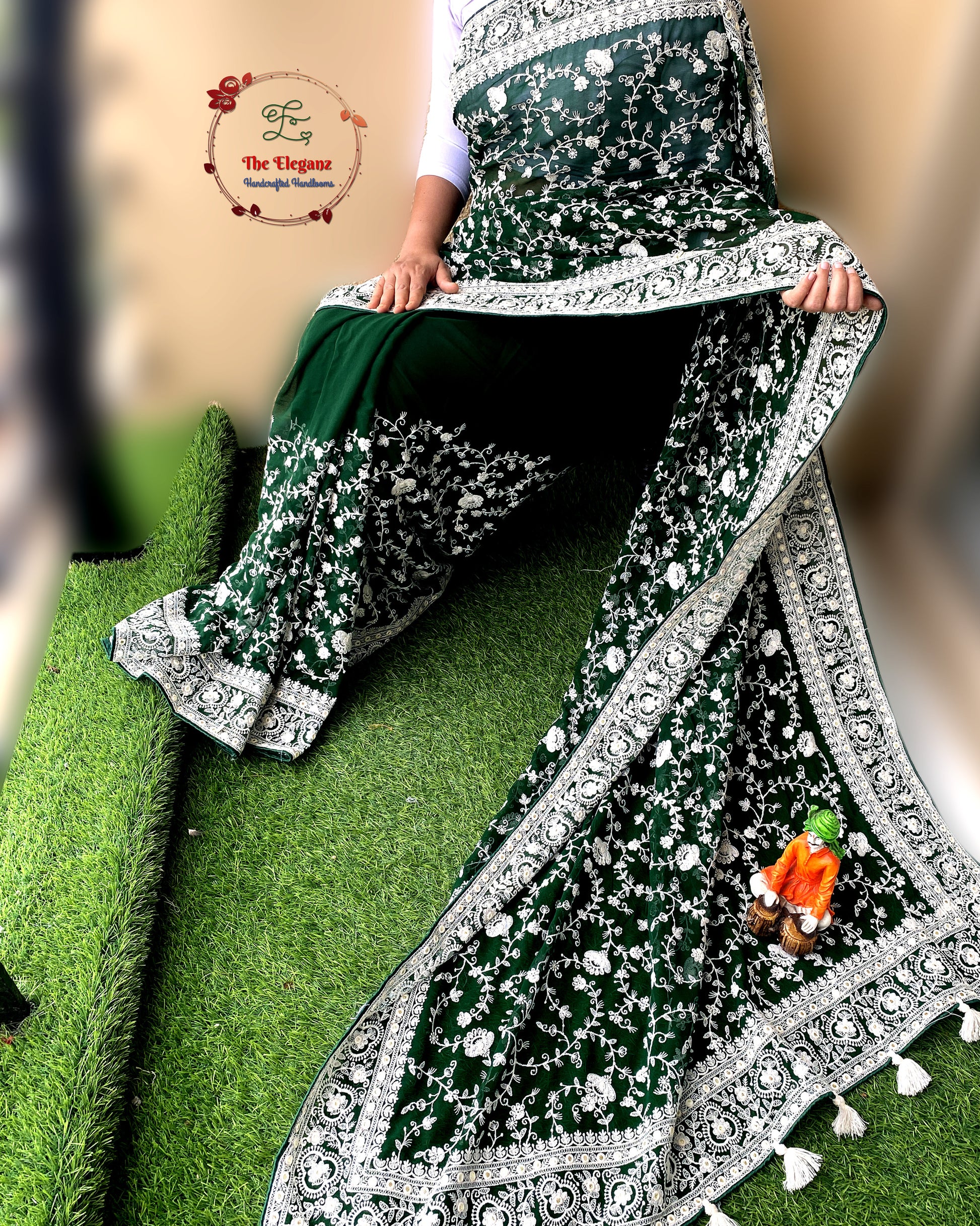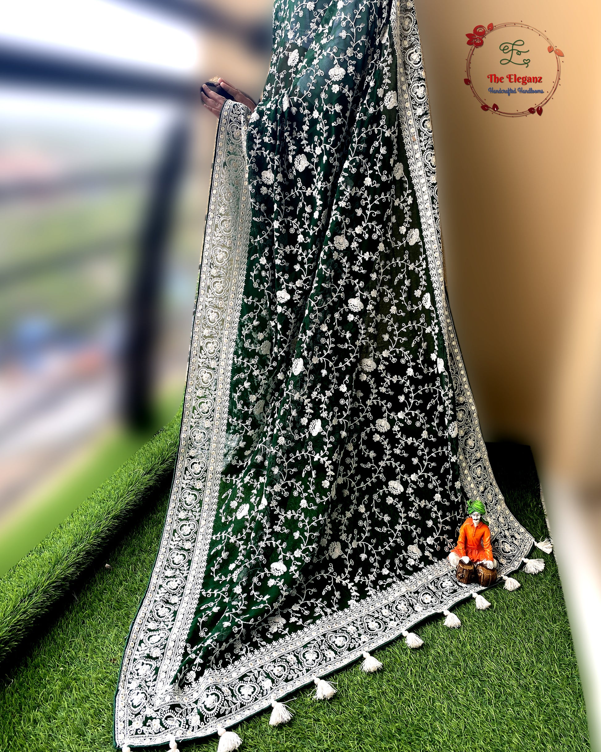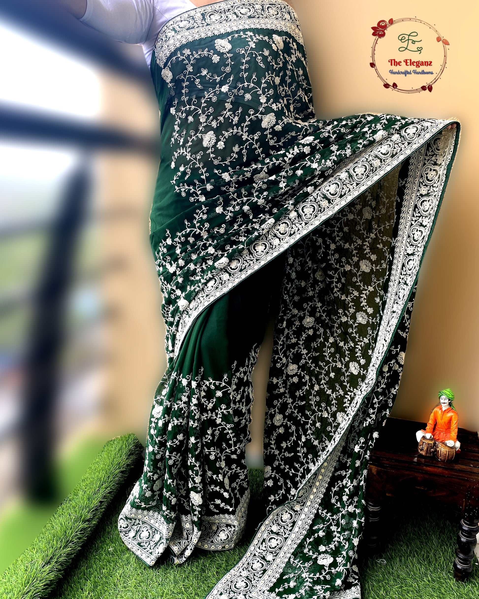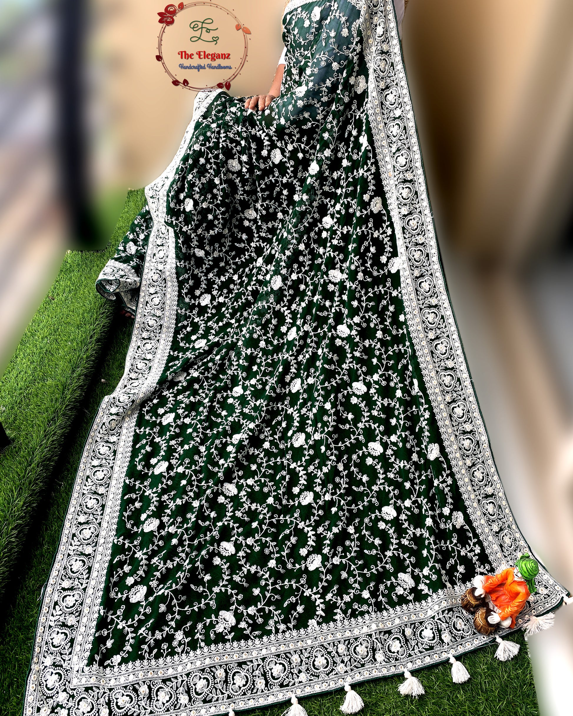 Draped in this bottle green beauty, one feels the serenity of twilight — where darkness meets light, and every embroidered bloom glows like a star against the night.