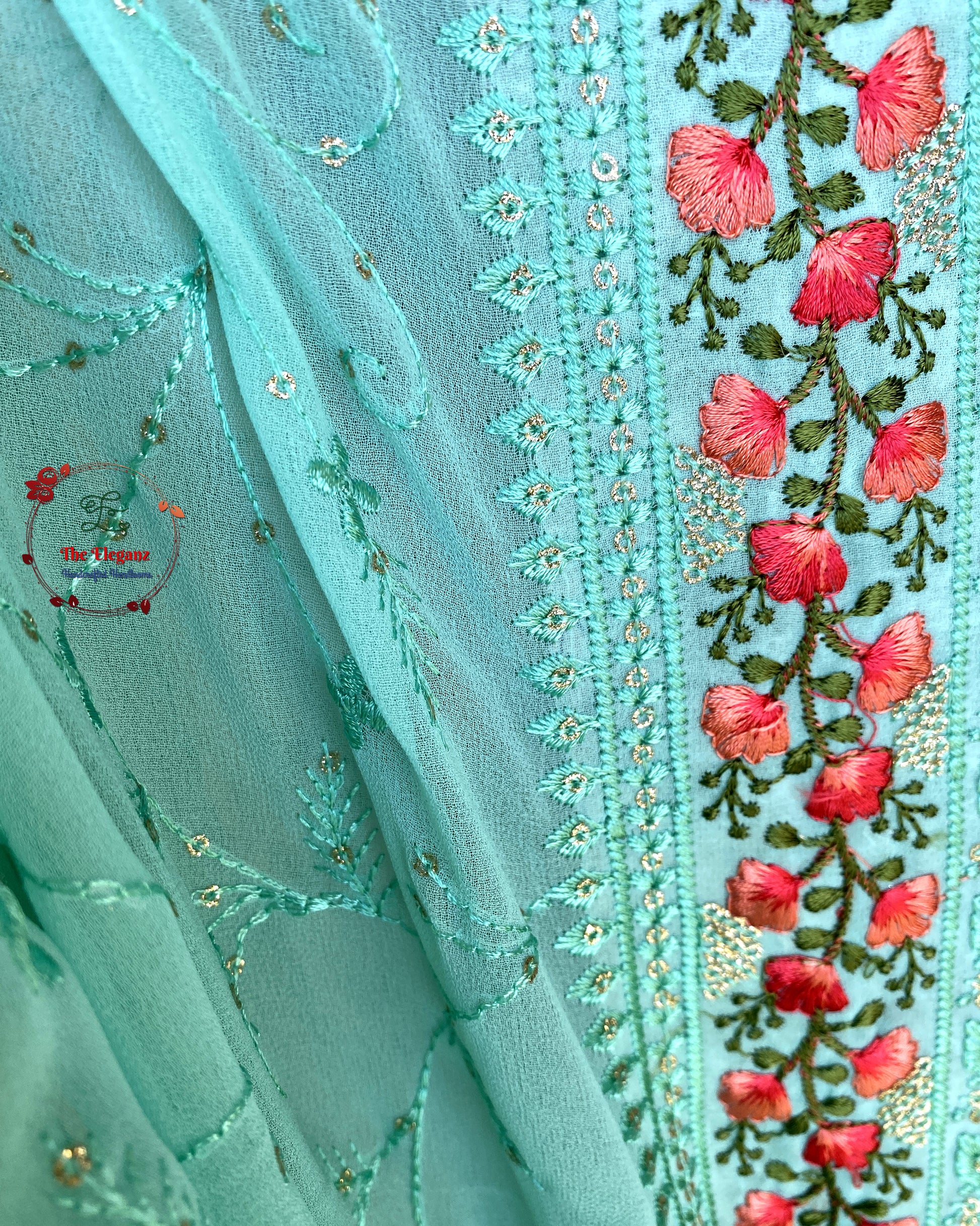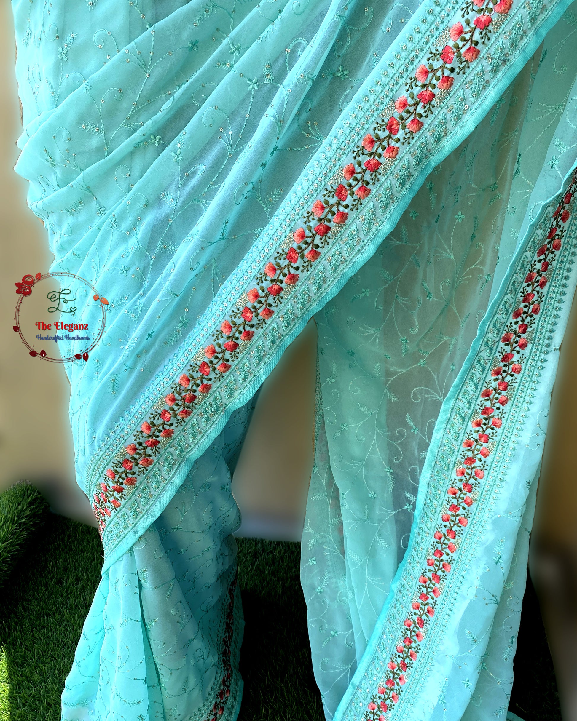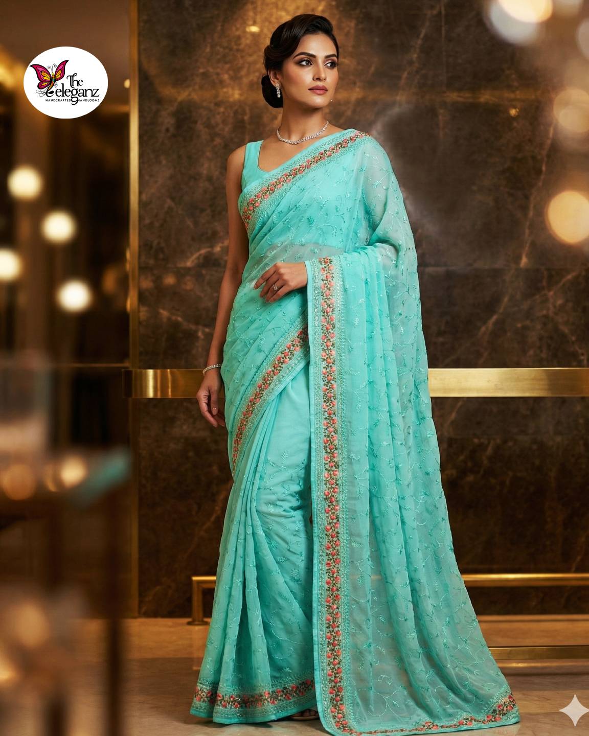 Like the calm bloom of a water lily on still waters, Nilofer carries a soothing elegance. The sea-green georgette canvas is delicately embroidered with fine chikankari motifs, its white vines and floral threads blossoming with quiet charm. Light, breezy, and ethereal — this saree is poetry in motion.