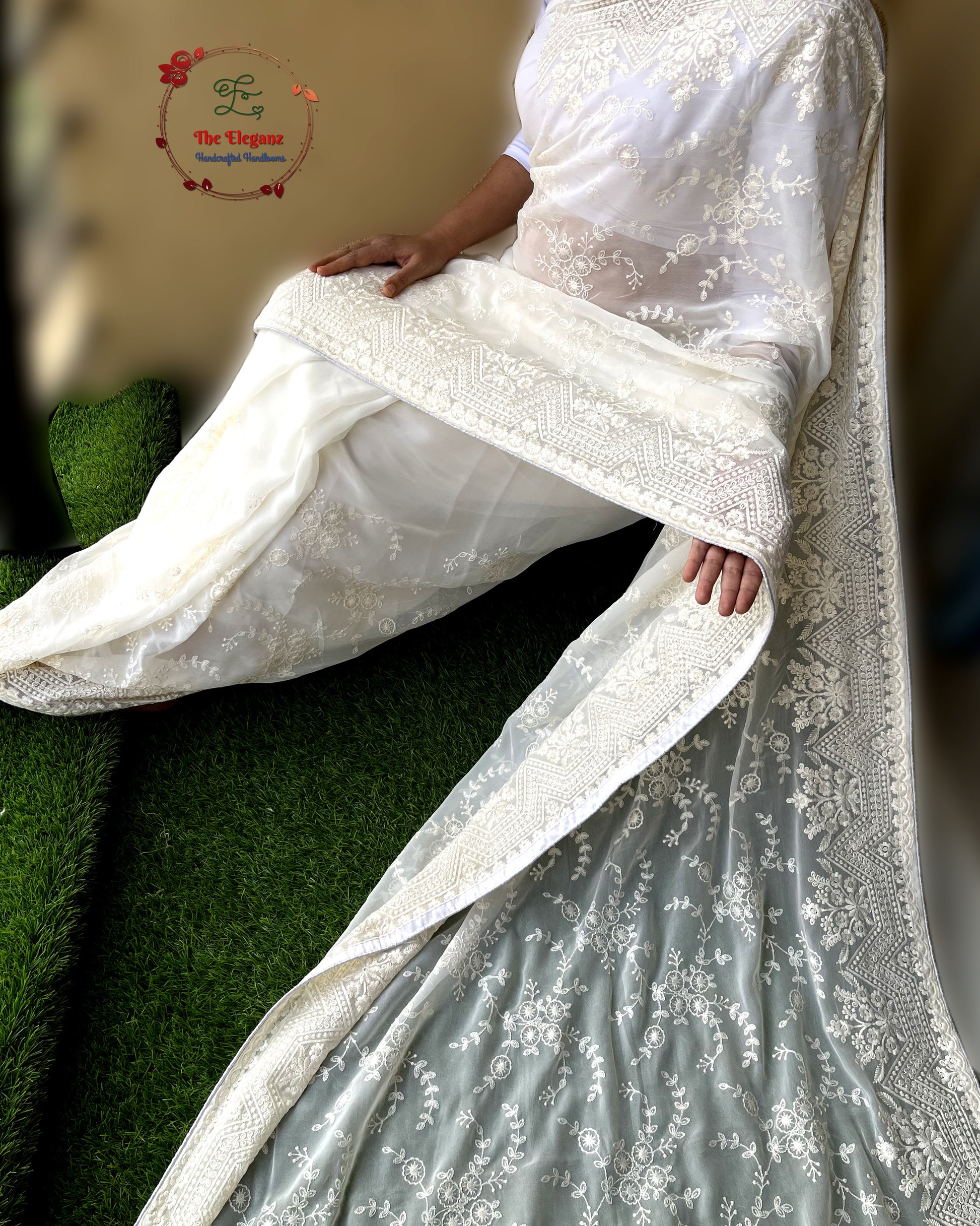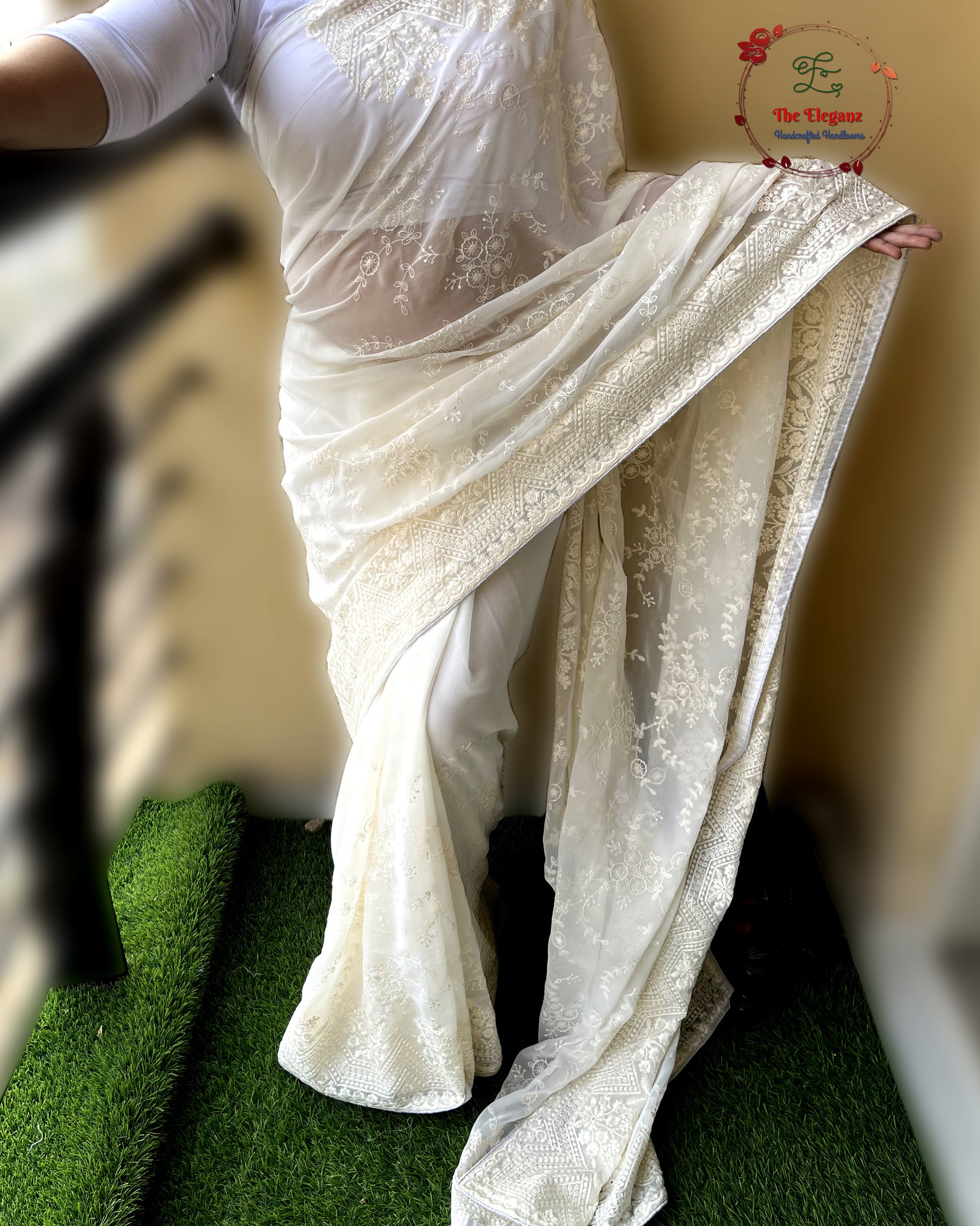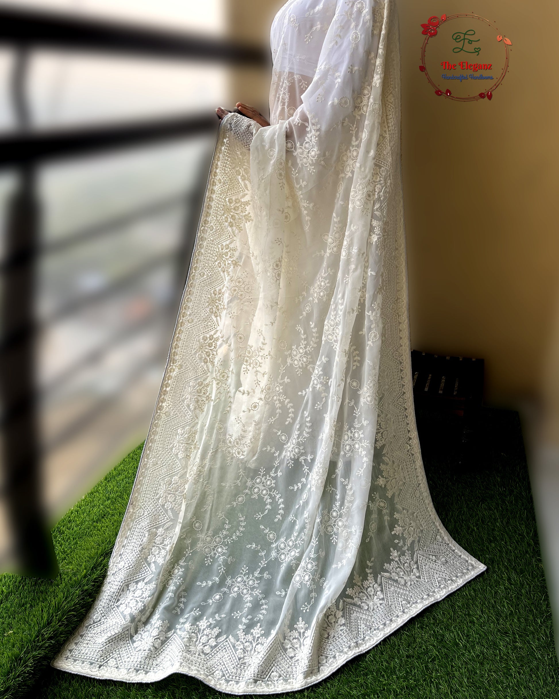 Noor-e-Safa is an all-white georgette saree that embodies timeless elegance. Adorned with intricate machine Chikankari embroidery, its floral vines and ornate border exude sophistication. The saree flows with a serene charm, making it an ethereal choice for weddings, festive gatherings, or spiritual occasions.