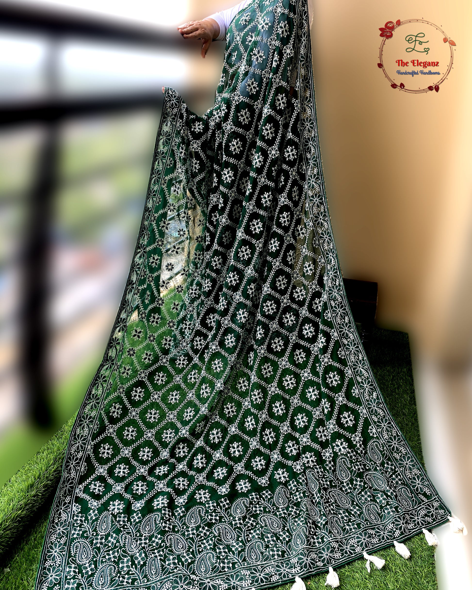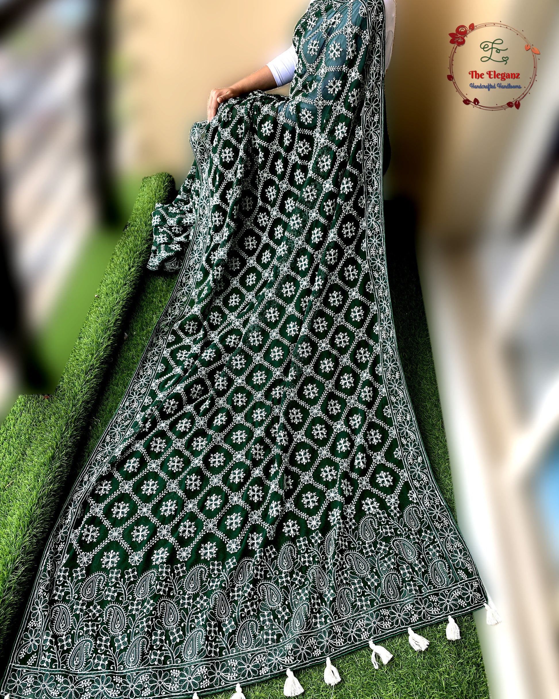 Like a serene garden bathed in moonlight, Sabzīn drapes you in timeless grace. The deep bottle green base contrasts beautifully with intricate white machine-embroidered Chikankari motifs, creating a look that is both classic and regal.