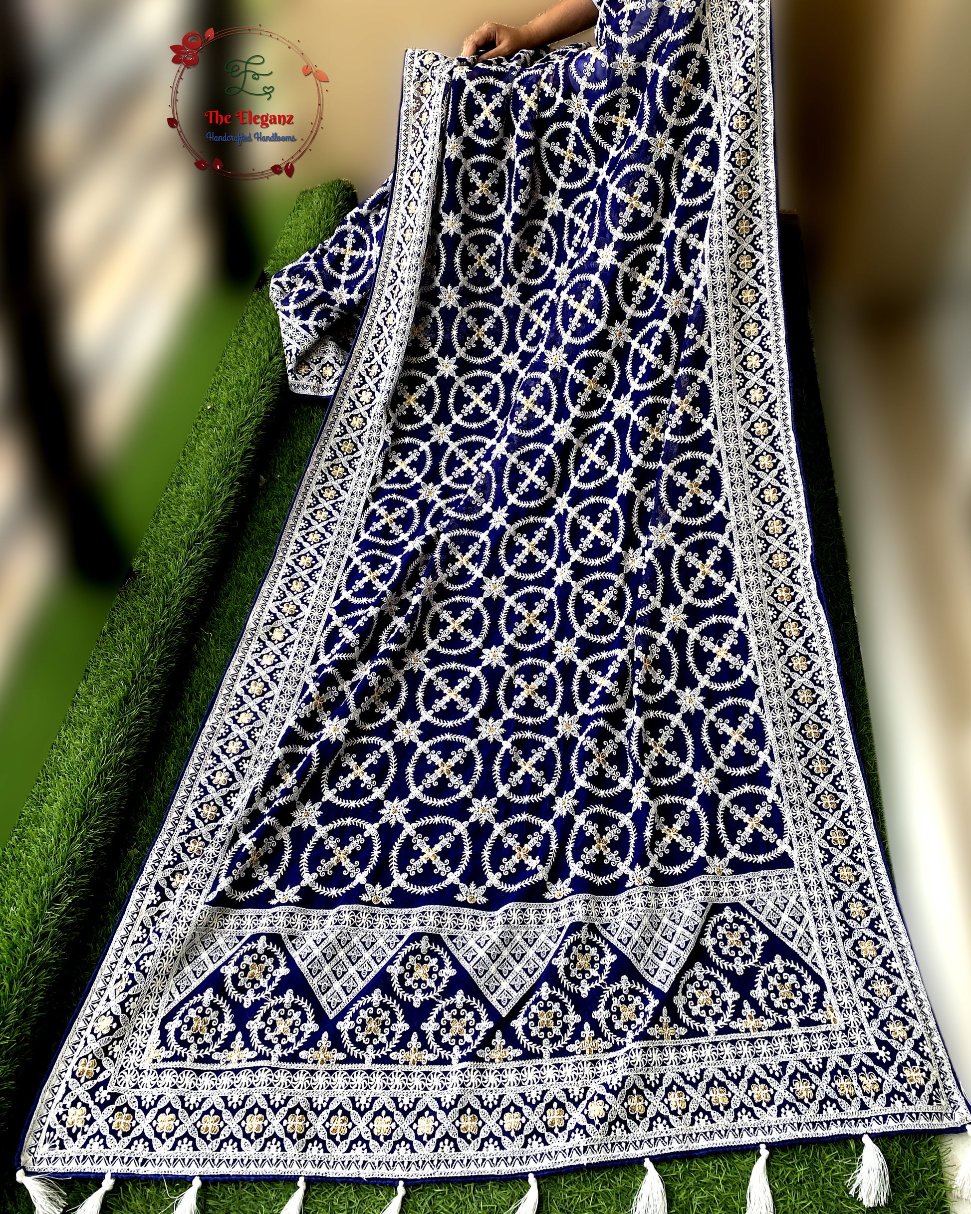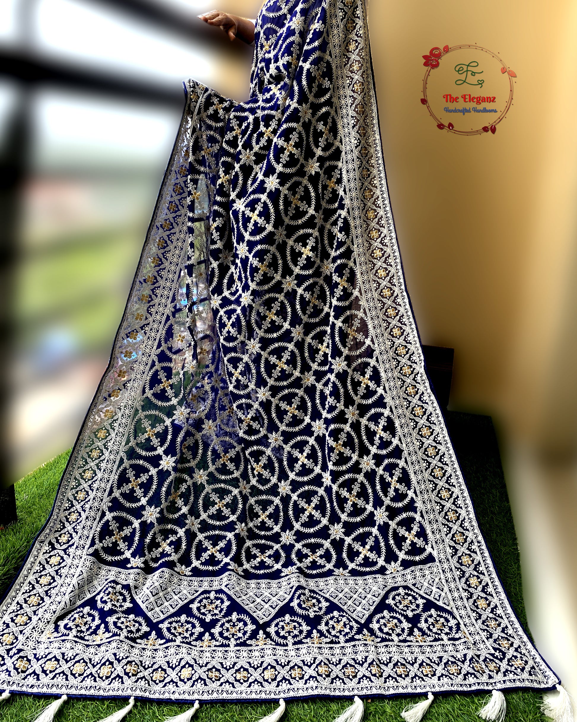 Wrapped in the depth of midnight blue, Neelma gleams like a rare sapphire under moonlight. The delicate white chikankari embroidery blooms like silver vines on a starlit sky, bringing grace and timeless charm to every drape.