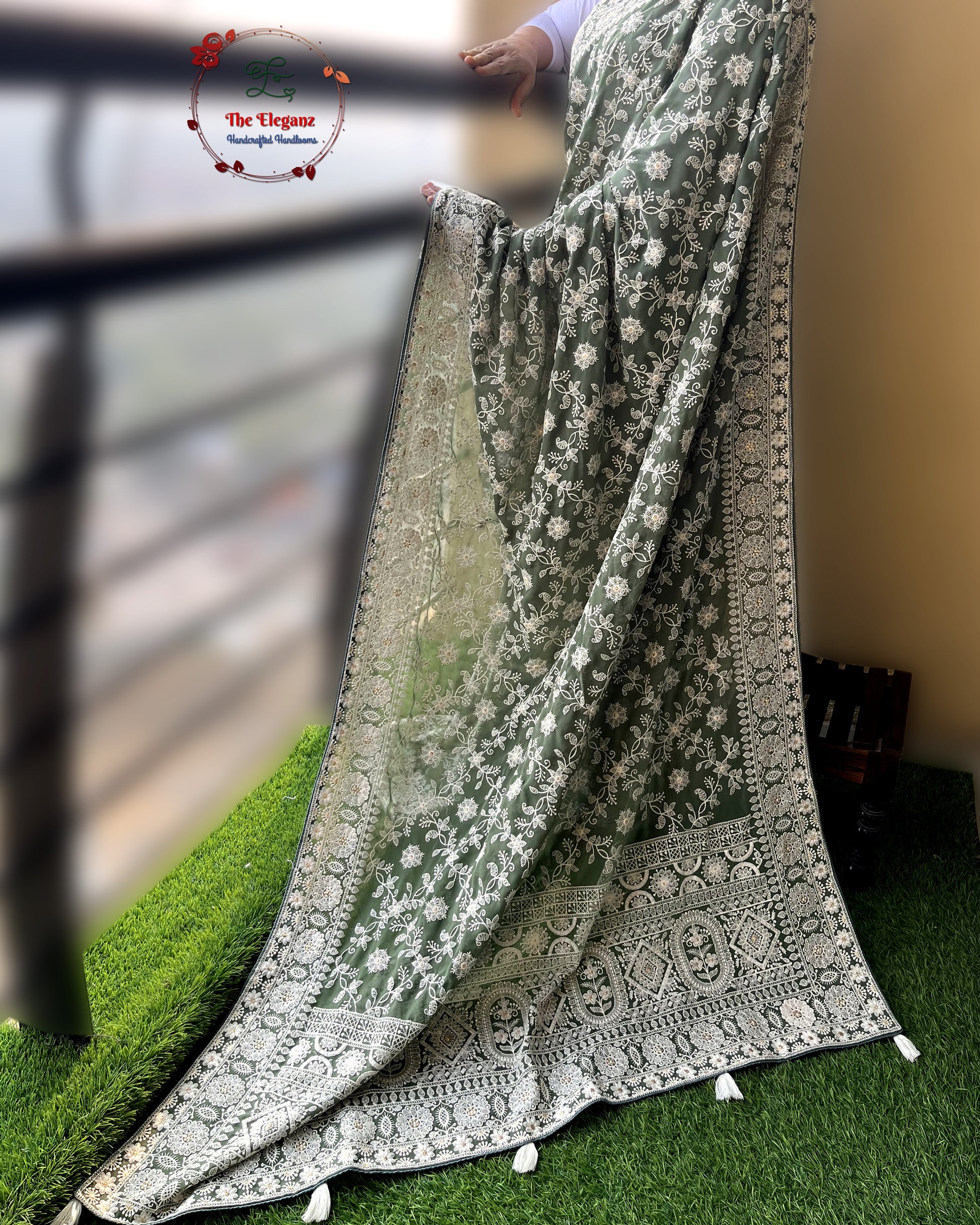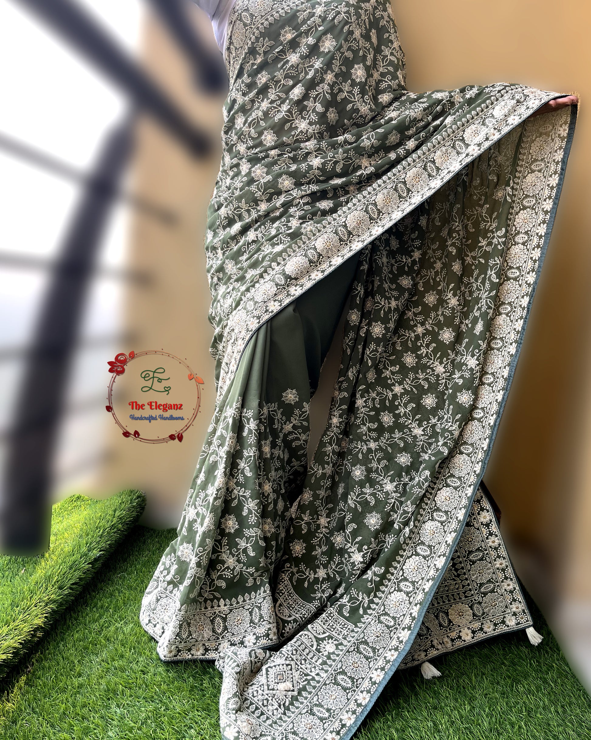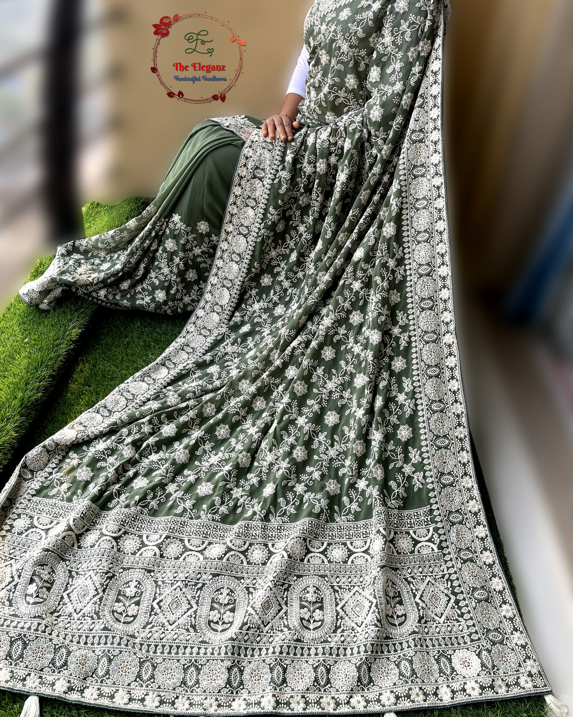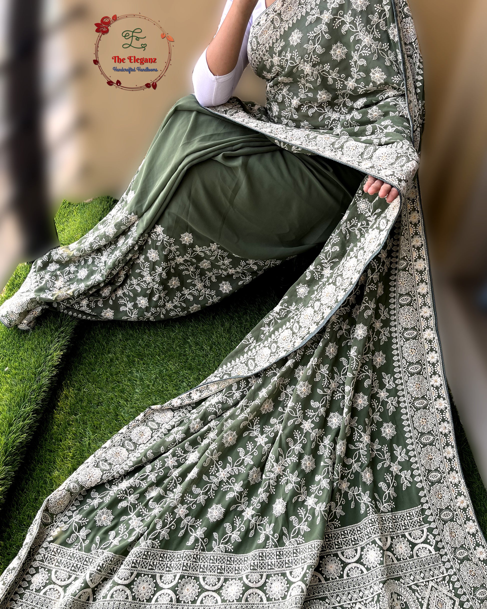 Sabzpari is a moss green georgette saree adorned with delicate all-over machine Chikankari embroidery. The intricate white floral vines bloom across the drape, complemented by an elaborately embroidered border and pallu. Its earthy elegance makes it a versatile pick for festive evenings, cultural gatherings, or sophisticated celebrations.