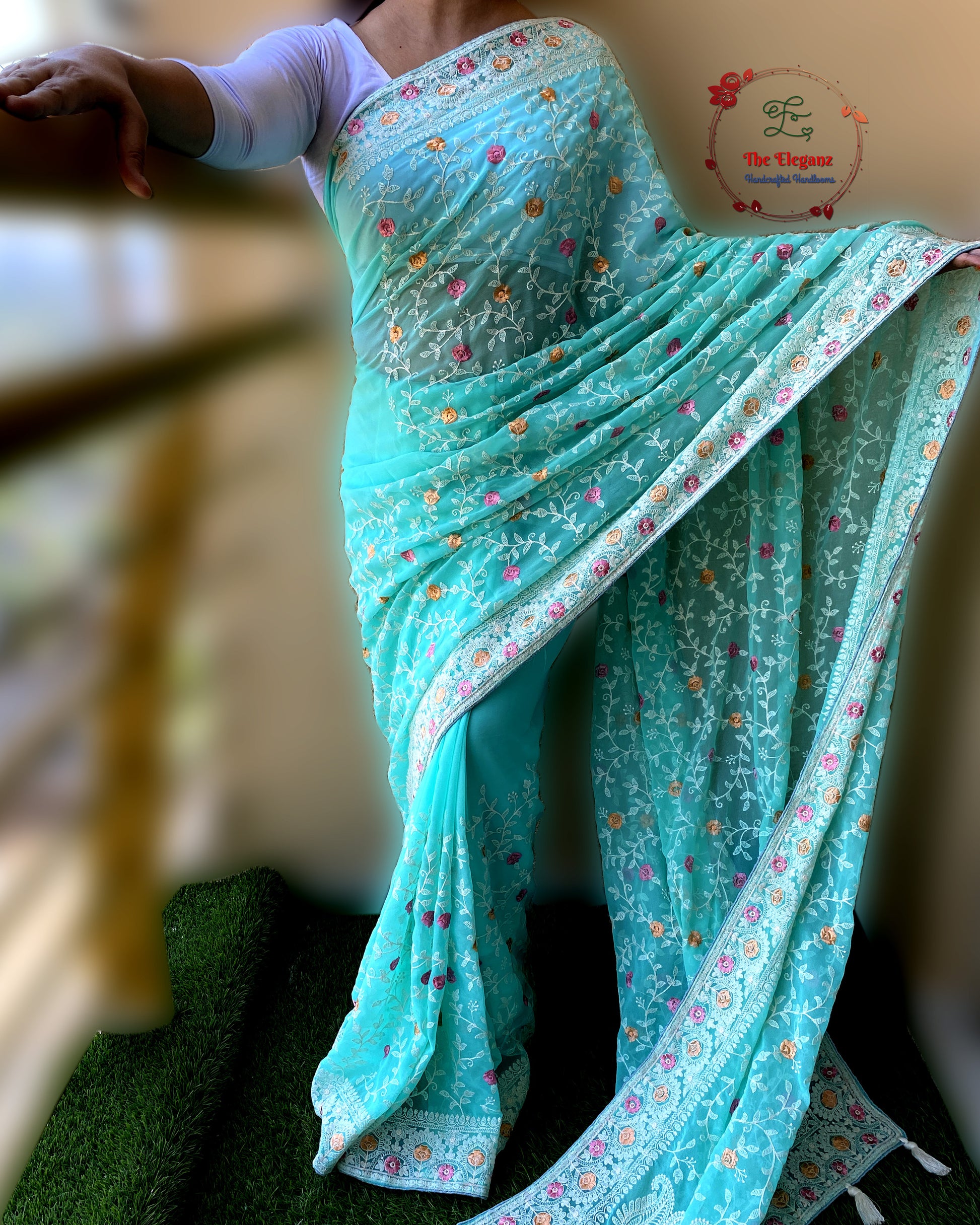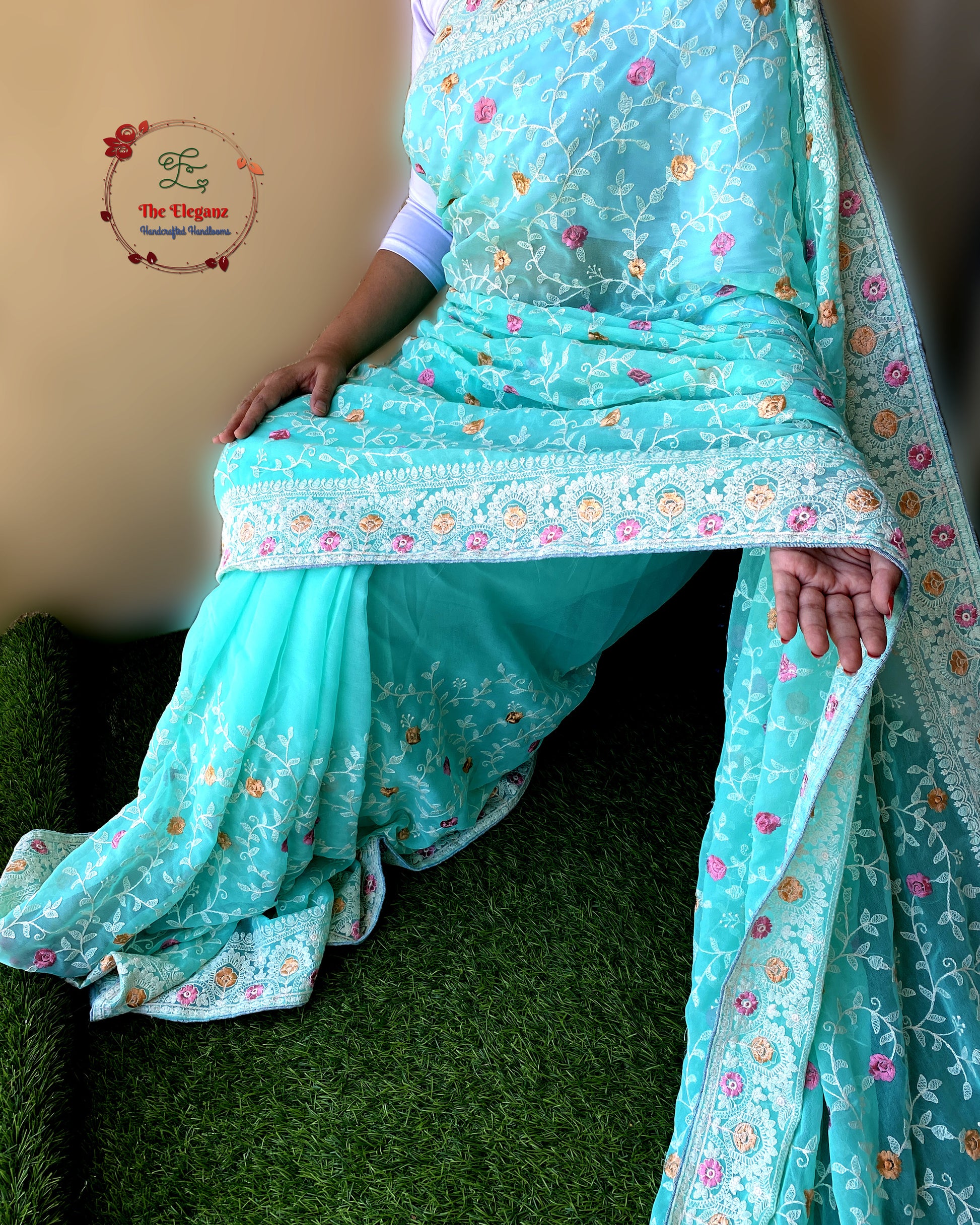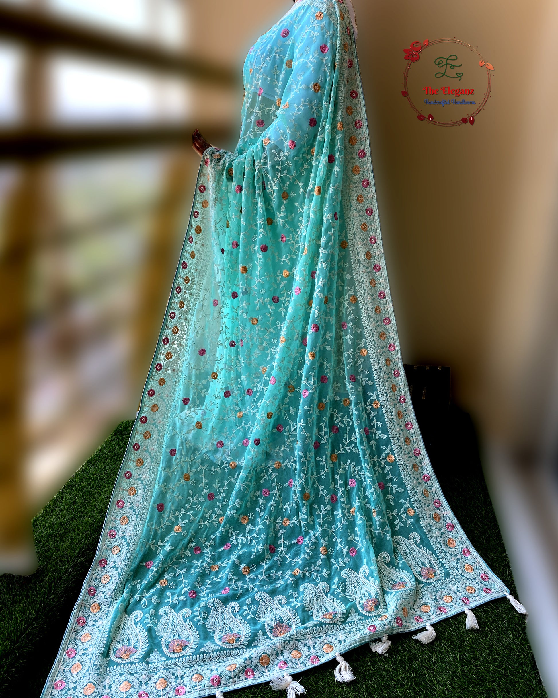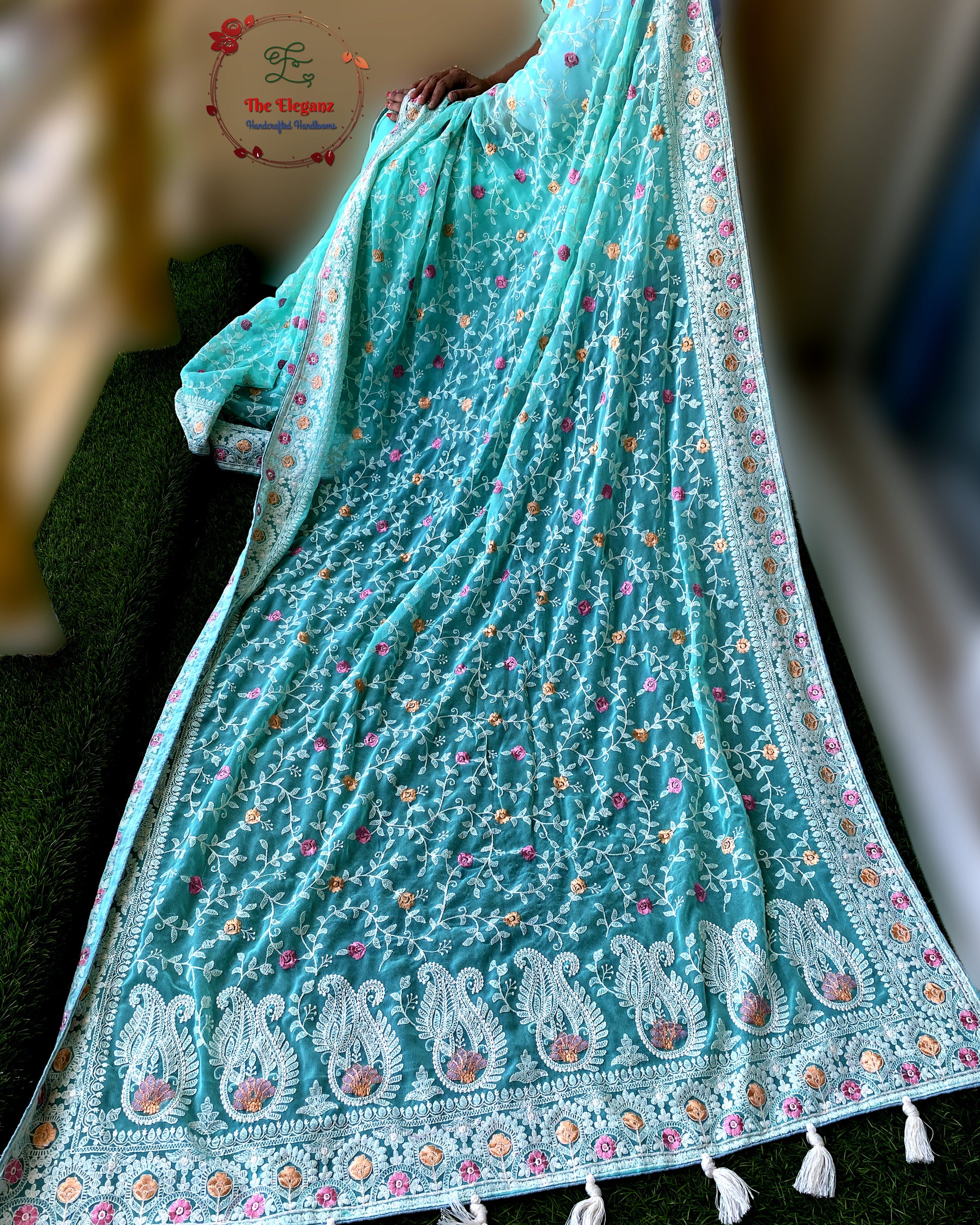 Ferozah is a delicate sea green georgette saree adorned with intricate machine Chikankari embroidery. The pastel base is brought alive with floral vines in soft hues of pink and peach, bordered with paisley motifs that enhance its graceful charm. Its light drape and soothing colour make it a timeless choice for festive mornings, casual gatherings, and summer soirées.
