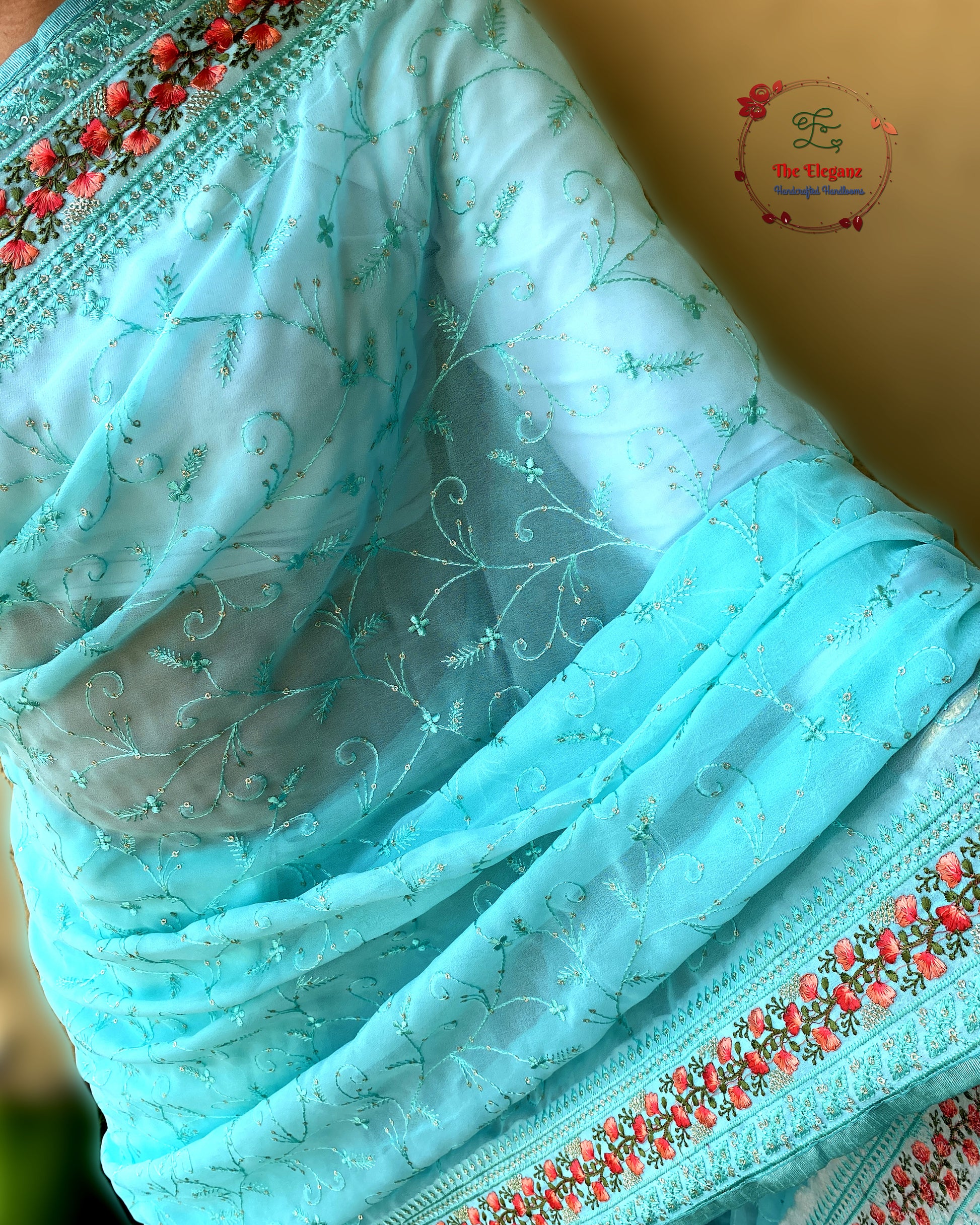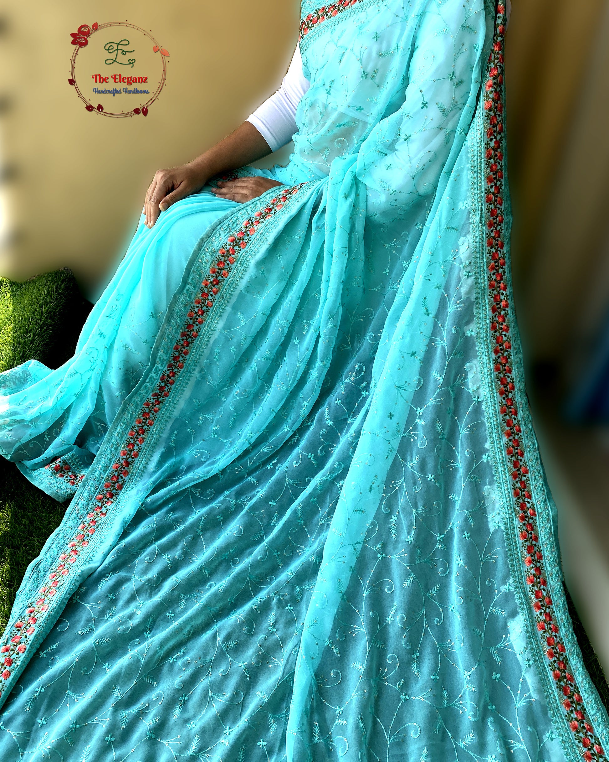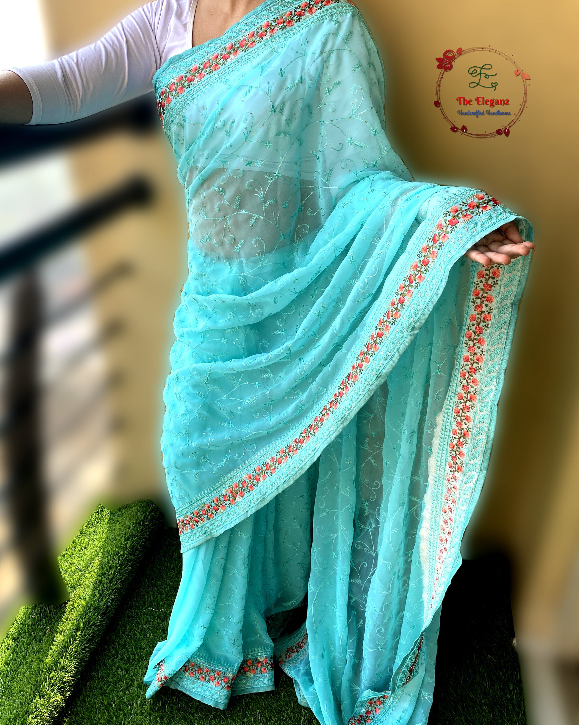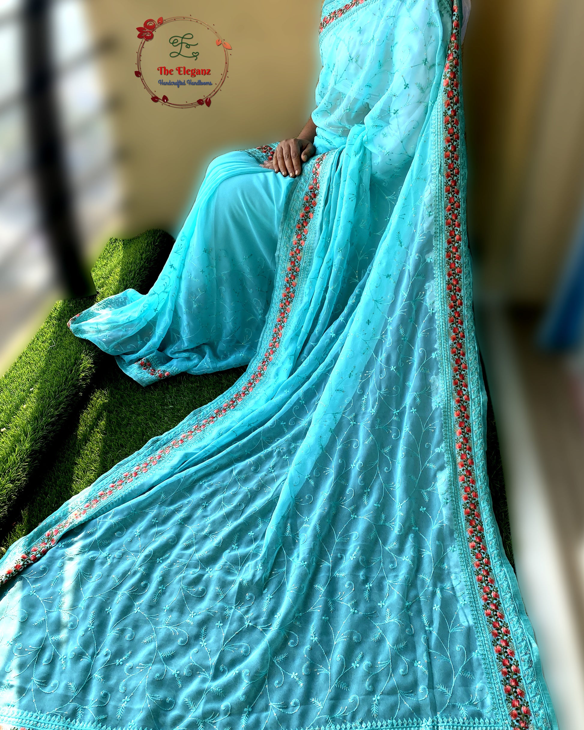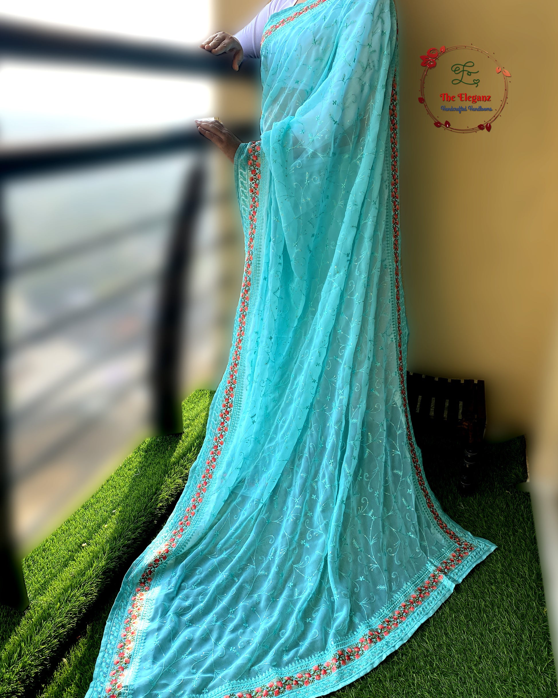 Firdaus is a turquoise blue georgette saree that feels as refreshing as a cool breeze. Embellished with delicate machine Chikankari embroidery and highlighted with a contrasting floral border in red and green, this saree blends subtle charm with striking detail. The flowing drape captures lightness and grace, making it perfect for daytime gatherings, festive occasions, or elegant evenings.