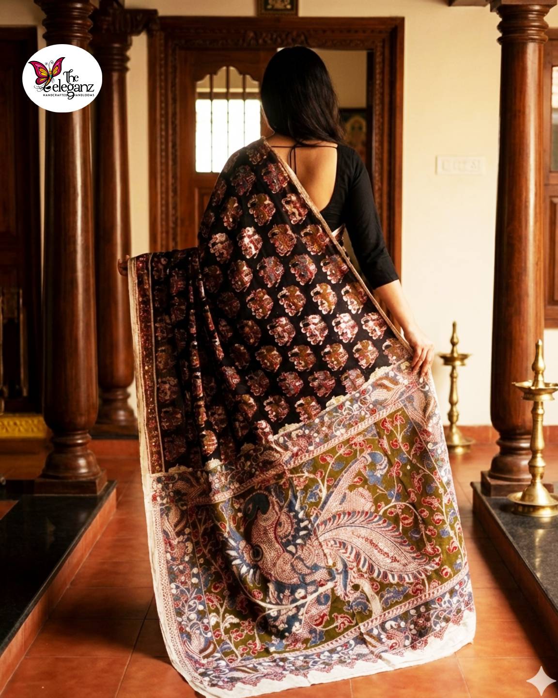 With its regal elephant motifs and exquisite peacock pallu, Gajagamini is an ode to timeless elegance. Hand-printed in traditional Kalamkari style, this pure cotton saree tells stories of heritage and artistry in every intricate detail. The earthy palette of black, rust, and olive with natural dyes enhances its handcrafted charm, while the soft cotton weave ensures all-day comfort.