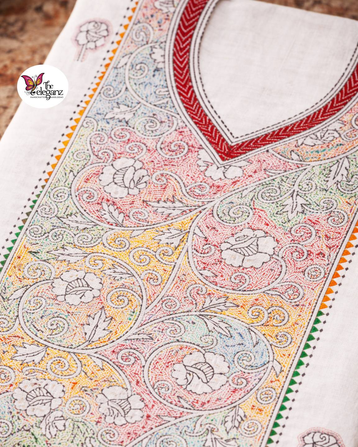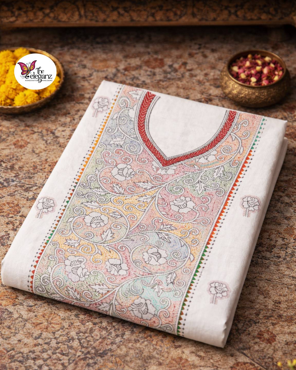 Delicate and timeless, this ivory Kantha suit piece is adorned with graceful rose motifs entwined in flowing vines. The soft multicolour threadwork adds depth while maintaining a gentle, romantic aesthetic.