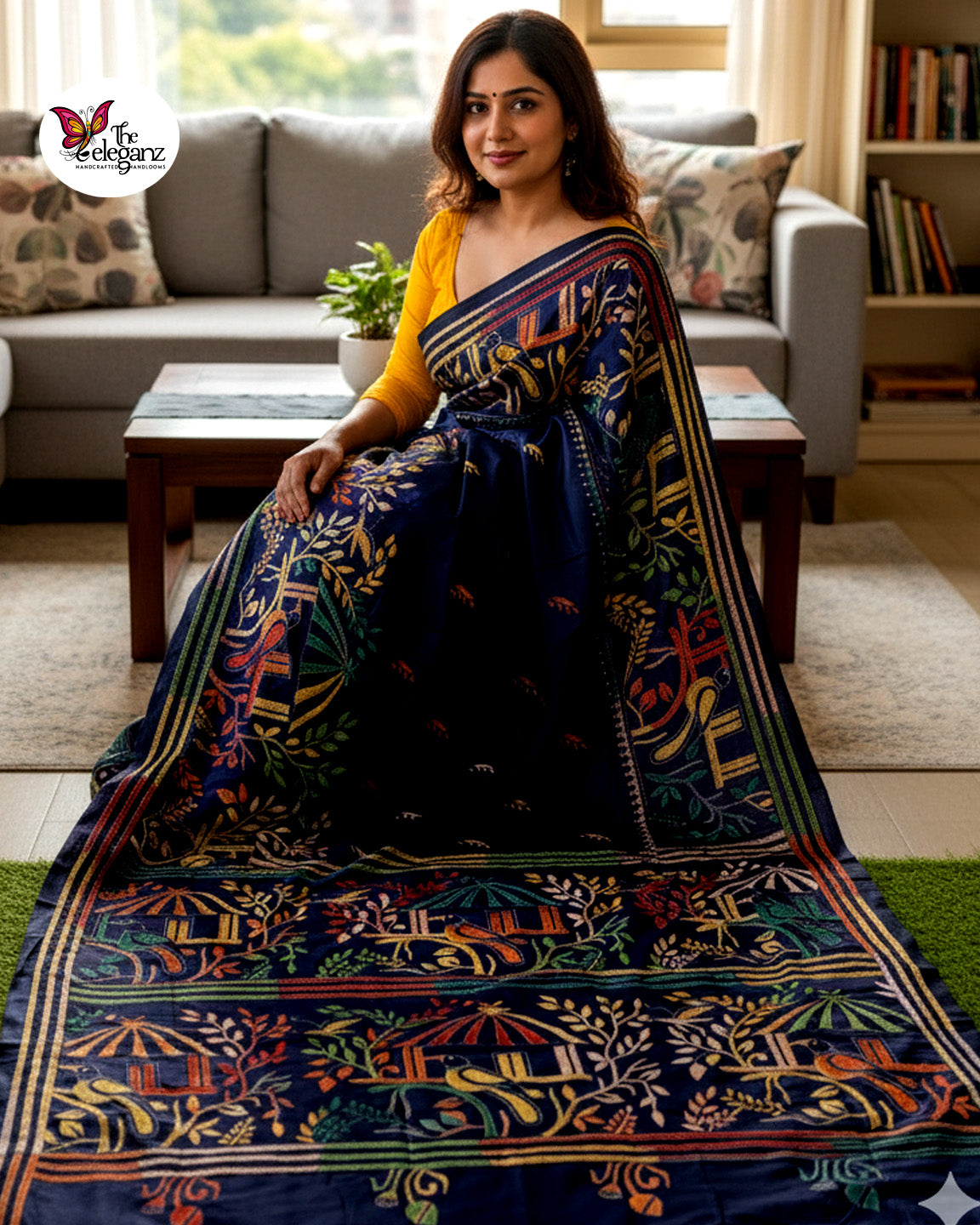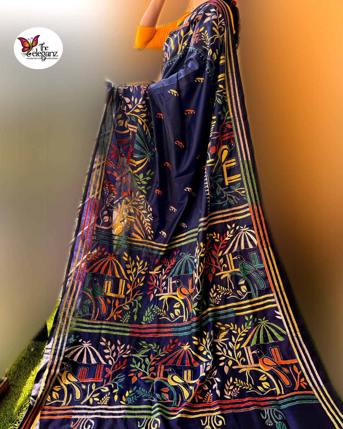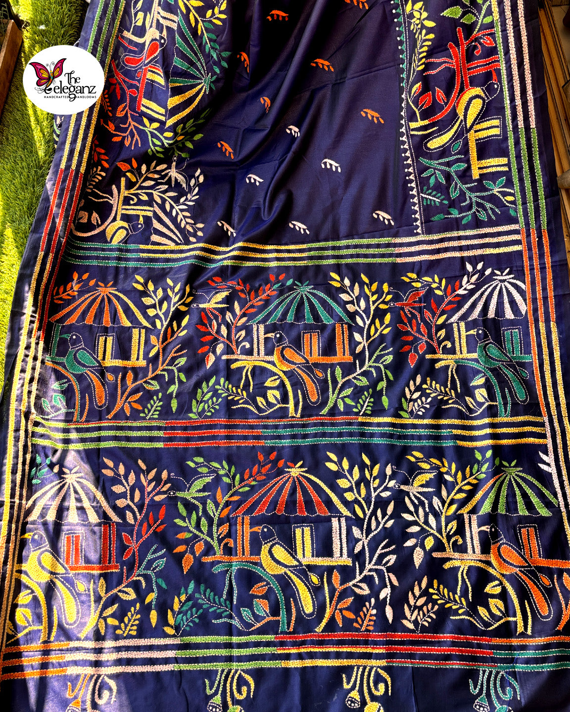 Disclaimer: Handcrafted Kantha saree made on blended Bangalore silk. Minor irregularities, uneven textures, stitch variations, or light stains are natural to the handcrafting process and are not considered defects.