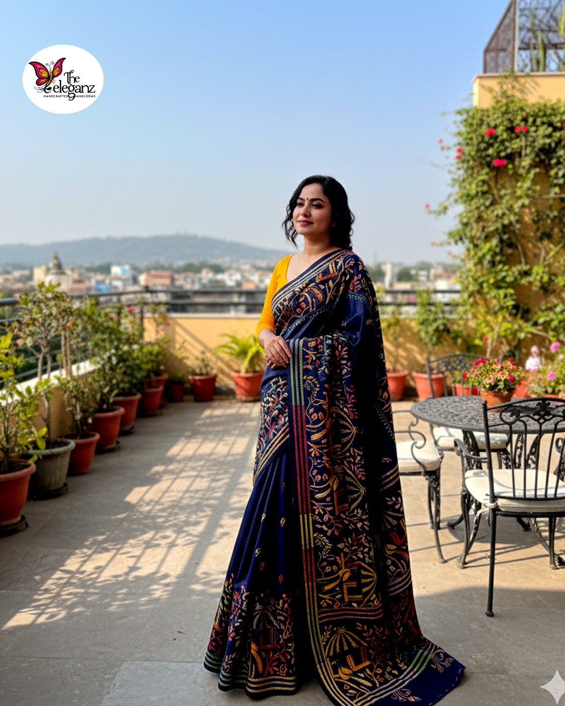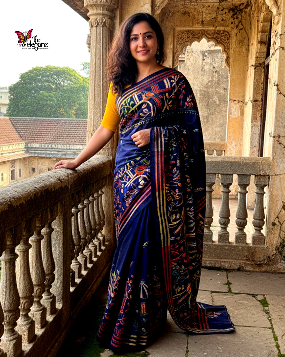 The deep navy base perfectly complements the multicoloured threadwork, making the saree visually rich yet effortlessly elegant. Lightweight, fluid and artisanal, Grihalekha is ideal for those who appreciate sarees that celebrate culture through detailed handwork.