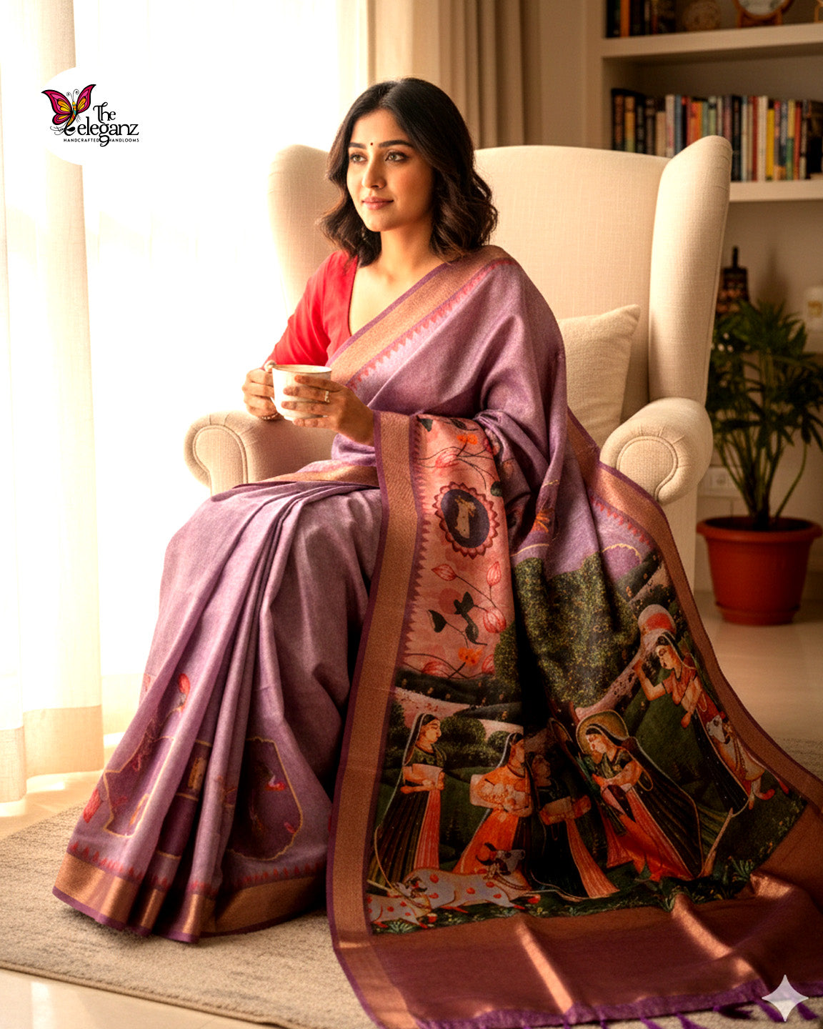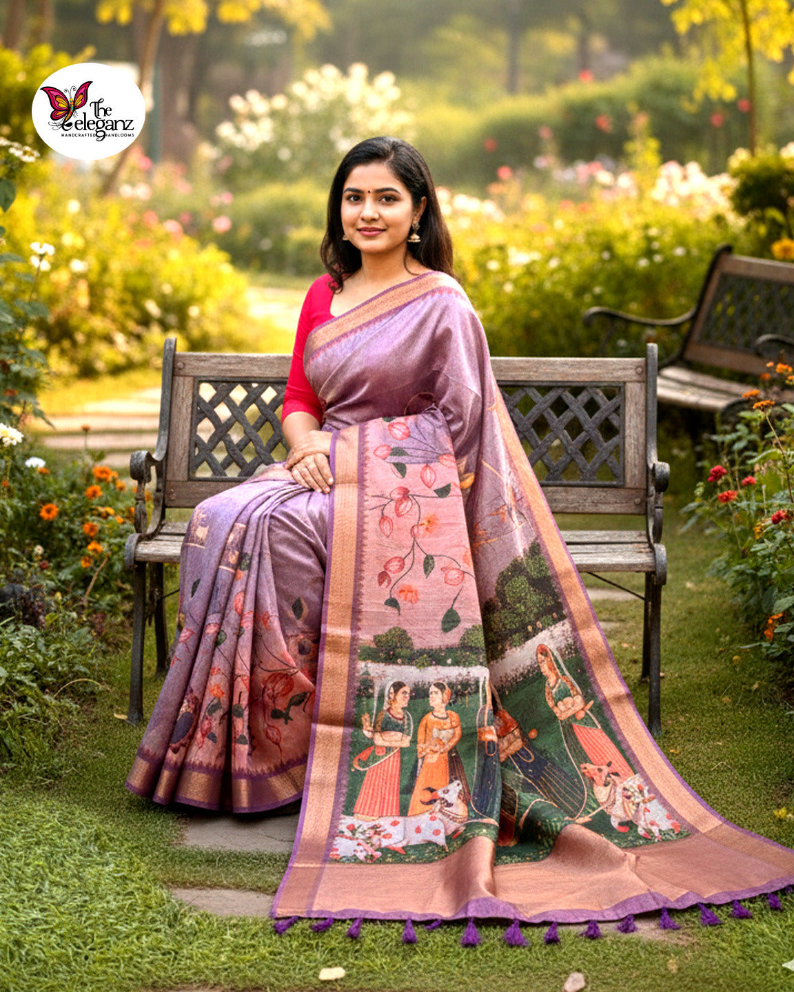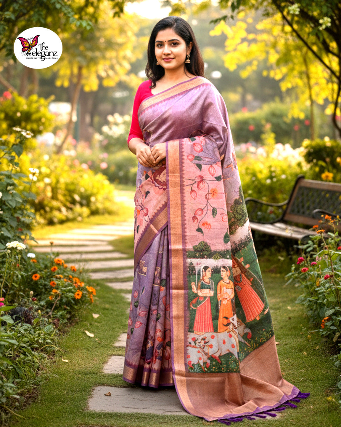 Gulbahar Grove is a graceful Tissue Pichwai soft silk saree that brings traditional storytelling to life through delicate prints and soft hues. Set in a muted lilac-purple base with blush and earthy accents, the saree features intricate Pichwai-inspired artwork depicting pastoral scenes, florals, and gentle narrative motifs. Lightweight with a subtle sheen, it drapes beautifully—making it ideal for festive mornings, cultural gatherings, temple visits, or art-inspired celebrations.