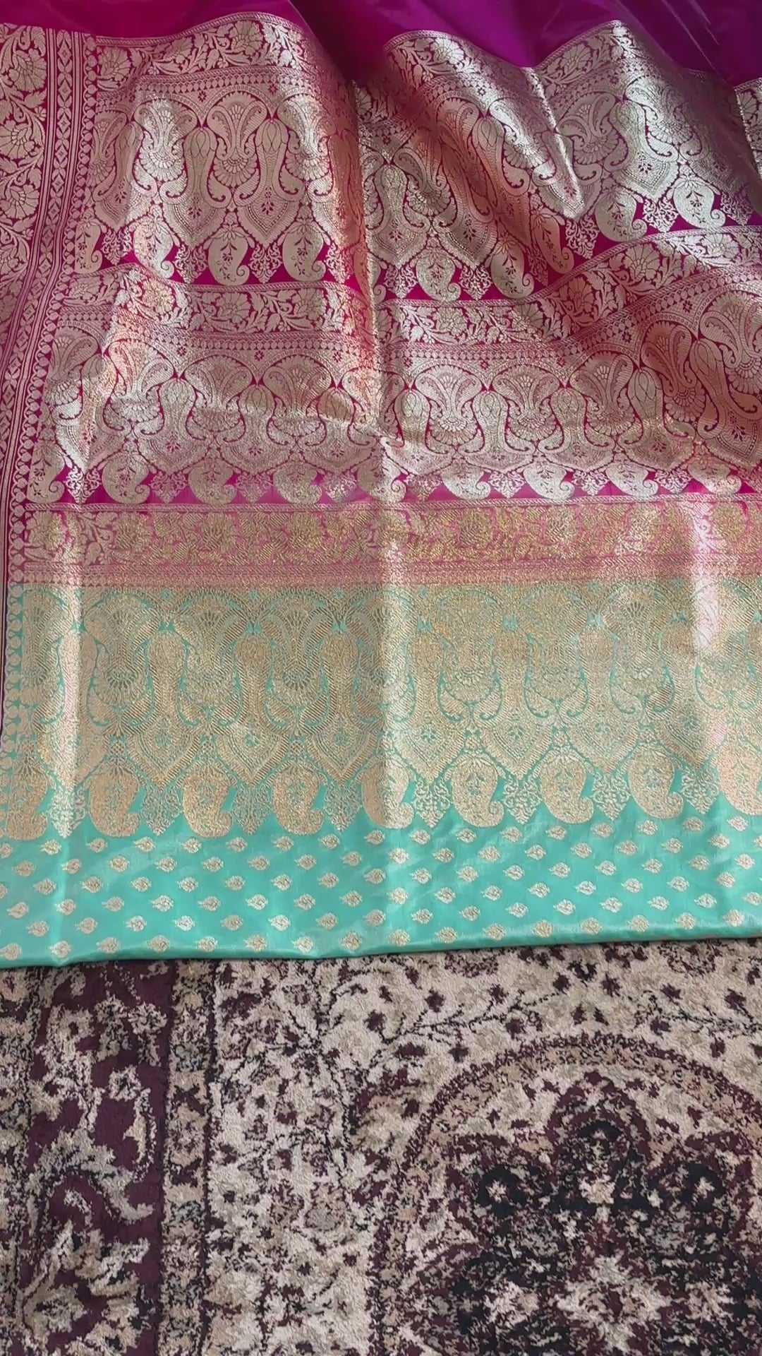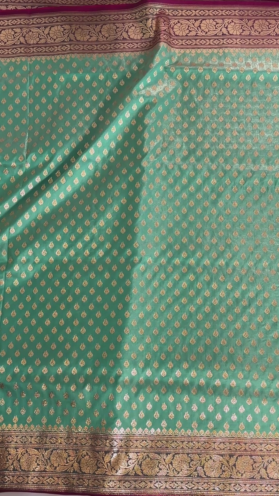 Hariprabha radiates dual beauty – a serene green body shimmering with golden bootis and a contrasting rich magenta Patli Pallu adorned with blooming floral zari vines. This saree carries the timeless grandeur of Banaras while embracing the distinct grace of Patli Pallu weaving. A saree where tradition blooms in every thread.