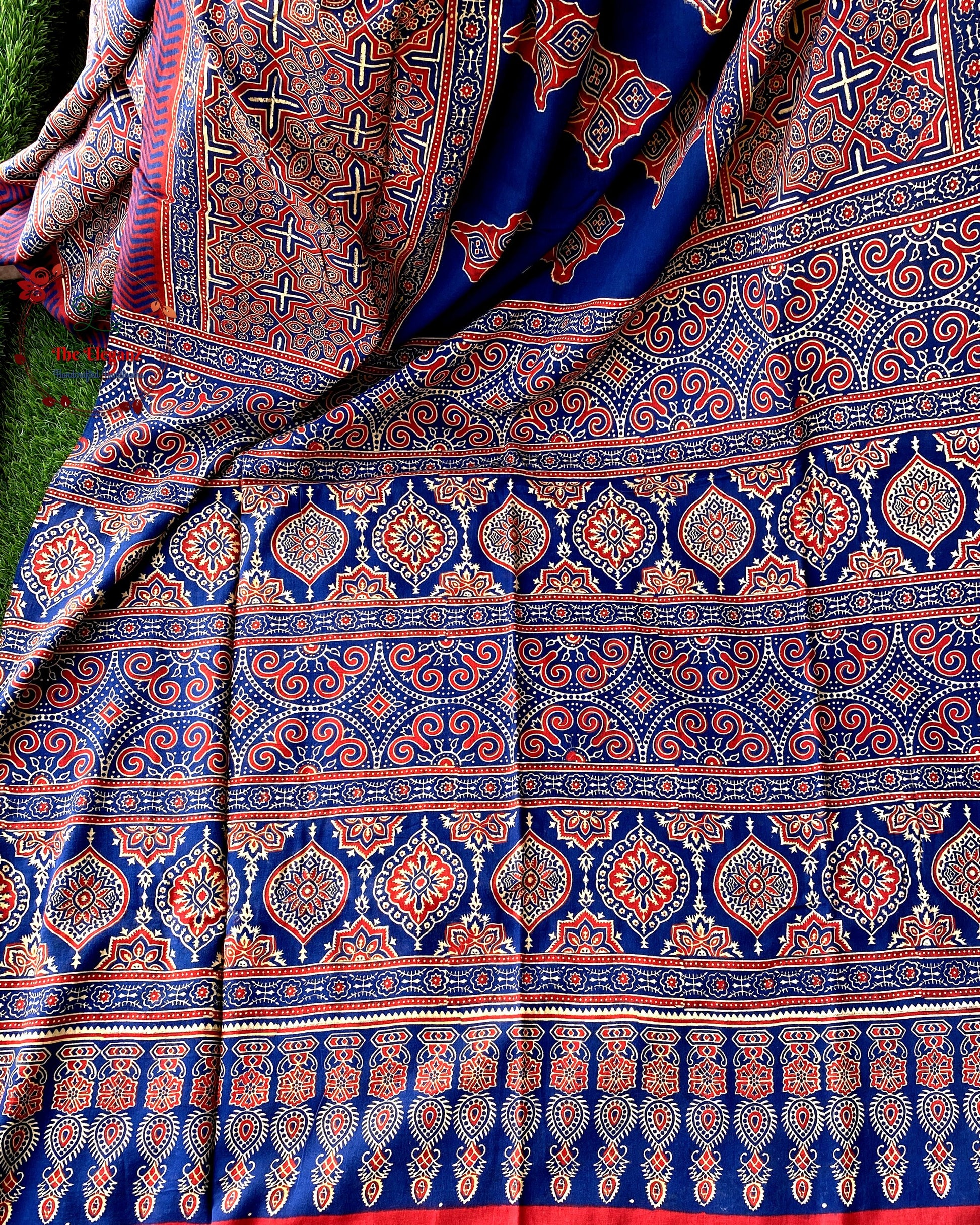 Striking geometric & floral Ajrakh motifs across body and pallu