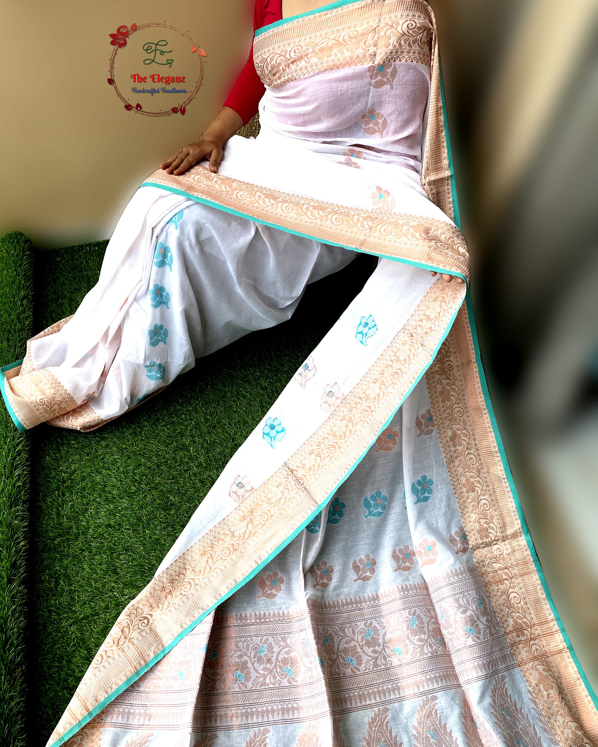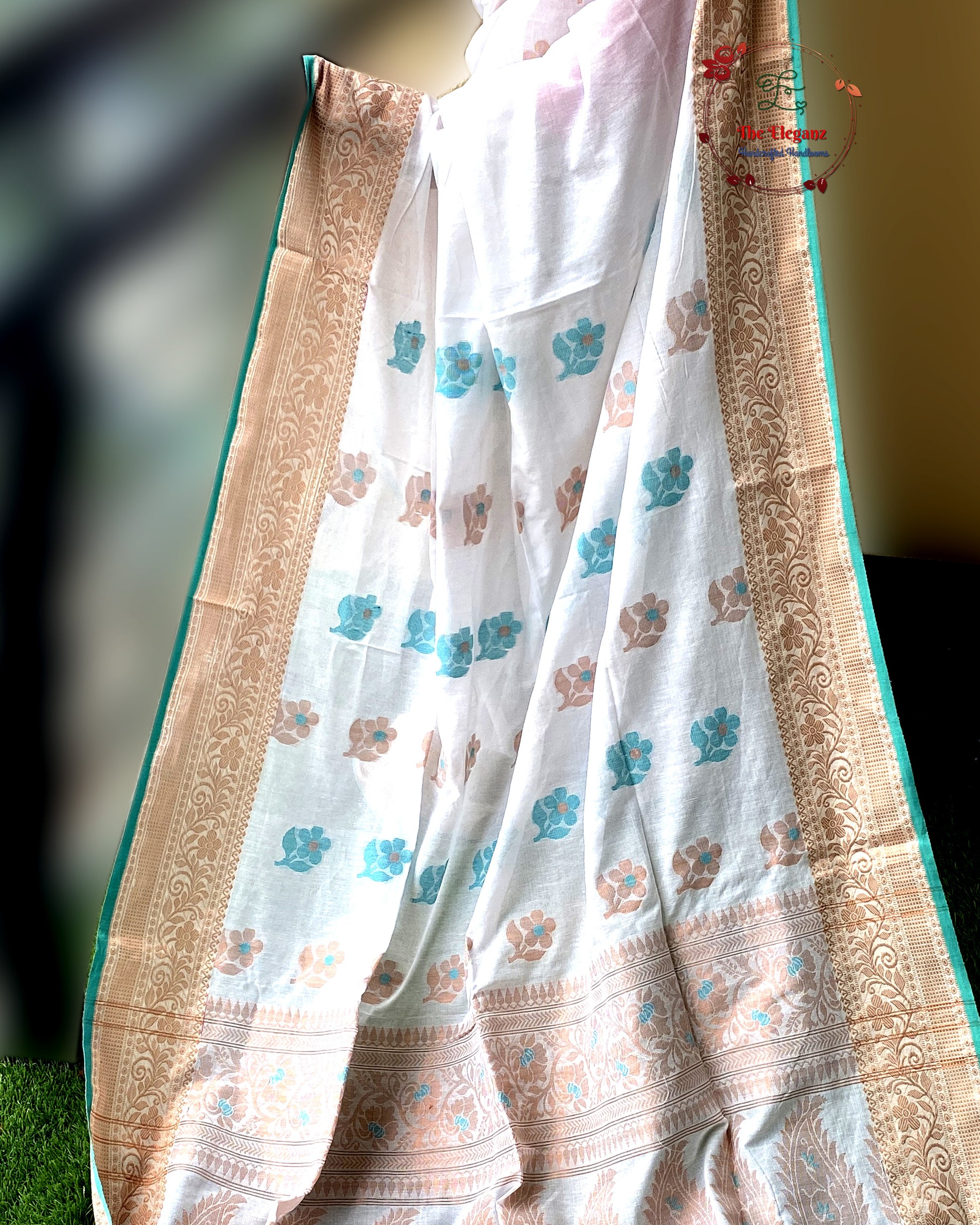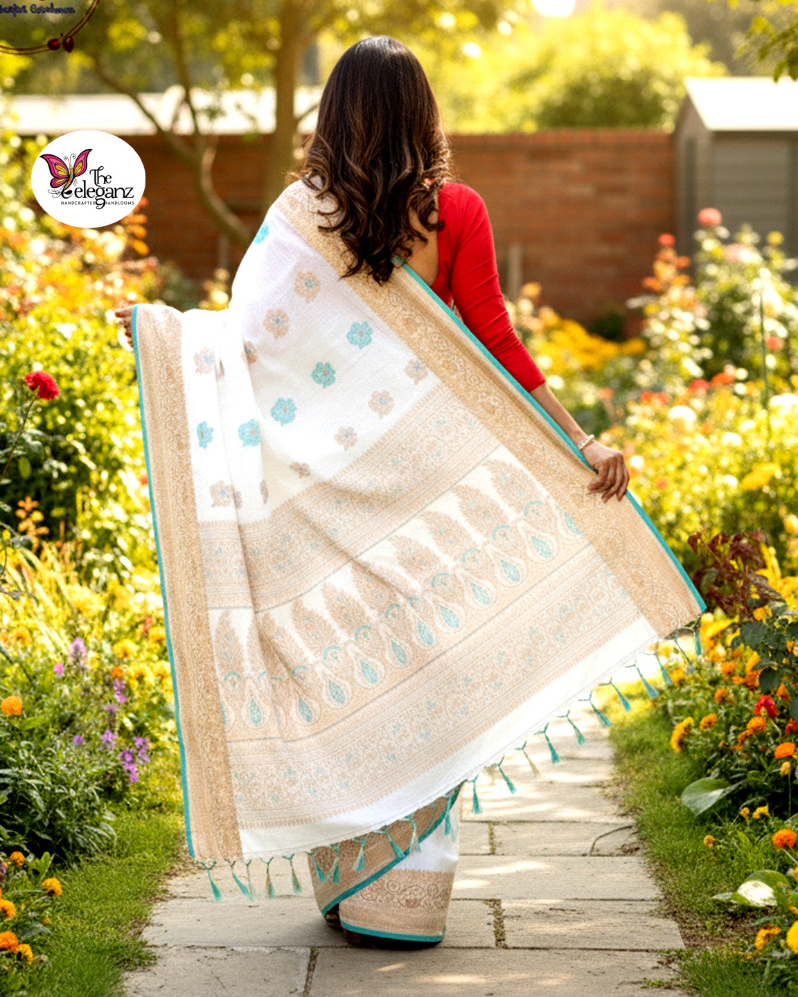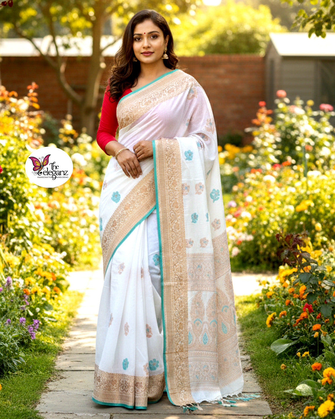 As calm as a morning hymn, Iraaya is woven in the purity of premium cotton with the intricate grace of Banarasi craftsmanship. Its soft white body, kissed with turquoise and beige-gold zari motifs, carries the essence of serenity and subtle grandeur. Handloomed to perfection, Iraaya celebrates simplicity as the truest form of sophistication.