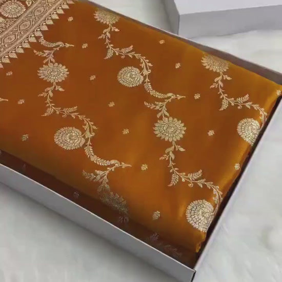 Like the first rays of dawn spilling over fields of marigolds, Kanak Prabha glows with an eternal radiance. The mustard yellow base, adorned with intricate floral zari work, captures the essence of heritage and festive grandeur. A saree that drapes you in light and opulence.