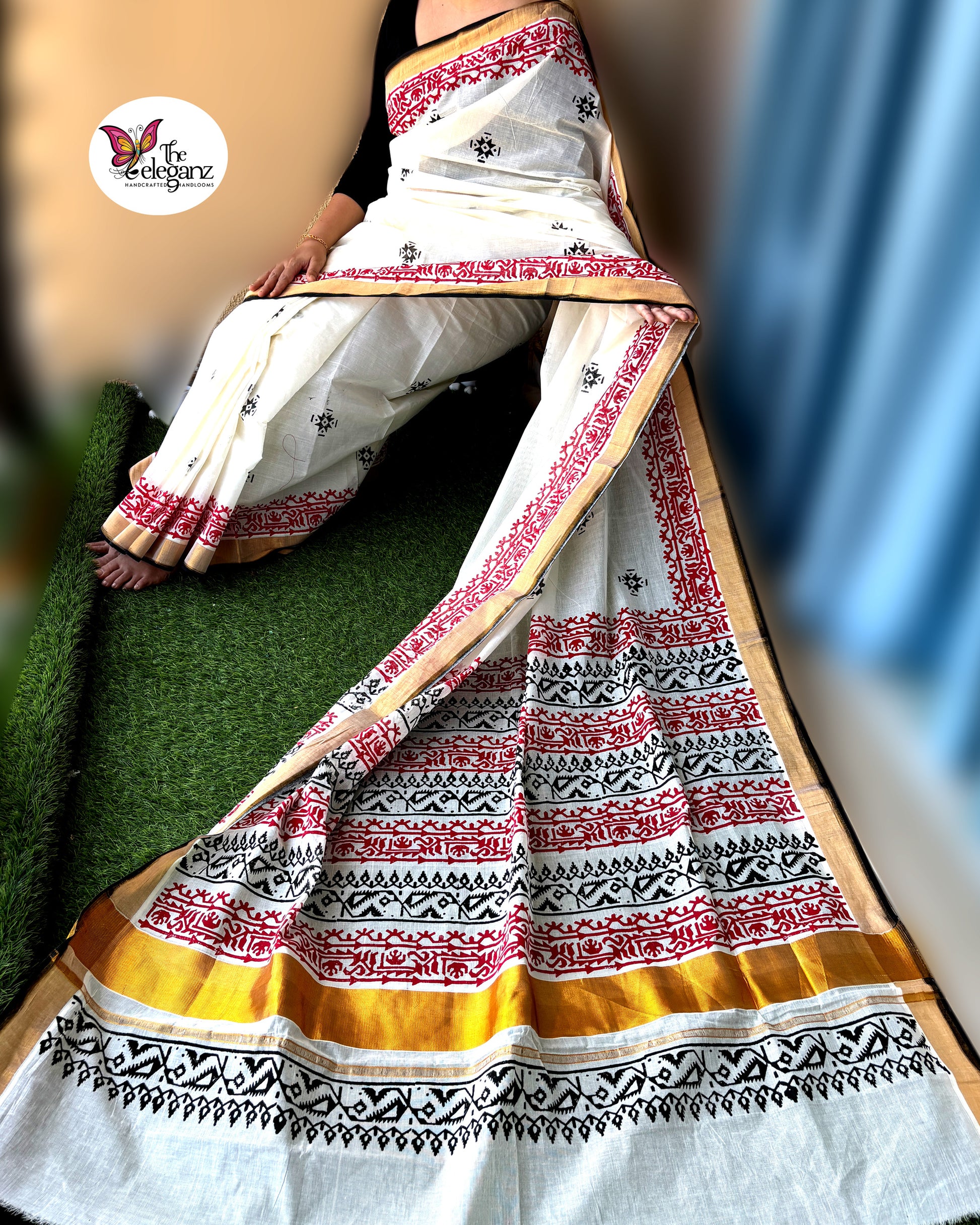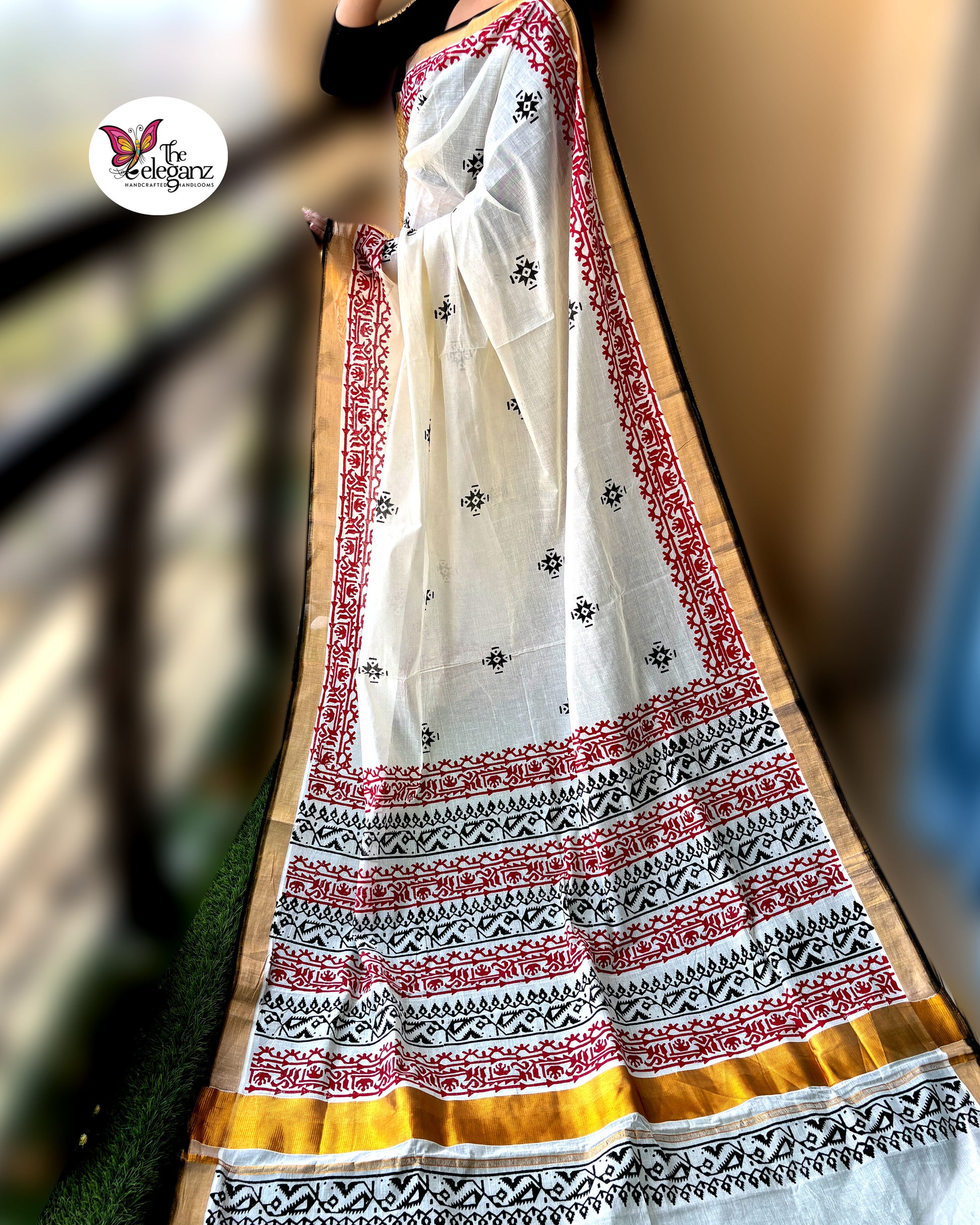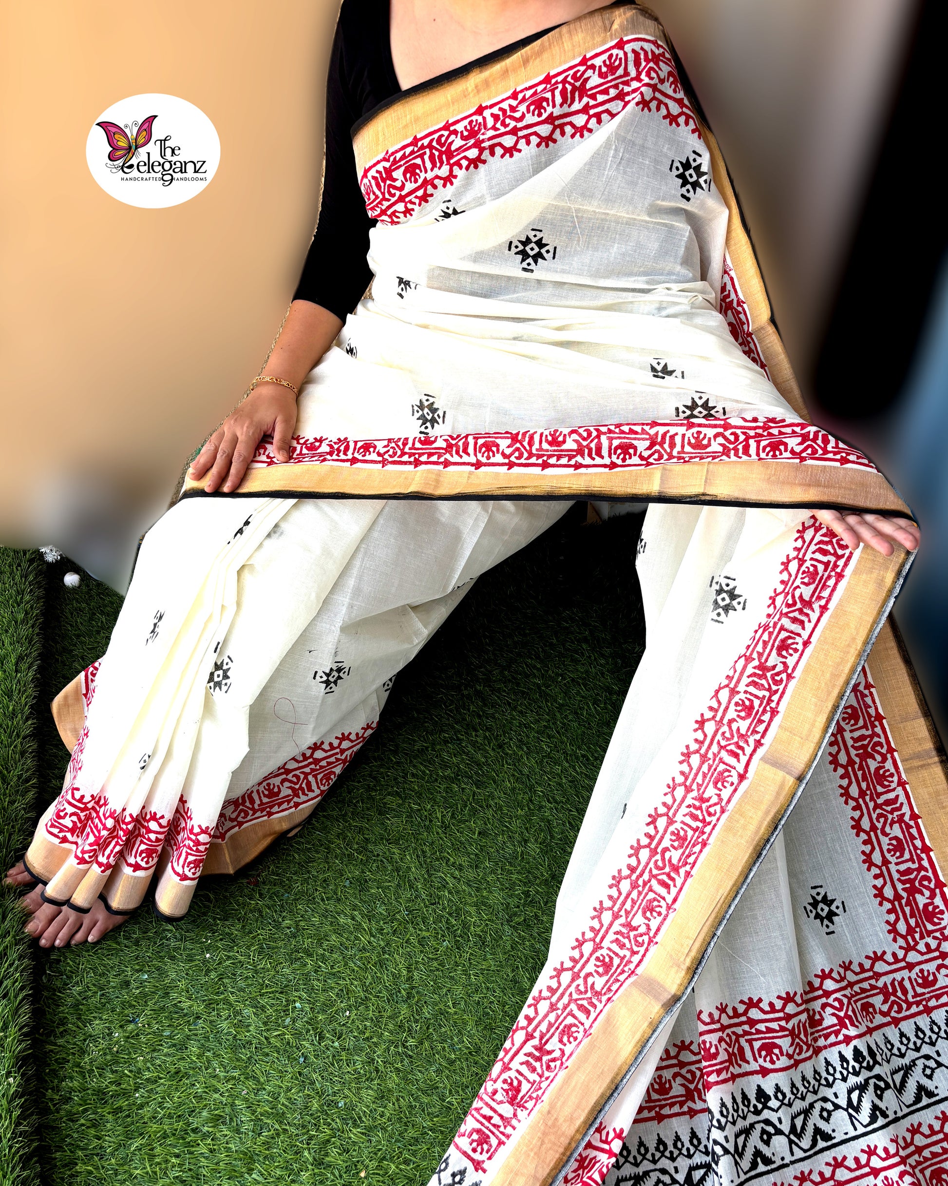 The Malati Kerala Cotton Jamdani style Saree is a classic drape woven in pristine white with striking Jamdani-inspired motifs in black and red. Accented with a golden border, it radiates elegance rooted in tradition, yet carries a lightness perfect for everyday grace or festive gatherings.