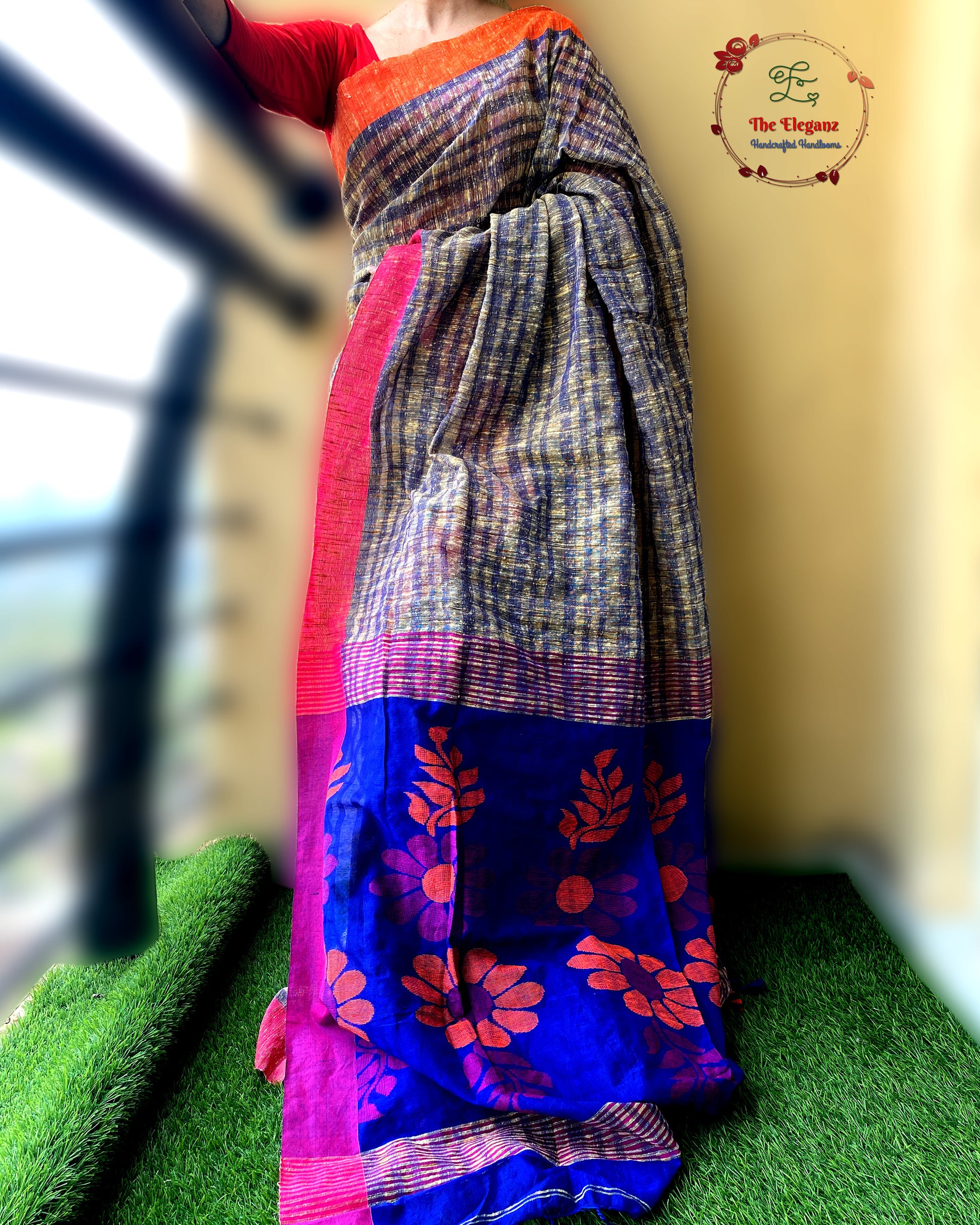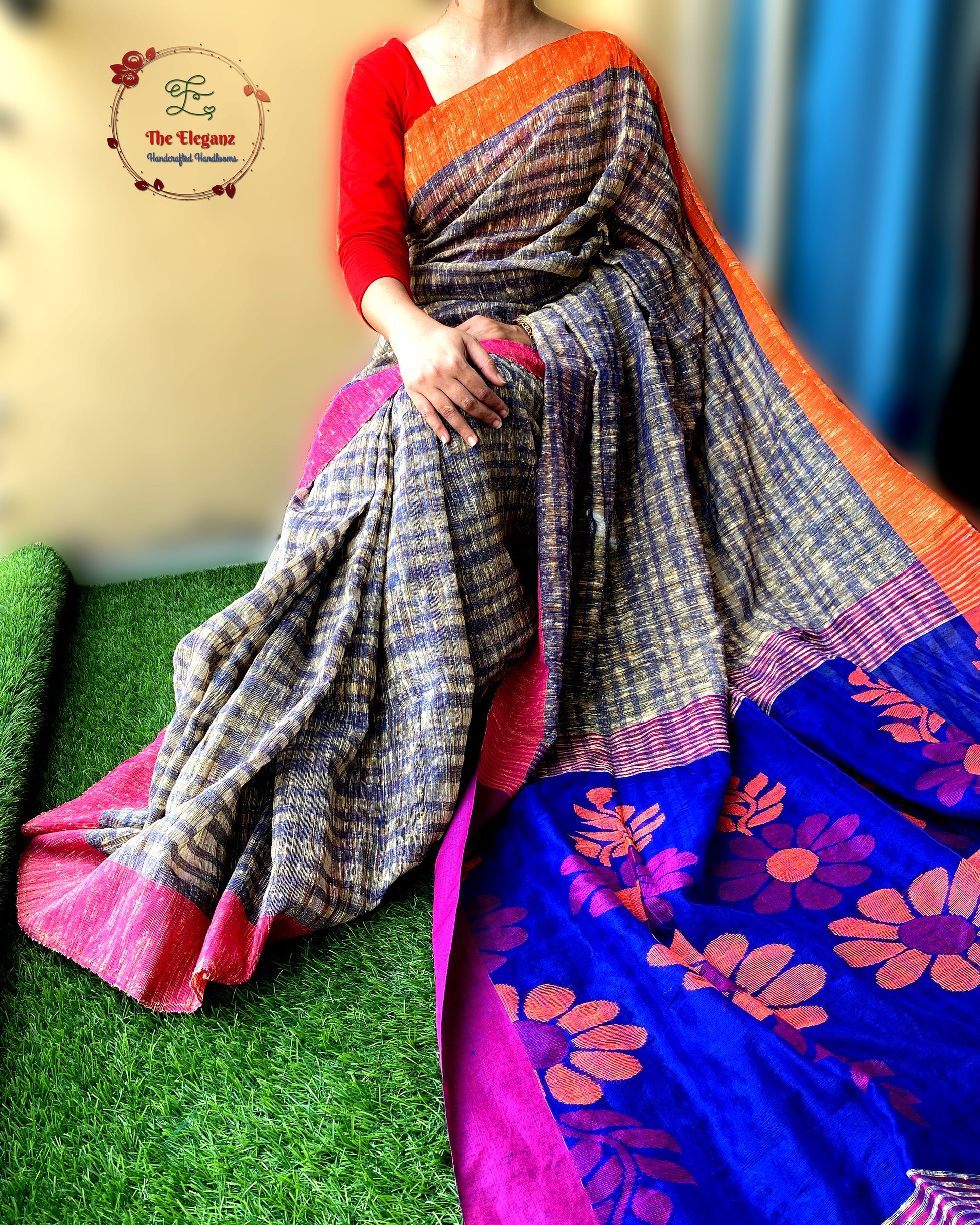 Colour: Multi-hued body in earthy checks with striking royal blue pallu and floral Jamdani motifs