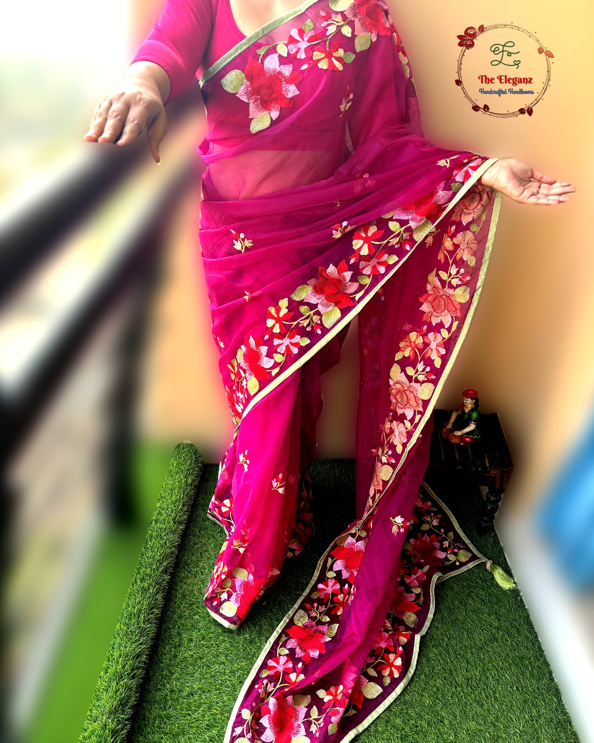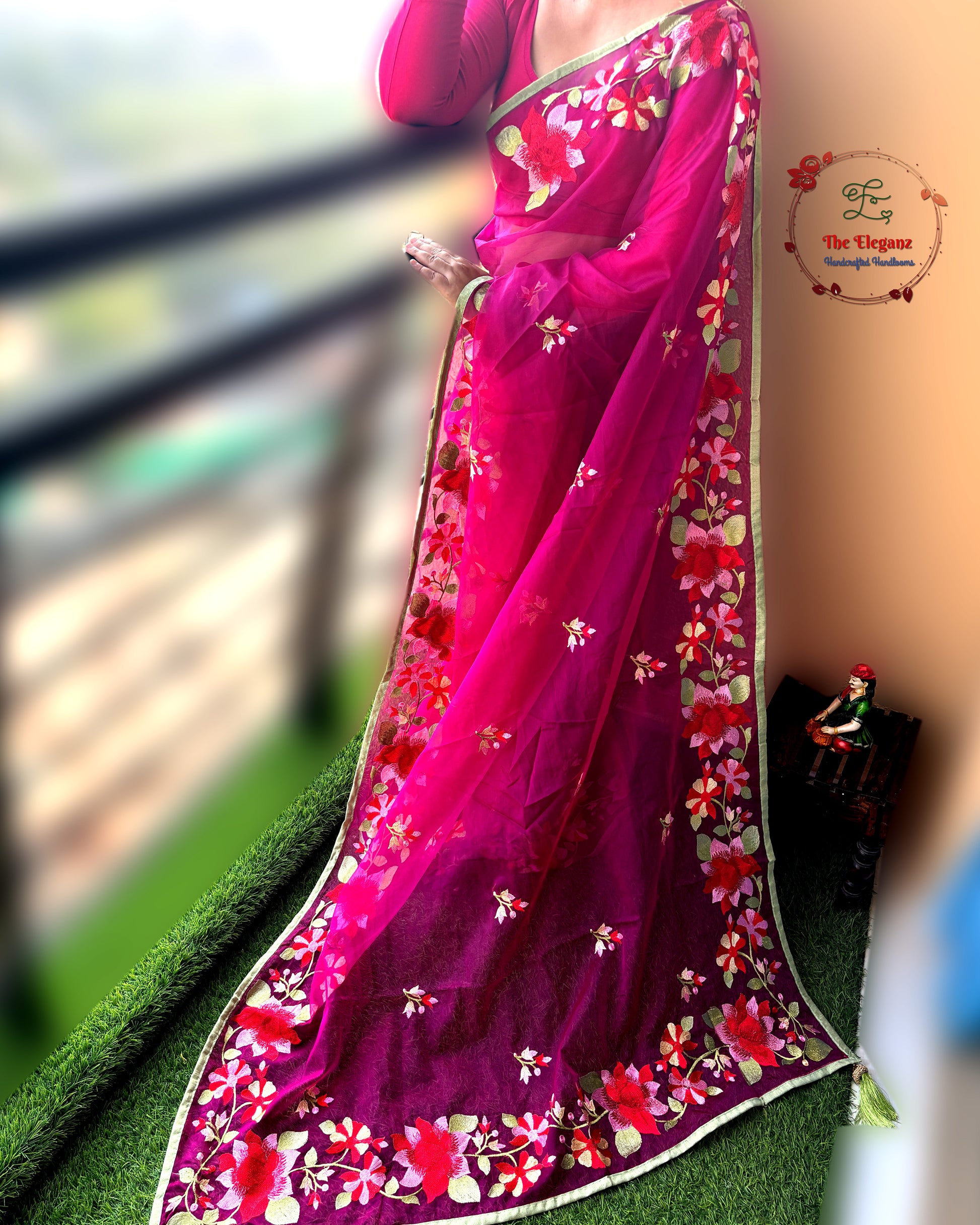 Madhurima — a symphony of blossoms woven into the blush of magenta. This semi-organza saree glows with embroidered flowers that seem to dance on sunlight — vibrant, feminine, and full of festive charm. Airy and luminous, it flows like melody itself — soft, sheer, and irresistibly elegant.