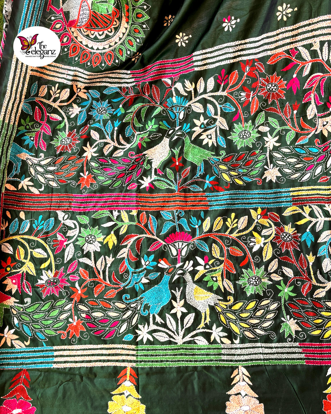 Color: Deep bottle green base with multicolour threadwork