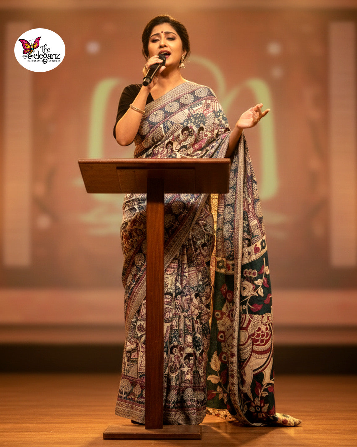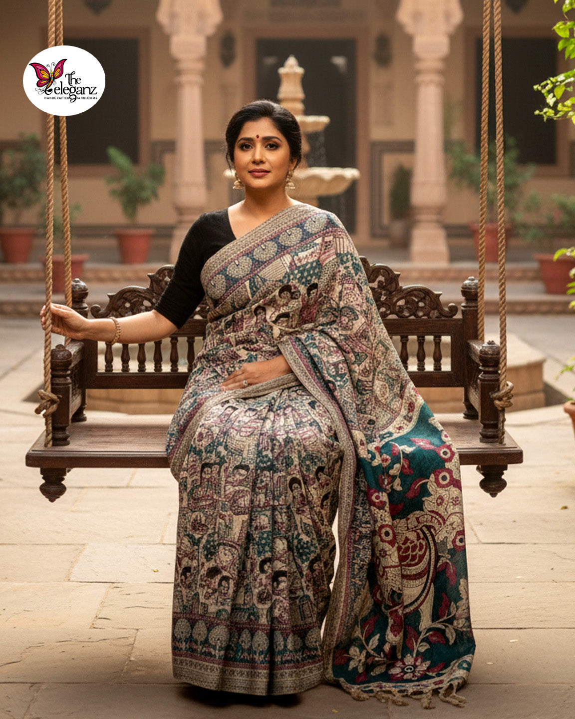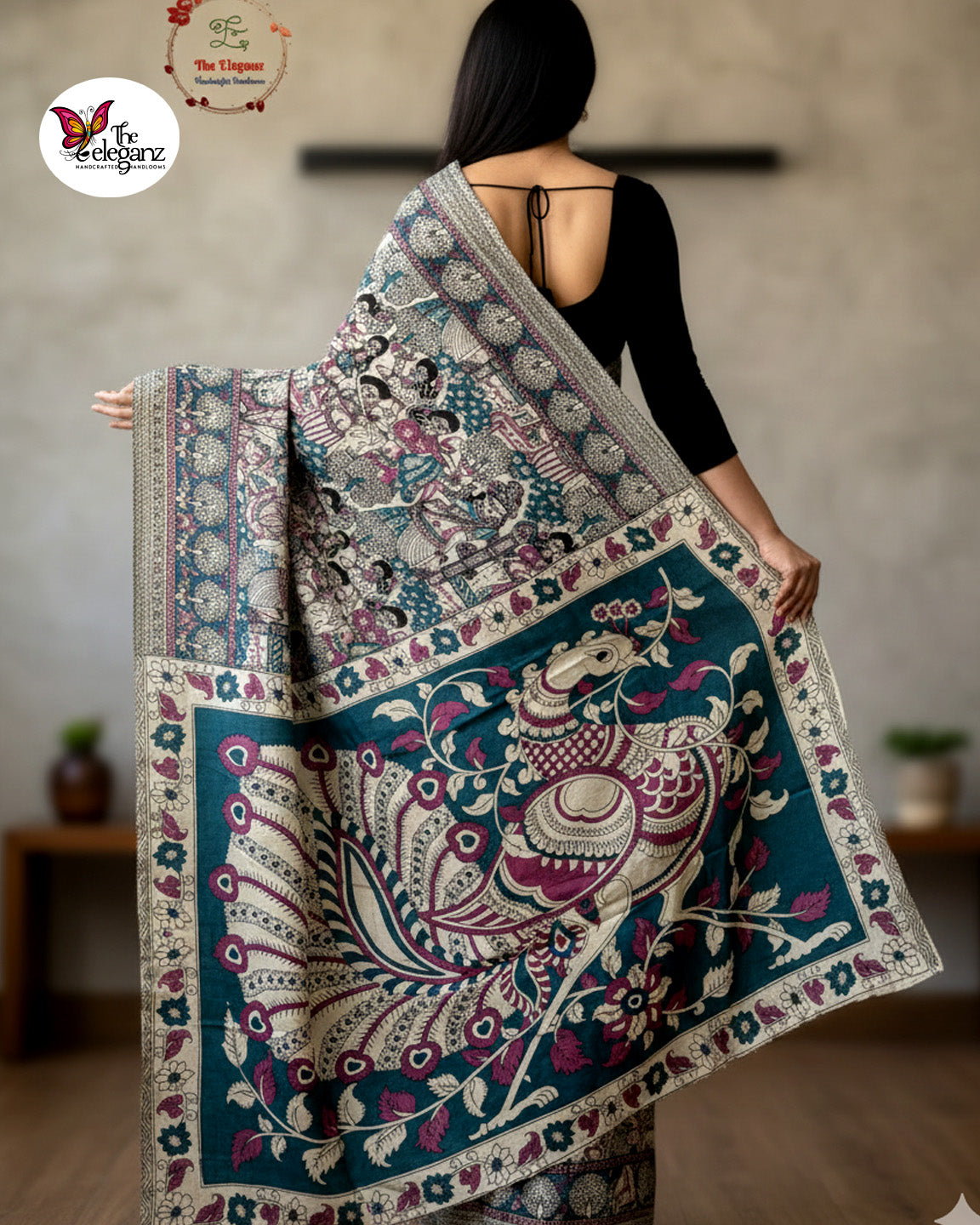 A tribute to the eternal symbol of beauty and pride, Mayurika celebrates the art of Kalamkari through intricate hand-block prints and timeless motifs. Crafted on pure cotton, the saree’s grand peacock pallu is a work of storytelling — surrounded by traditional figurative patterns that bring myth and movement alive. In shades of teal, plum, and cream, this piece blends classic artistry with contemporary poise.