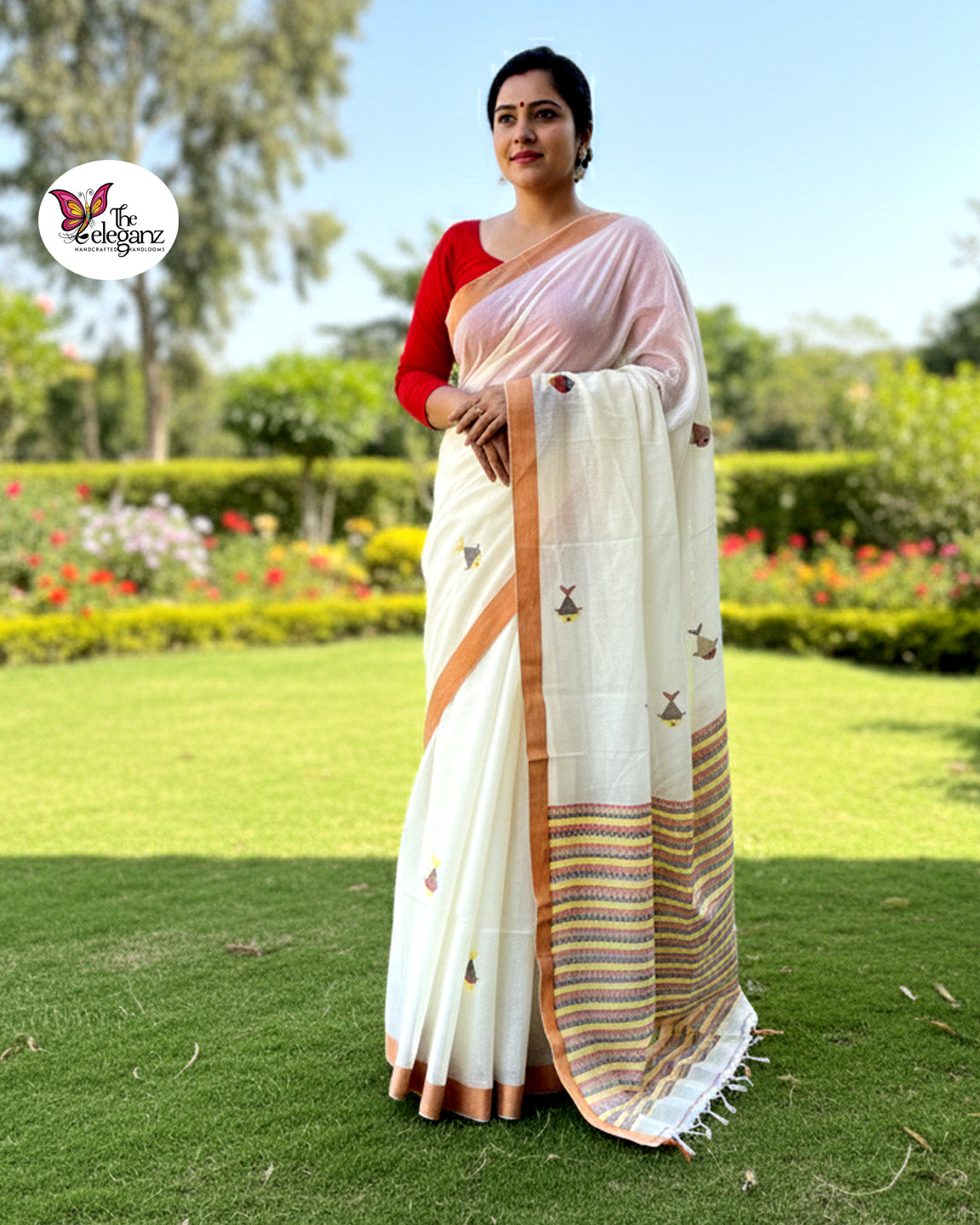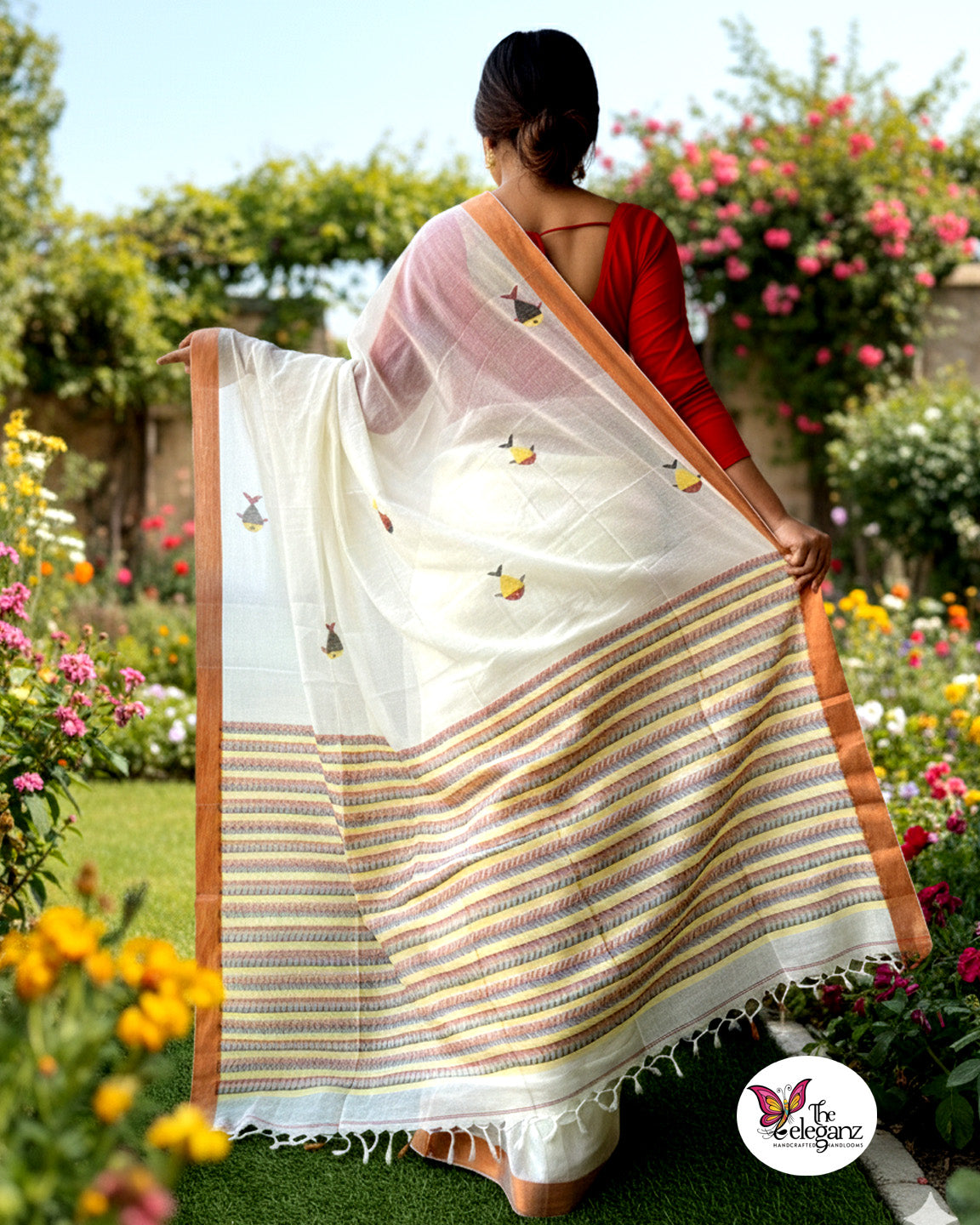A tribute to timeless elegance, Meenakshi celebrates the harmony of tradition and nature. Woven in soft premium cotton, this handloom saree features dainty fish motifs symbolizing prosperity and gentle rhythm. The soothing ivory body, pastel stripes, and subtle peach border evoke the serenity of dawn reflected on water.