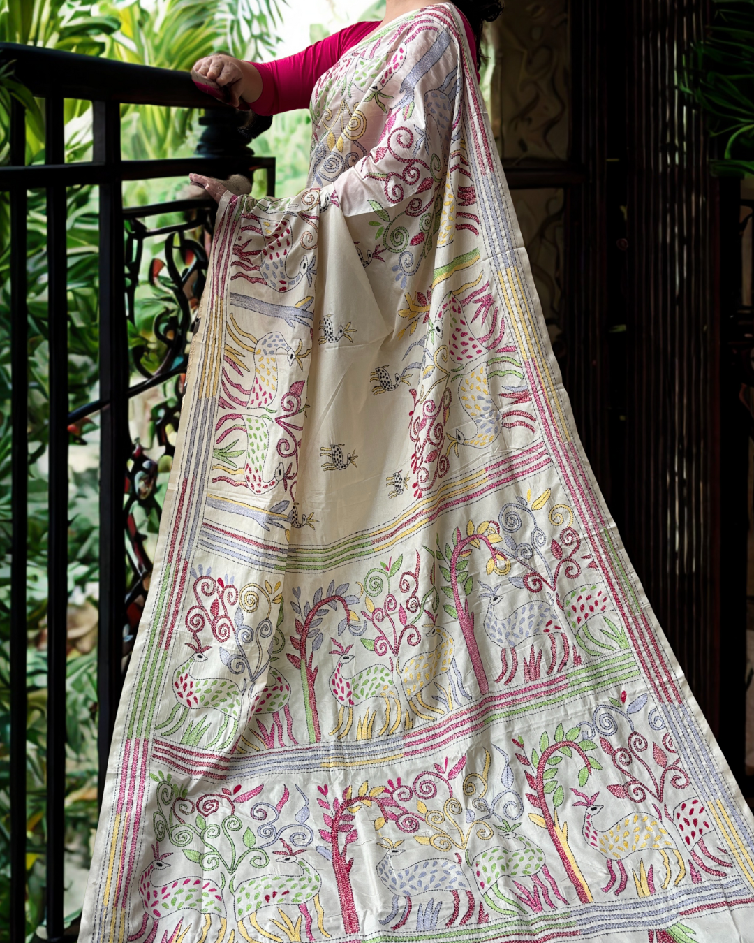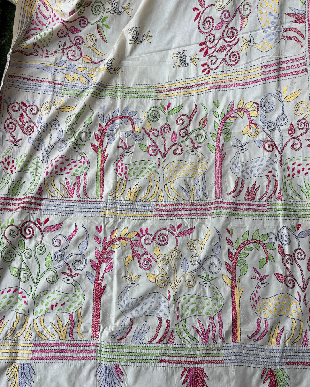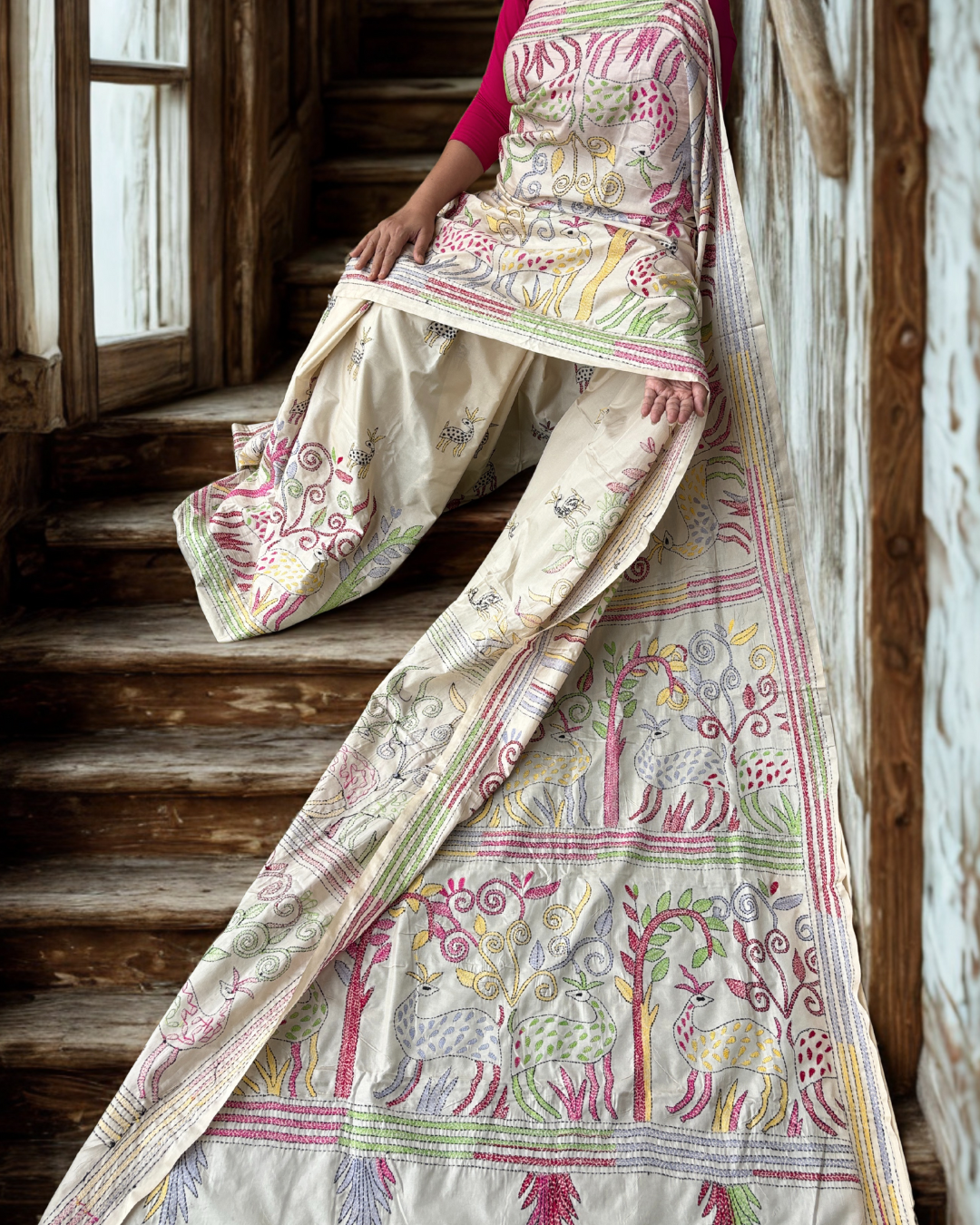 On a canvas of soft ivory, a woodland comes alive — graceful deer roam amidst swirling vines and blossoming trees, stitched lovingly in rainbow hues. Each Kantha thread tells a story of nature’s serenity, where the innocence of the deer (Mrig) meets the playful vibrance of hand embroidery. Mrigāvali is a celebration of forests, freedom, and folklore, draped in timeless elegance.