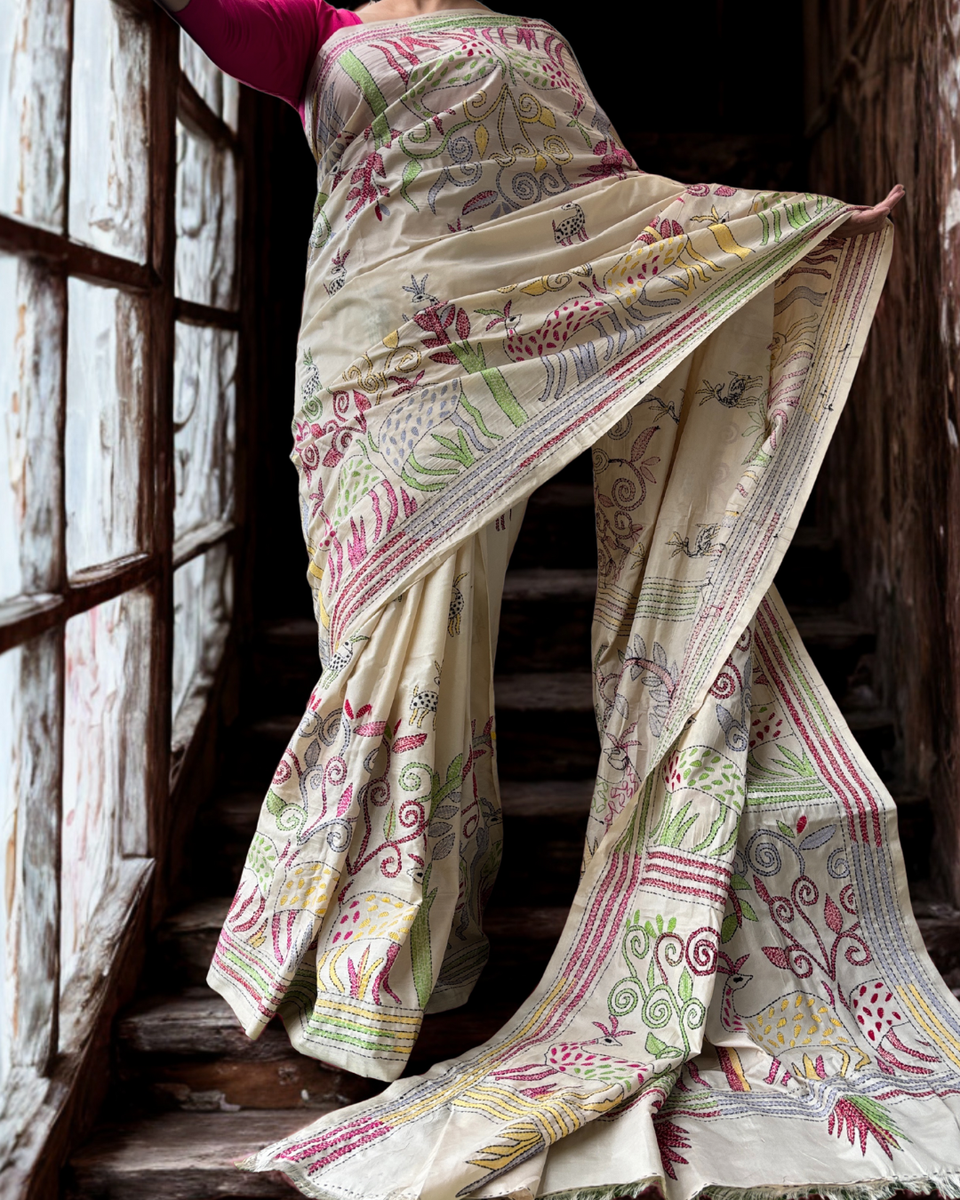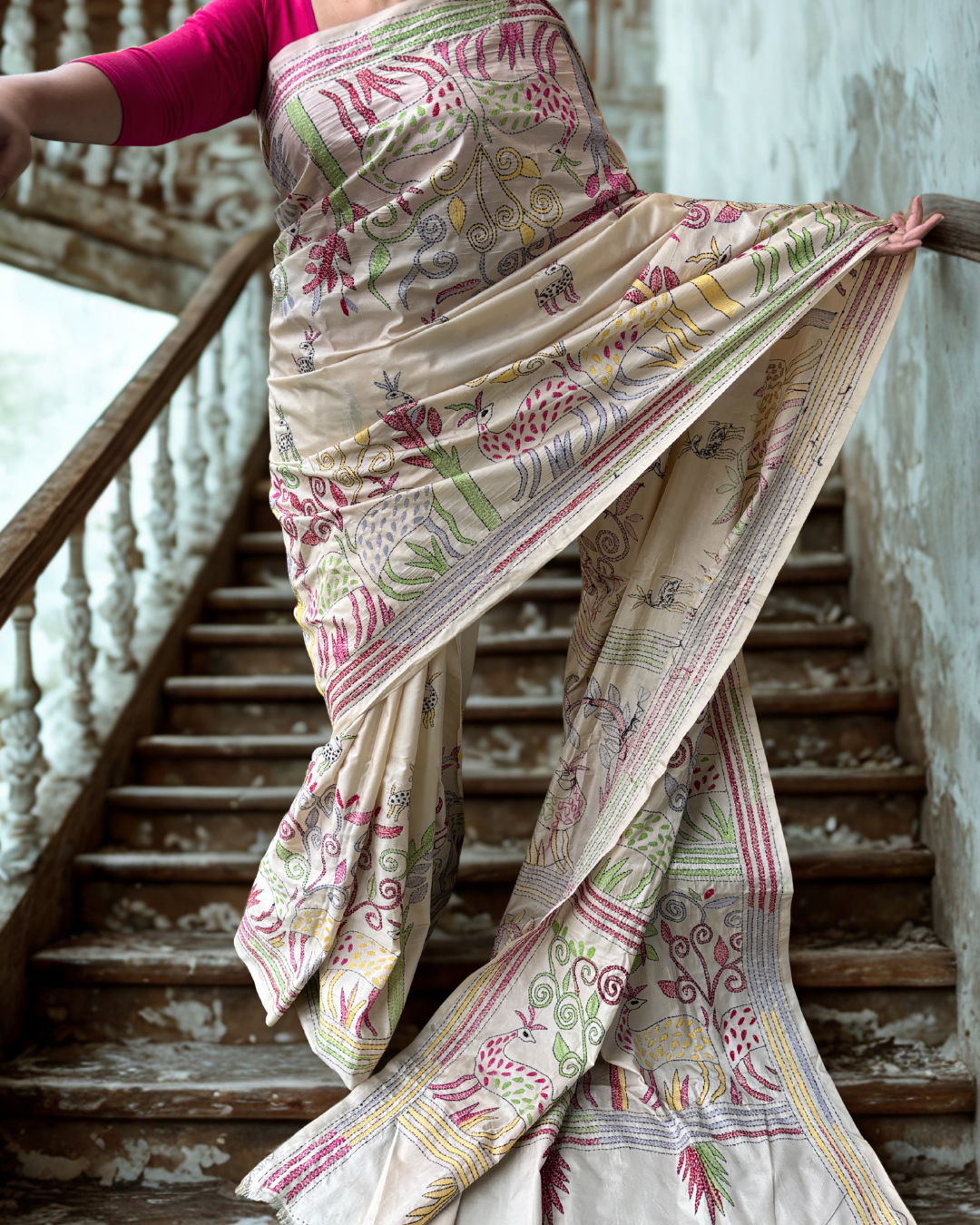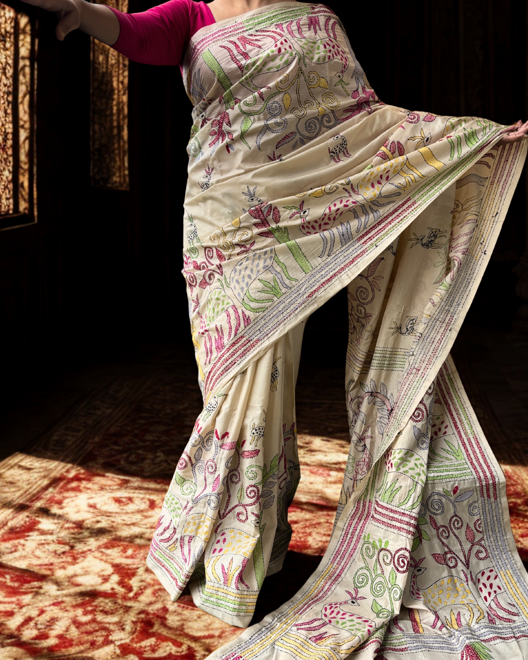 On a canvas of soft ivory, a woodland comes alive — graceful deer roam amidst swirling vines and blossoming trees, stitched lovingly in rainbow hues. Each Kantha thread tells a story of nature’s serenity, where the innocence of the deer (Mrig) meets the playful vibrance of hand embroidery. Mrigāvali is a celebration of forests, freedom, and folklore, draped in timeless elegance.