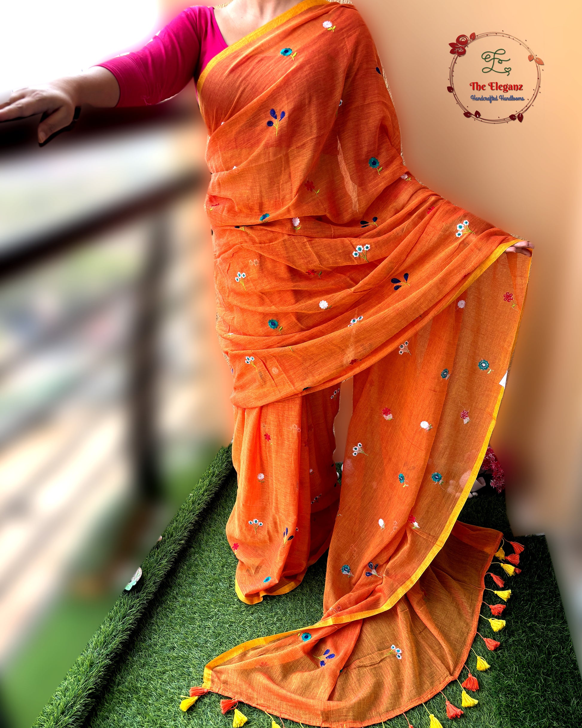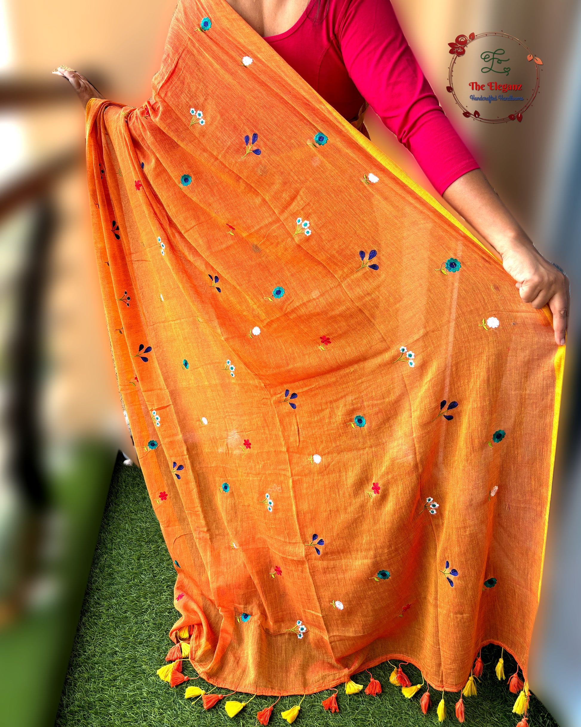 A meadow in motion, lemony green sprinkled with hand-embroidered blooms and kissed with fuchsia tassels.