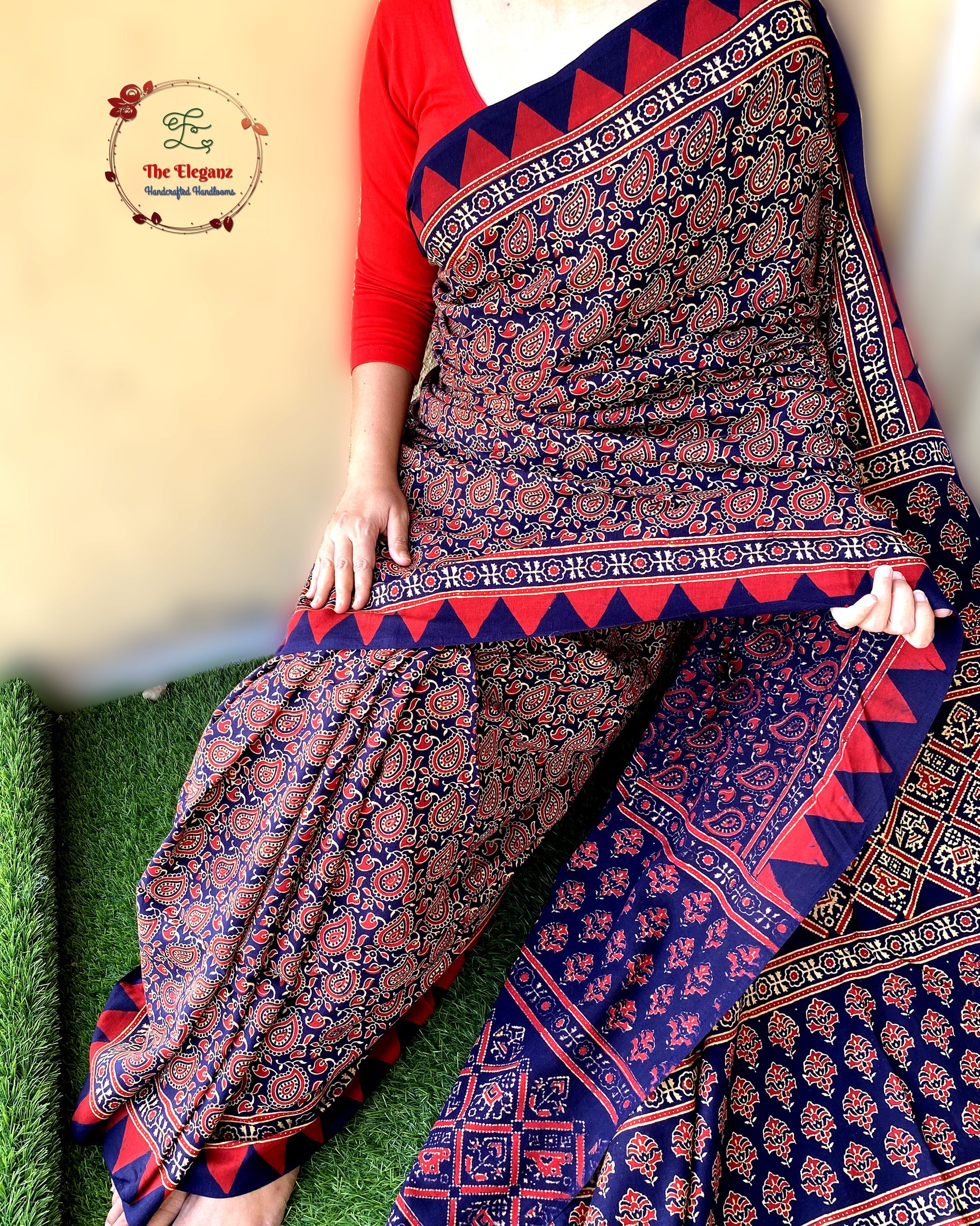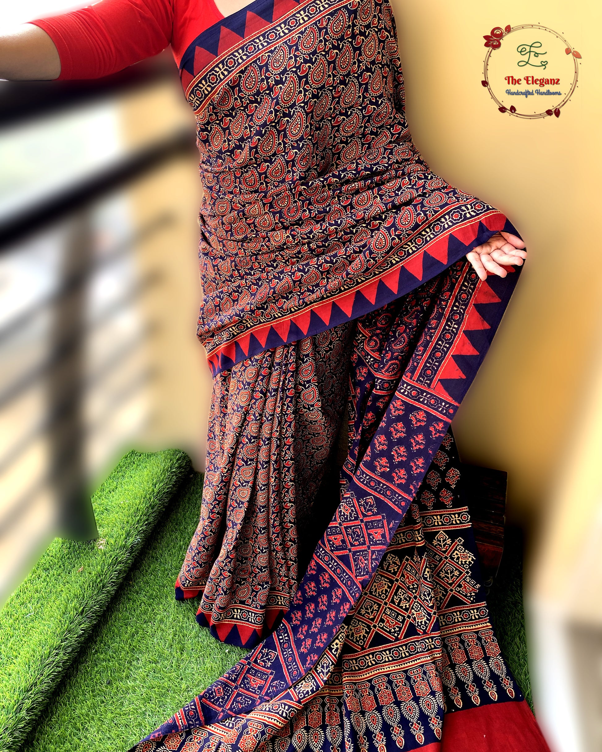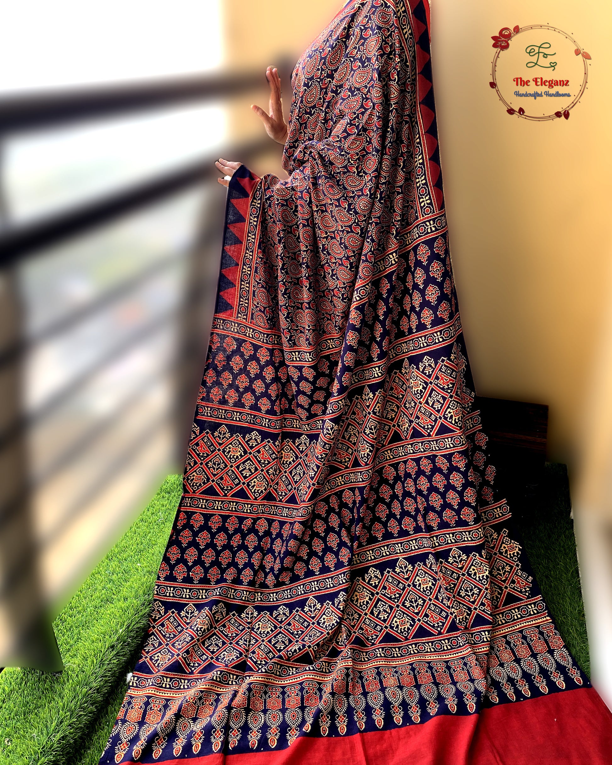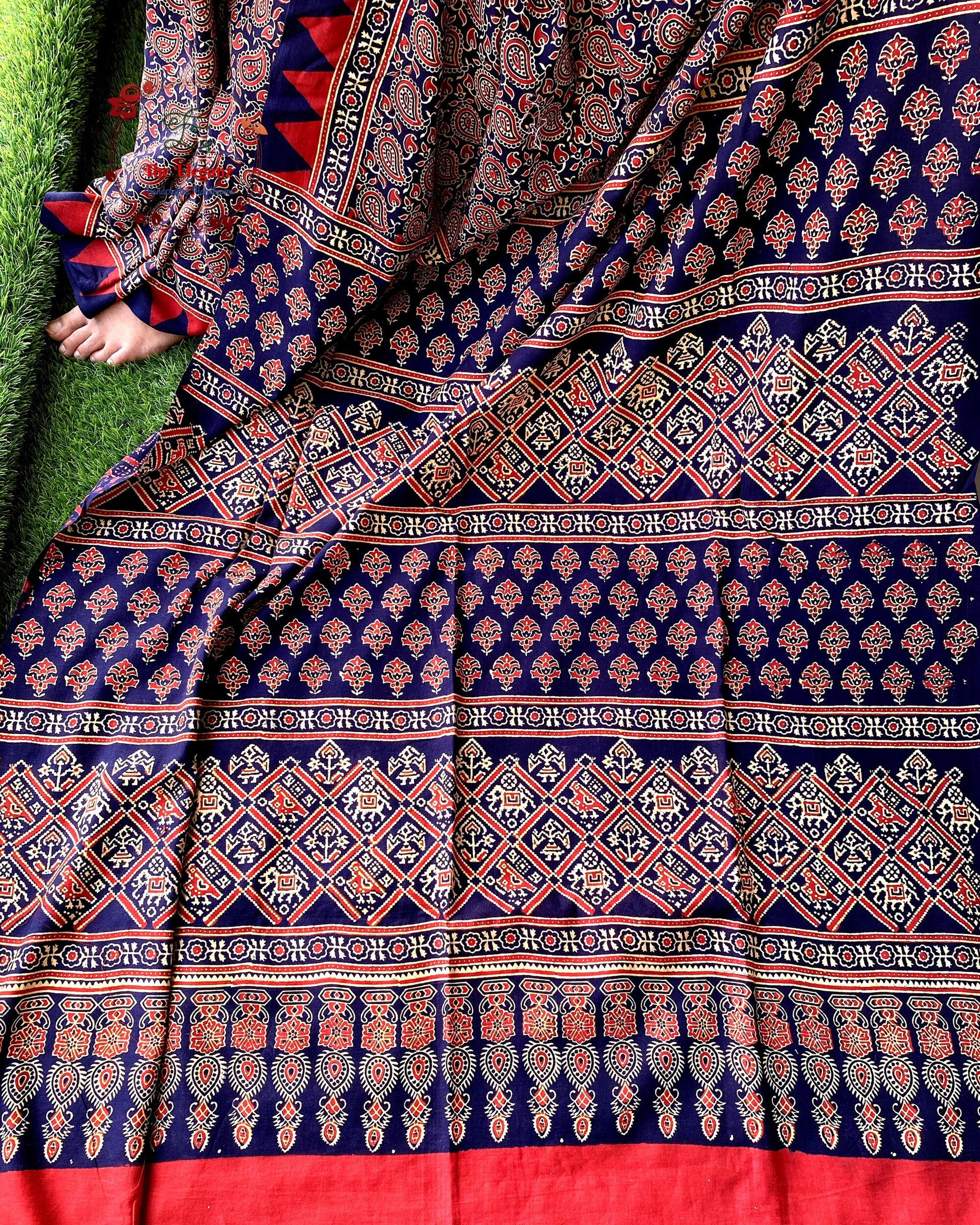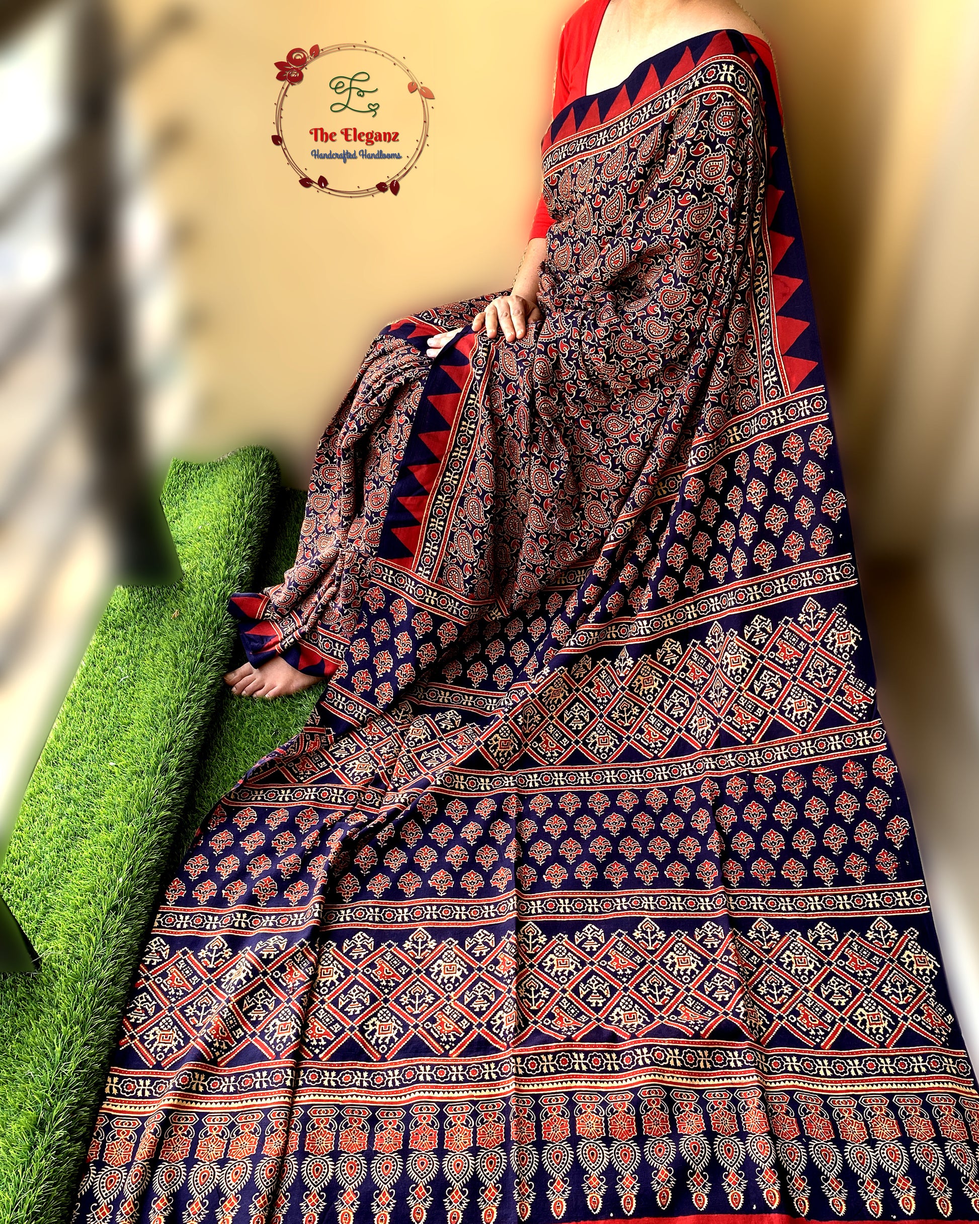 This saree is crafted using natural dyes and hand block printing. Slight irregularities in motifs or dye patches are natural and a hallmark of genuine Ajrakh work, not defects. Actual colors may vary slightly due to lighting and screen resolution.