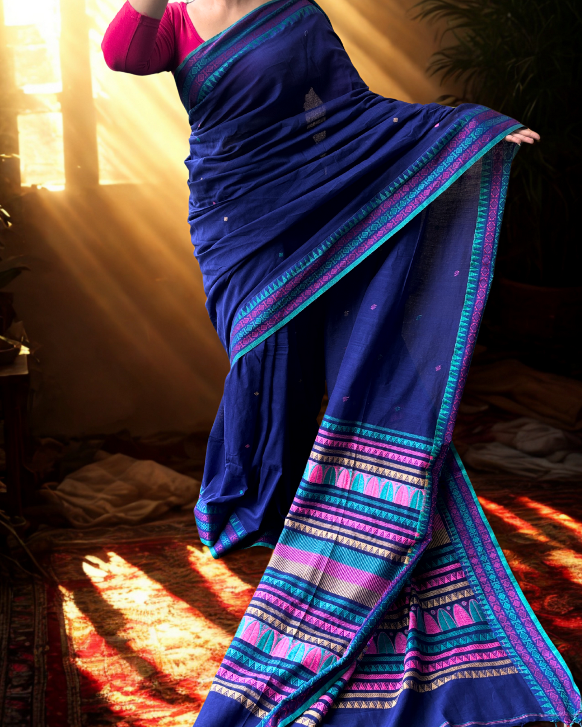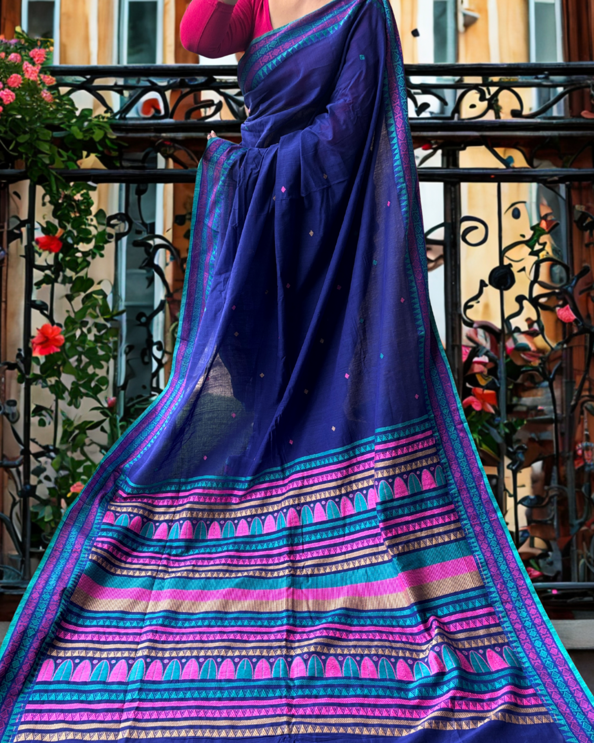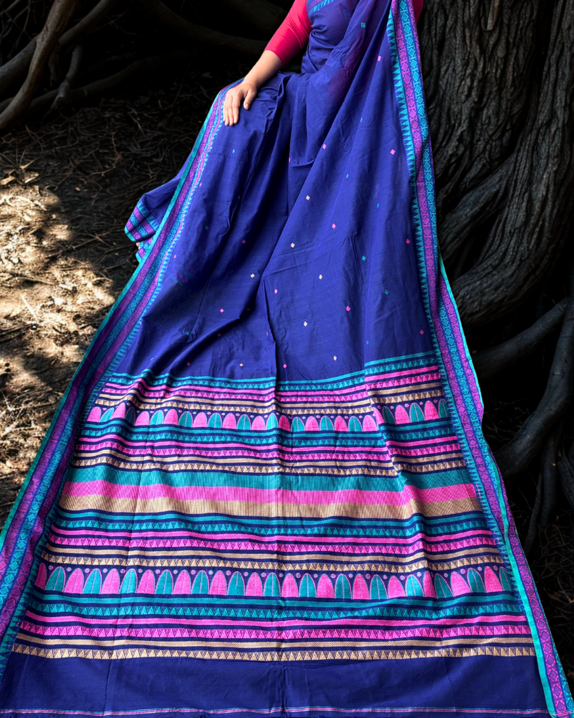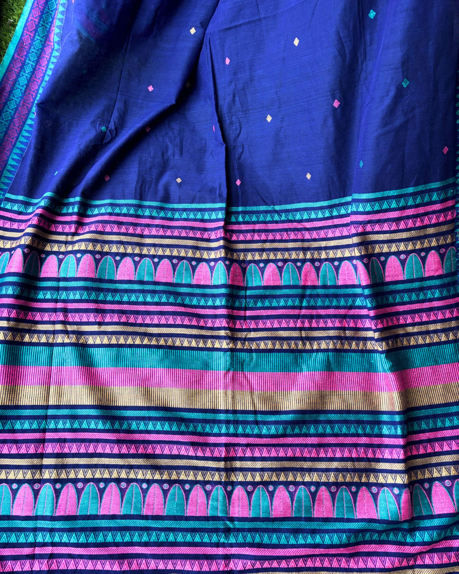 Deep royal blue woven with teal, pink, and golden patterns, like temple arches under a midnight sky