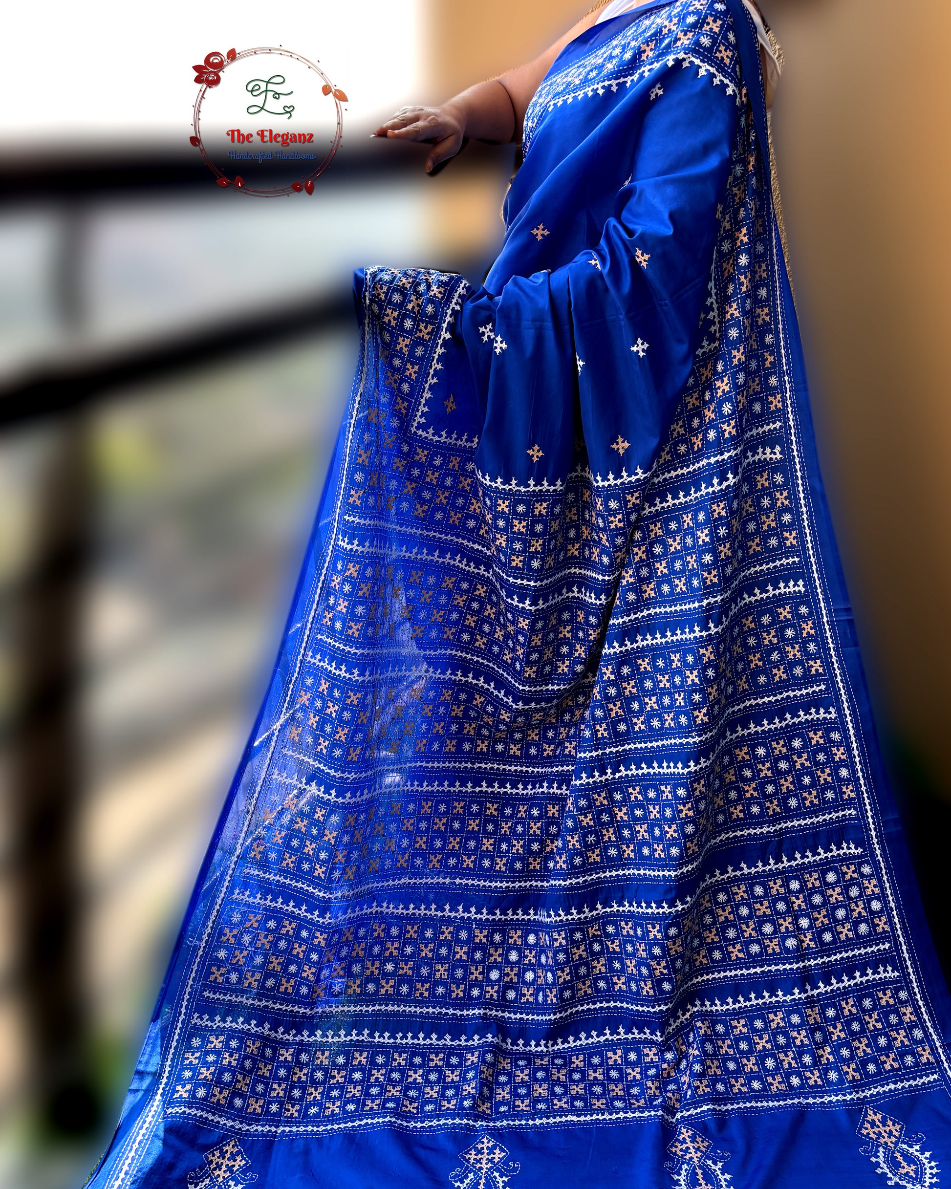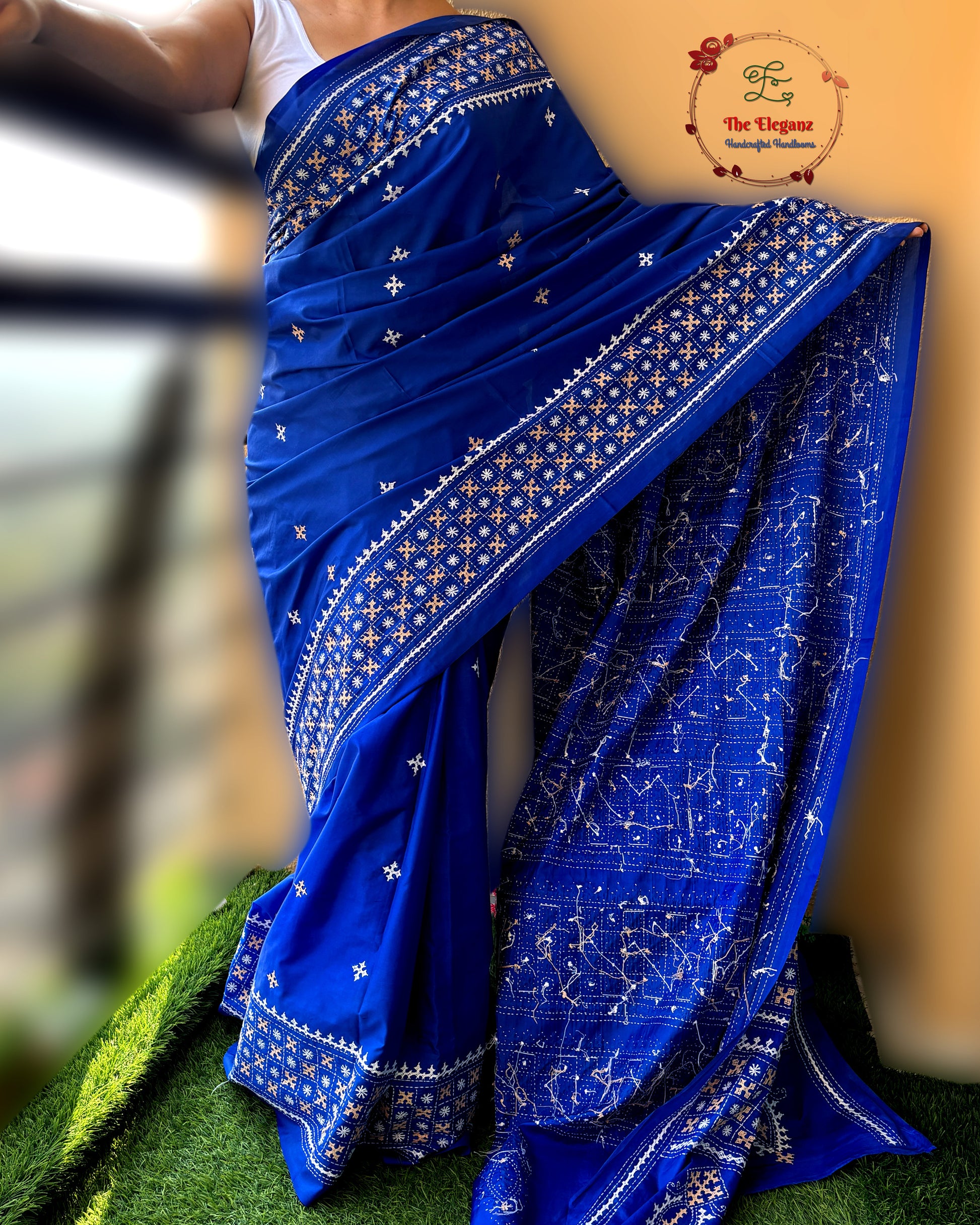 Royal blue scattered with Gujarati stitch patterns, like a star-studded night sky in geometric symmetry.