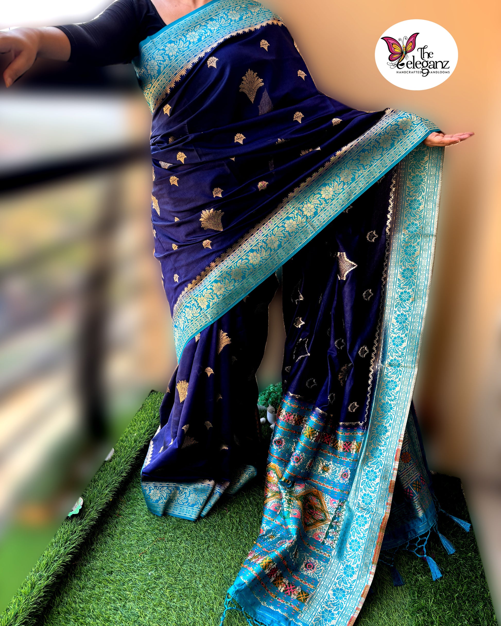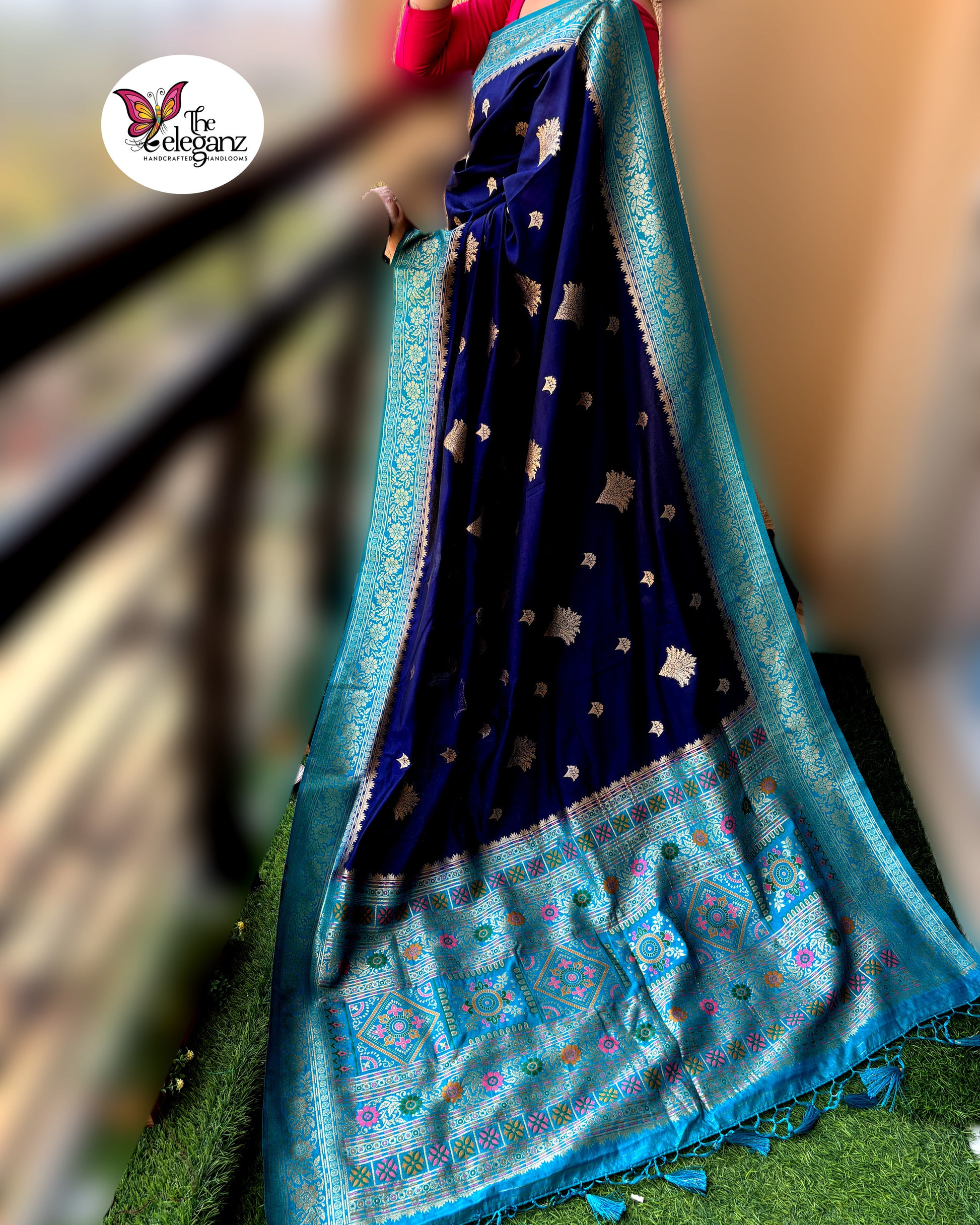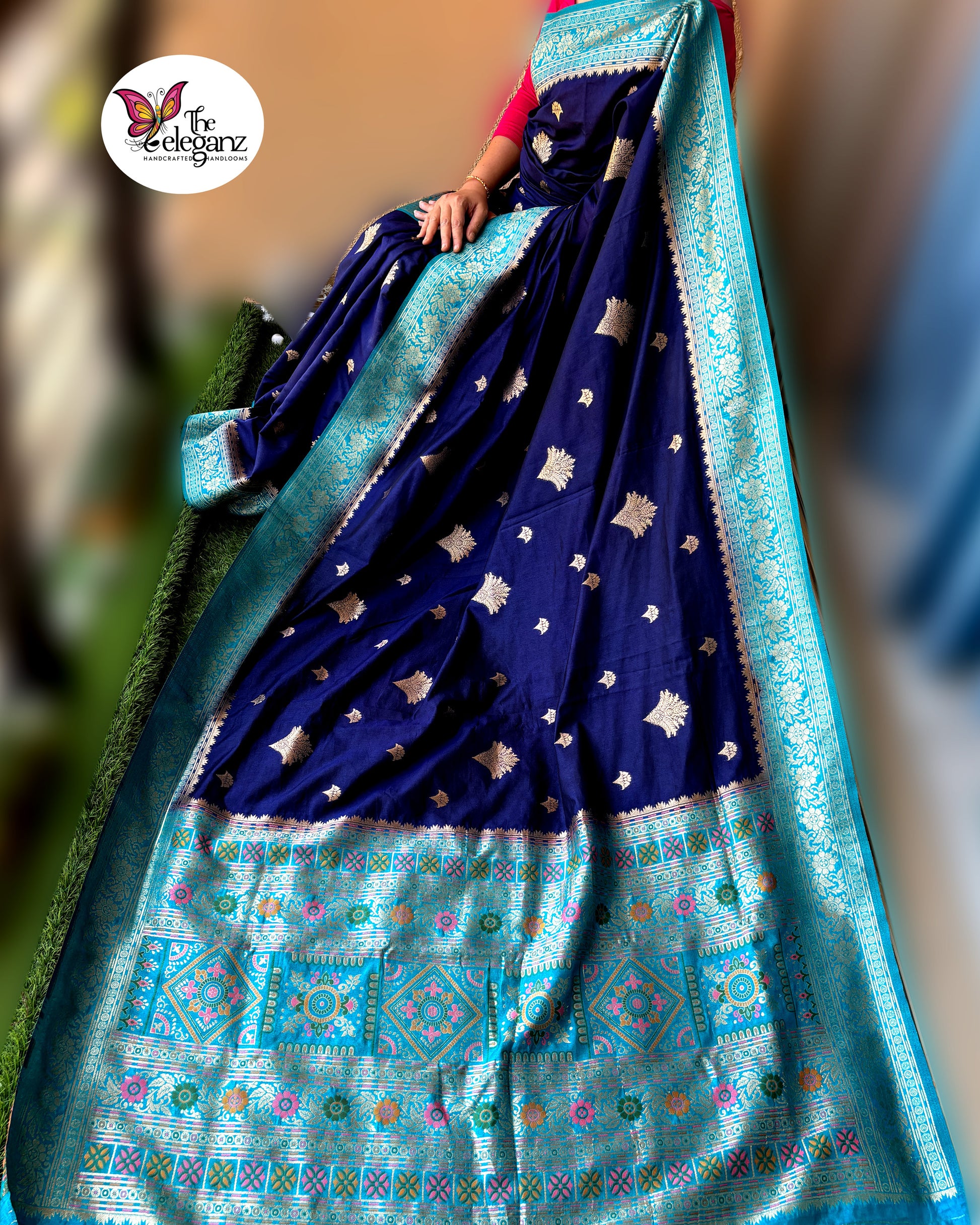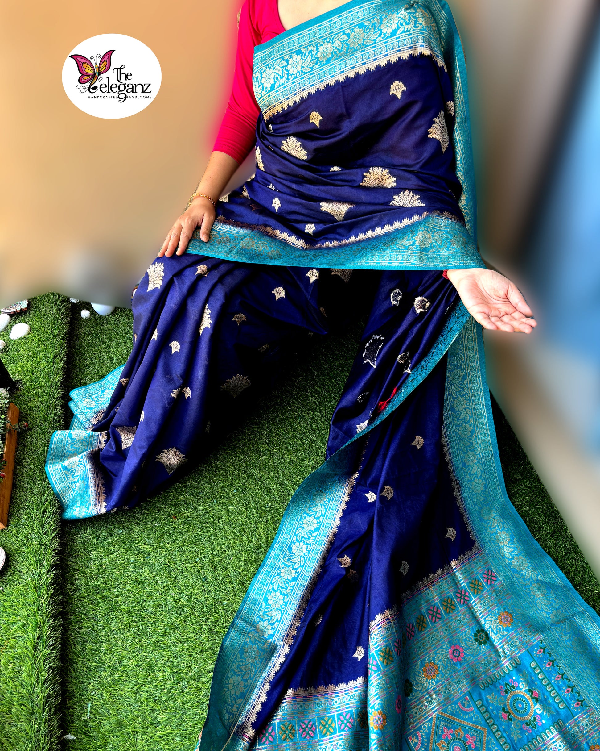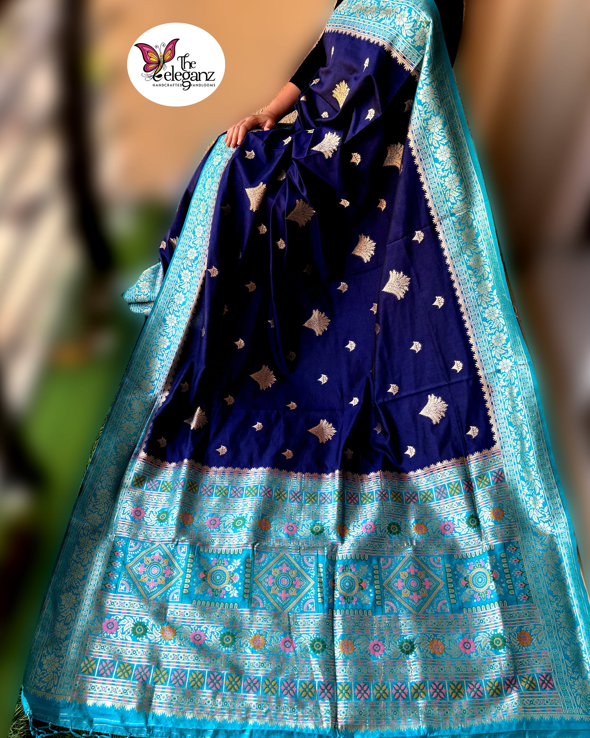 “Neelanjali” – a tribute to the ocean’s depth and the bloom of devotion. This navy blue and turquoise Orissa soft silk saree shimmers with intricate temple-inspired motifs, highlighted by vibrant pink and green accents. A weave that celebrates tradition with a touch of modern vibrance.